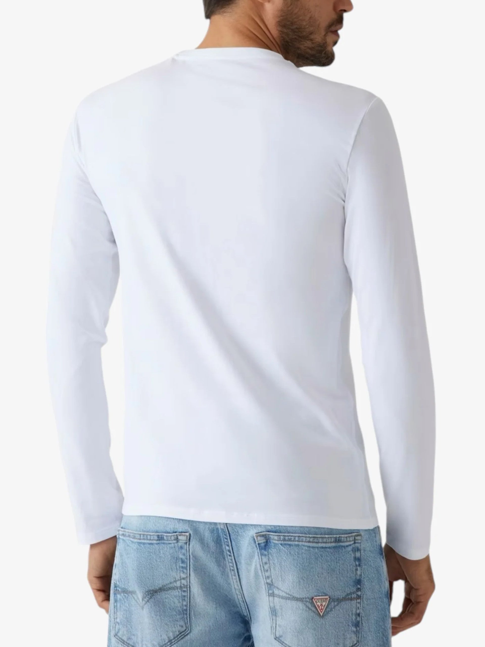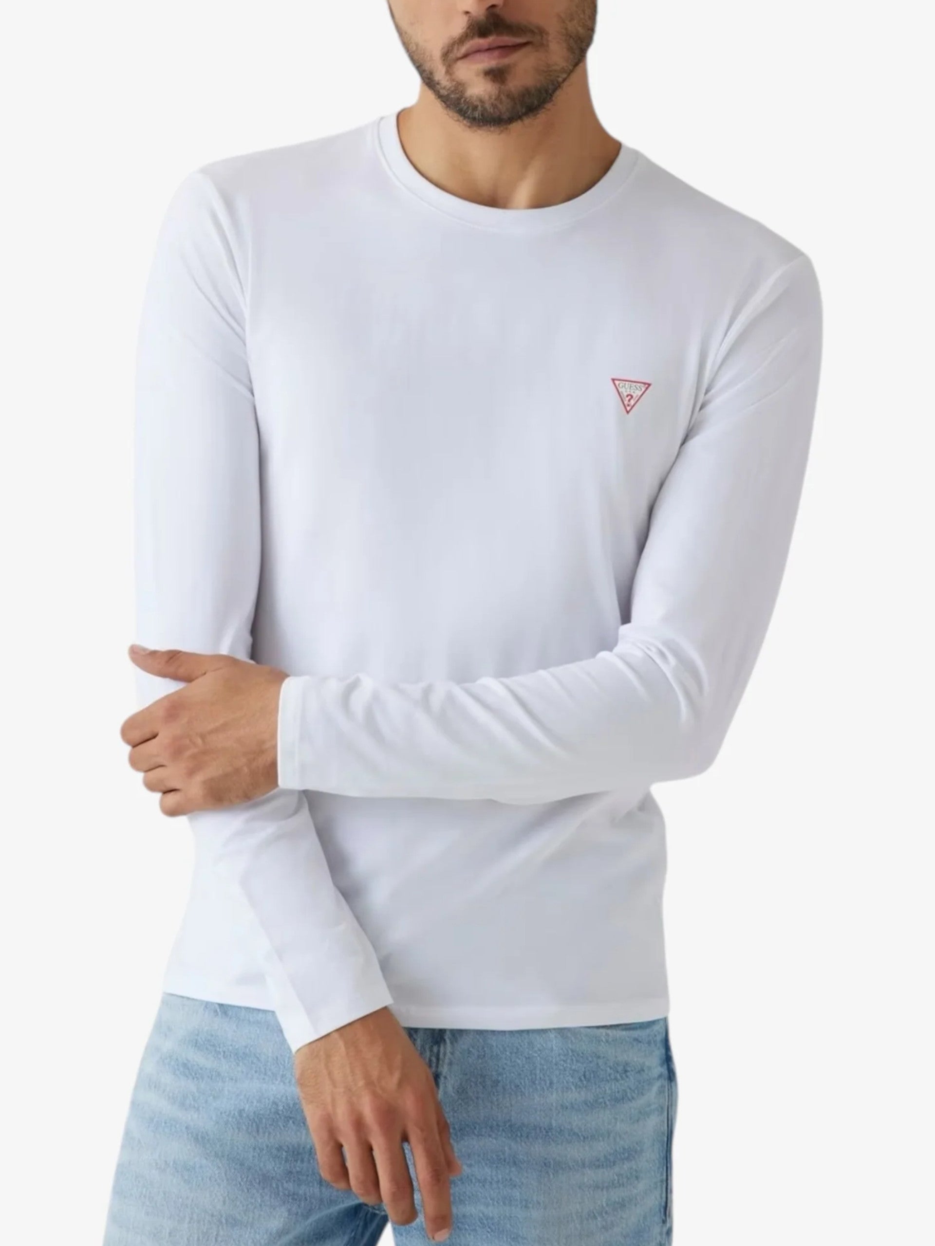 Maglia Guess bianca da uomo con logo M2YI28J1314, realizzata in morbido cotone a tinta unita. Questa maglia Guess bianca ha il girocollo, le maniche lunghe, il fondo regolare e il logo del brand sul cuore a contrasto colore.