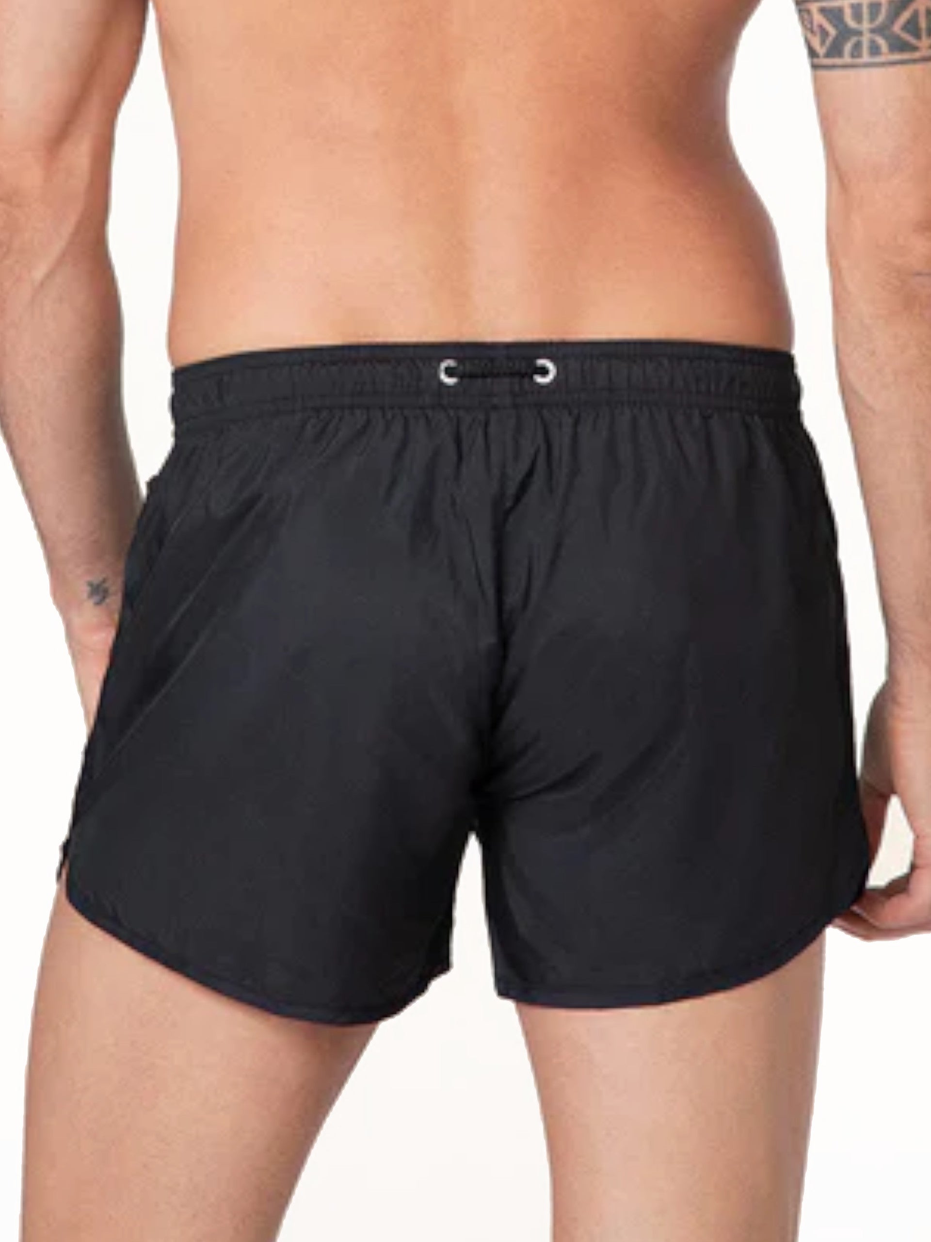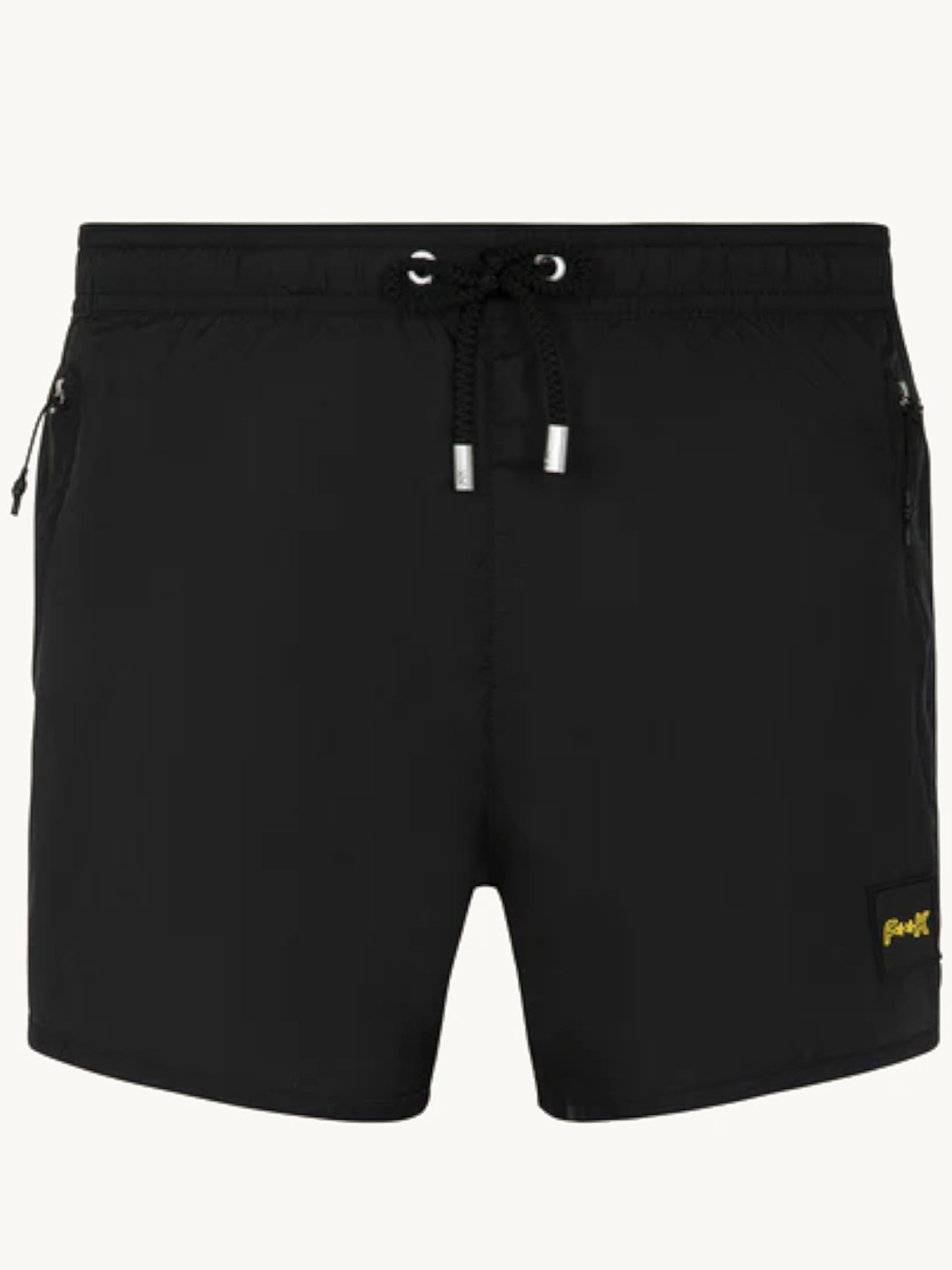 Costume mare Effek nero da uomo patch gommato M01BU03, realizzato in tessuto in grado di asciugarsi in pochissimi minuti. Questo costume F**K nero ha la banda elastica sul punto vita regolabile con laccetti, la retina interna traforata, due tasche laterali con zip e il patch Effek applicato sul fondo.