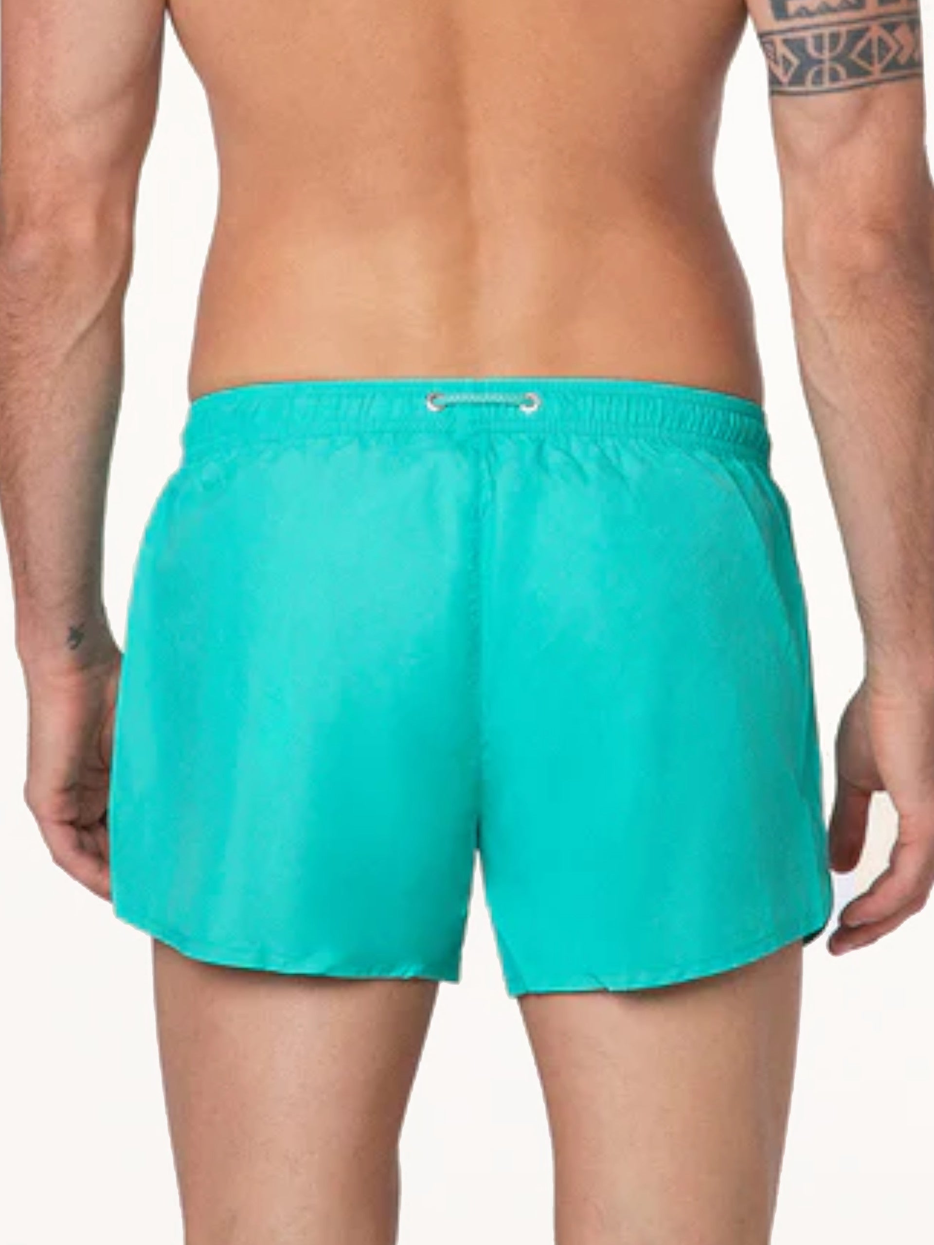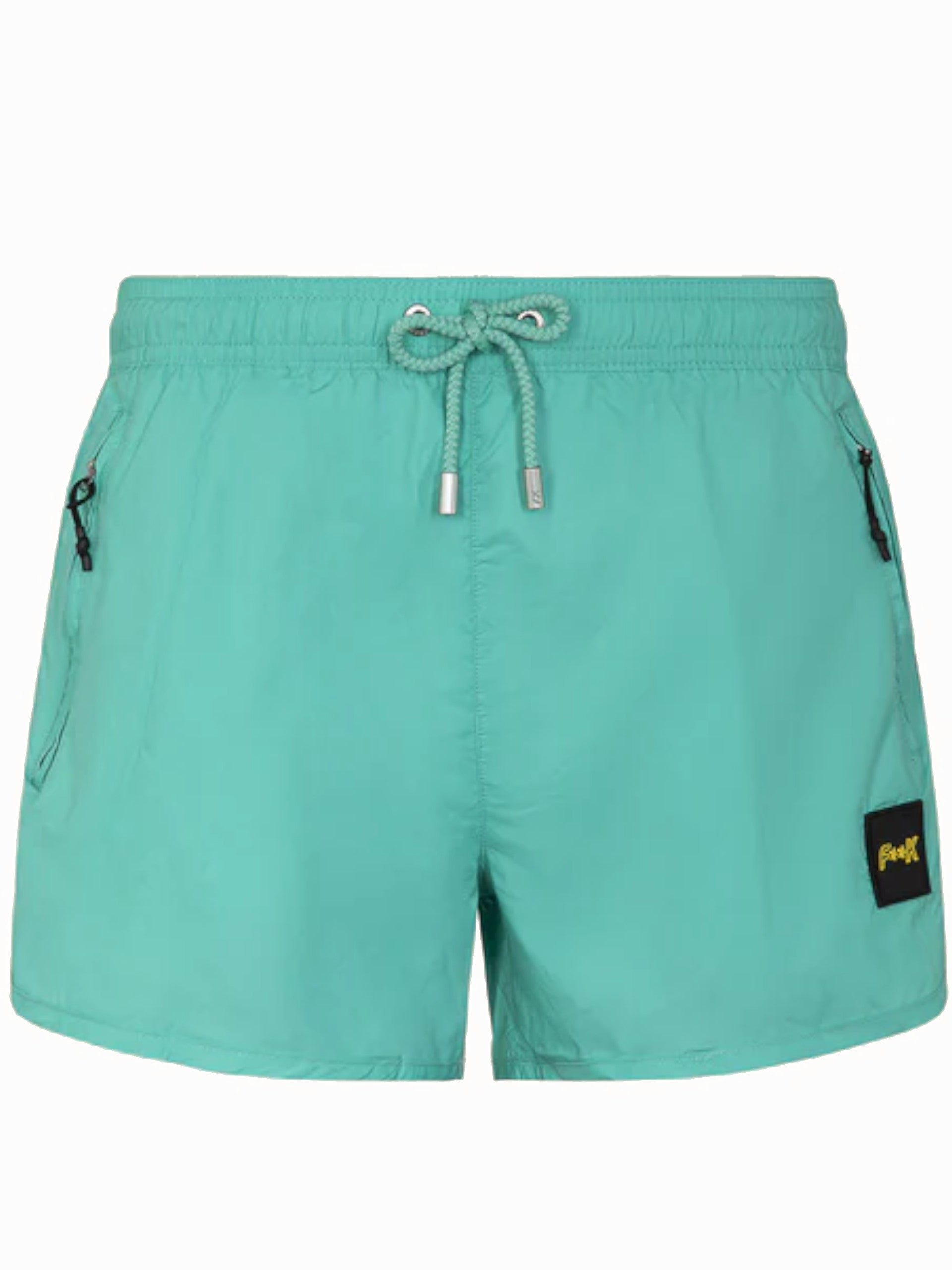 Costume mare Effek verde acqua da uomo patch gommato M01BU03, realizzato in tessuto in grado di asciugarsi in pochissimi minuti. Questo costume F**K verde ha la banda elastica sul punto vita regolabile con laccetti, la retina interna traforata, due tasche laterali con zip e il patch Effek applicato sul fondo.