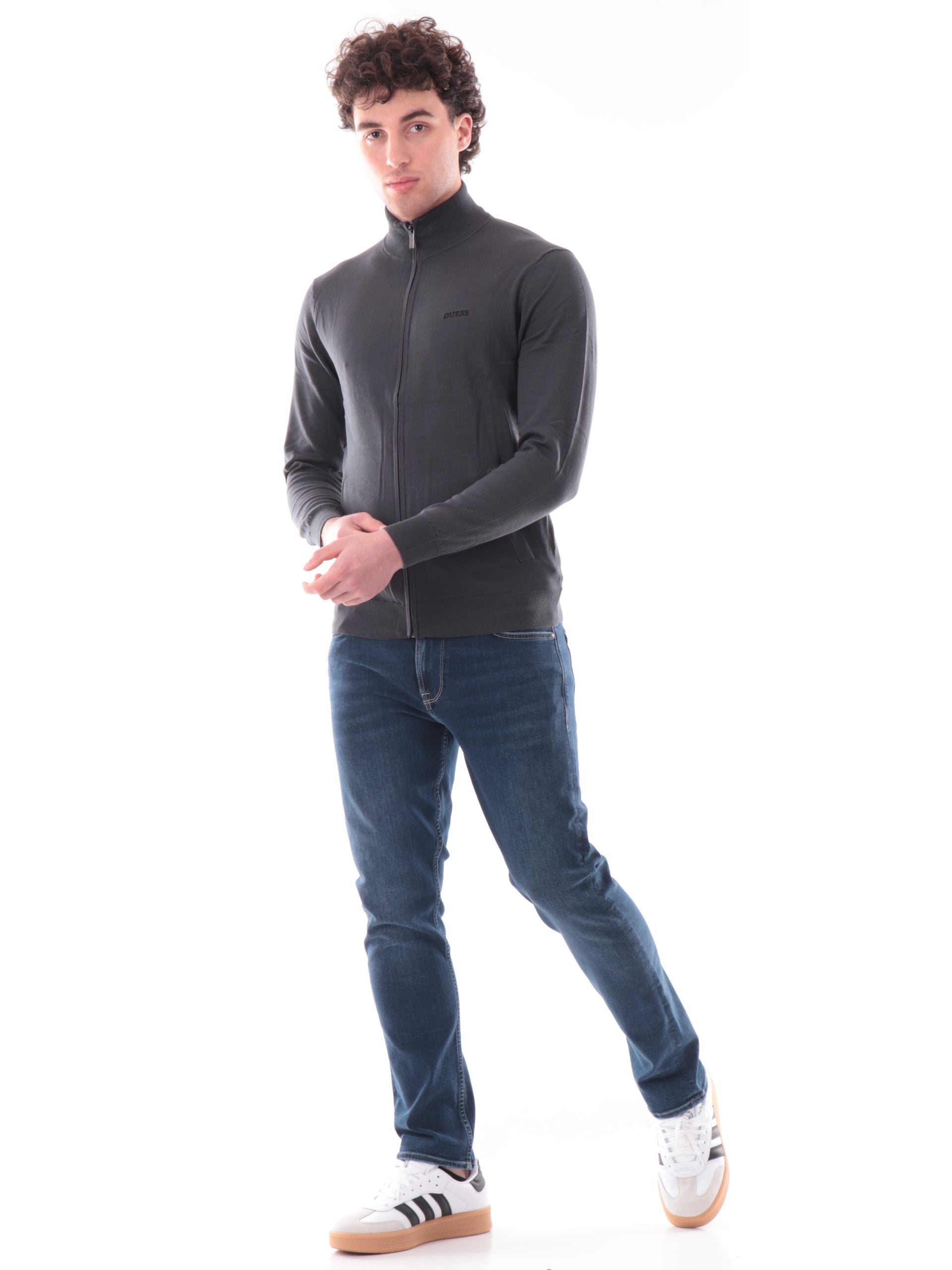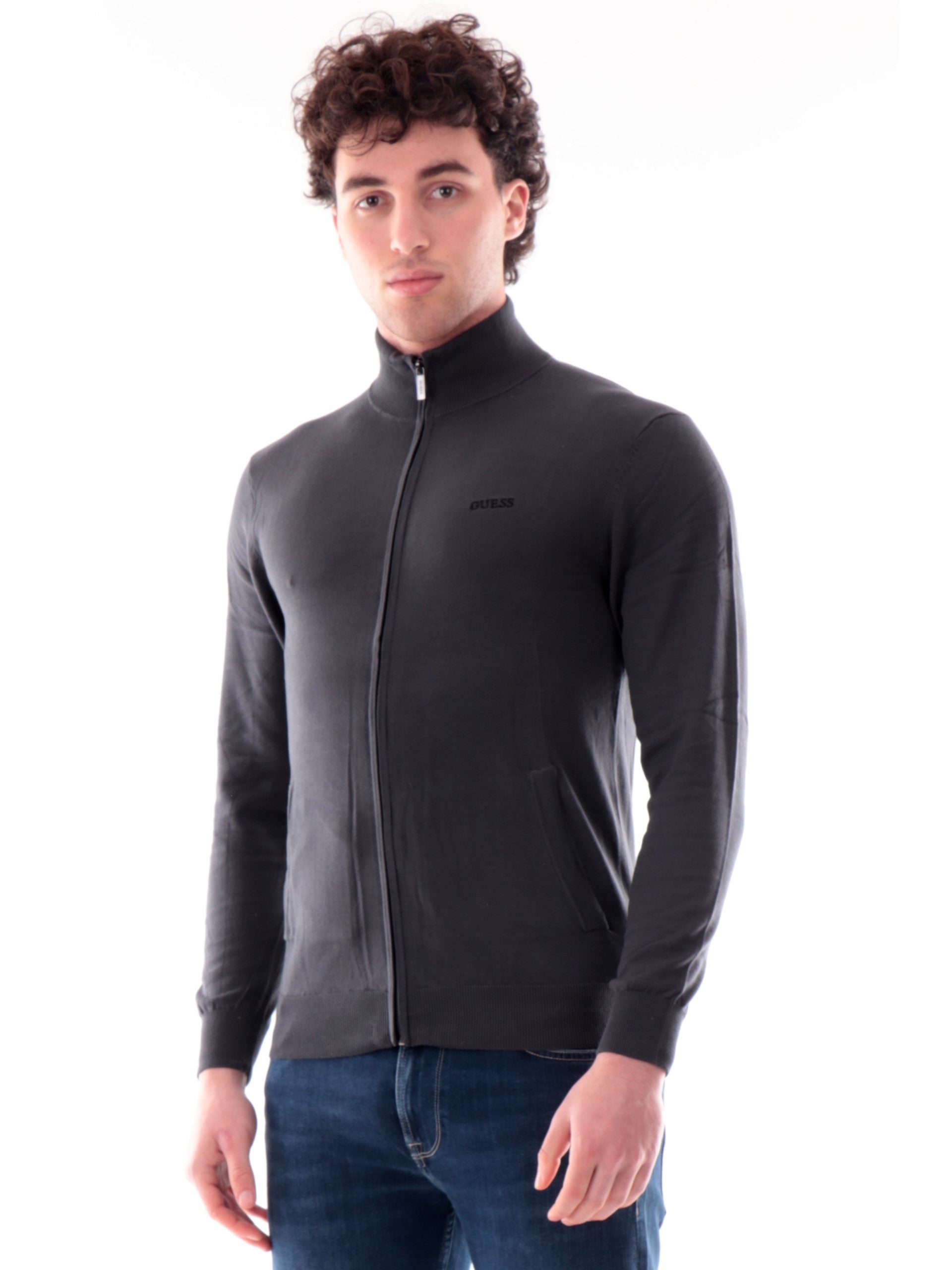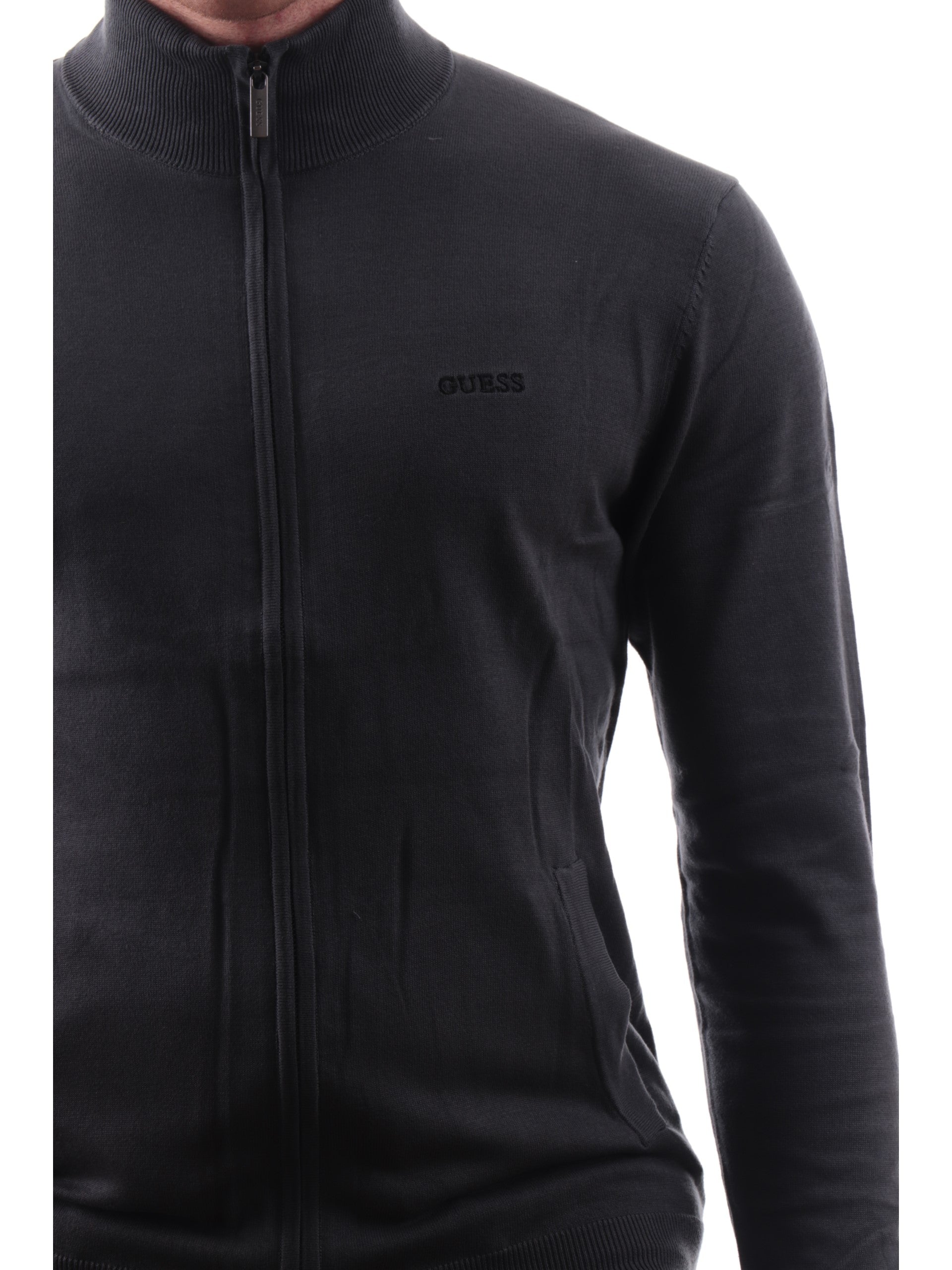 Cardigan Guess grigiio da uomo Kaliq Logo Embro. Questo cardigan Guess, realizzato 100% puro cotone, è caratterizzato dalla chiusura full zip, due tasche laterali aperte, logo del brand ricamato a lato cuore, polsini e fondo elasticizzato a costine. Questo cardigan da uomo grigio è perfetto per la stagione primavera-estate