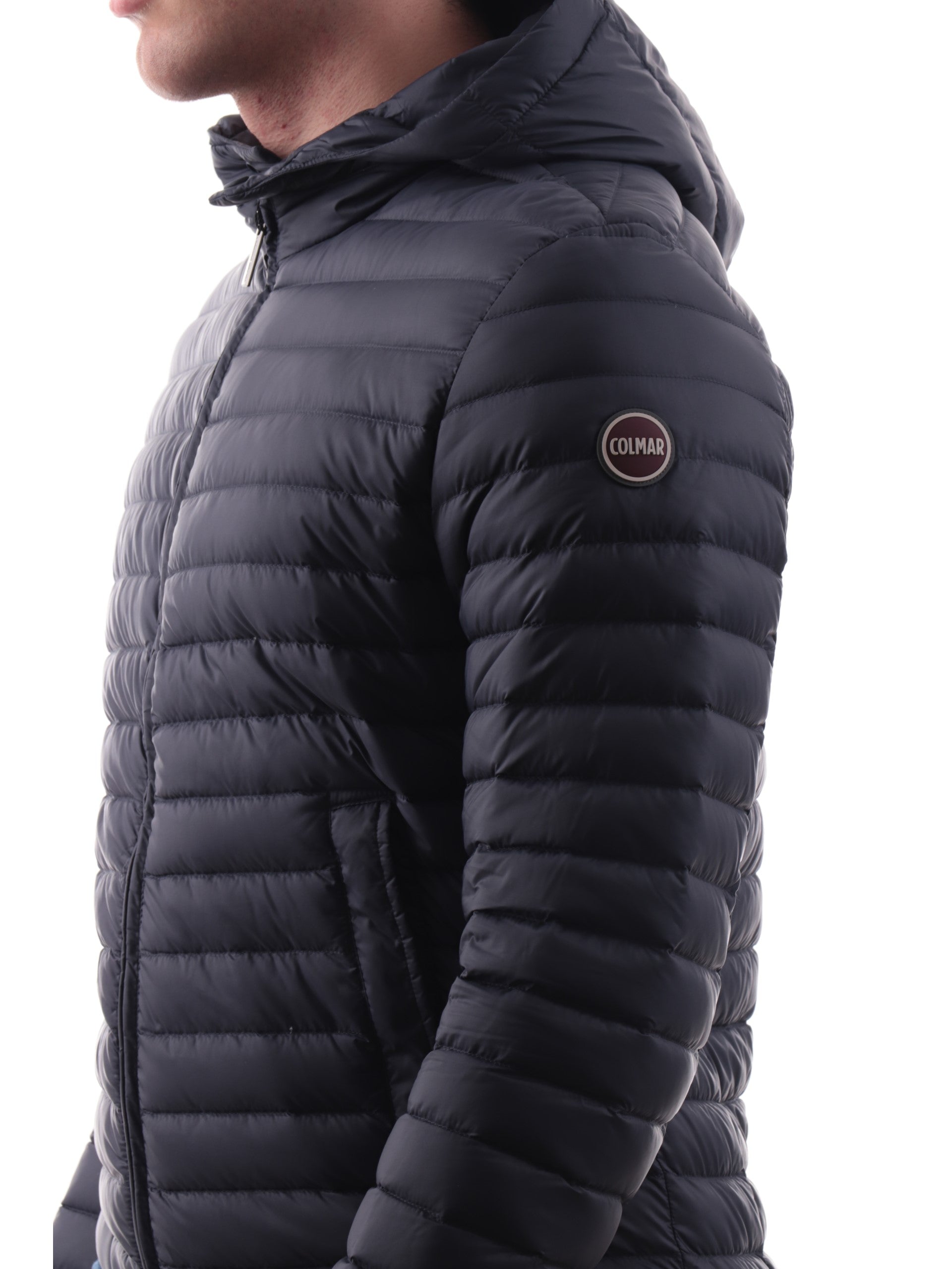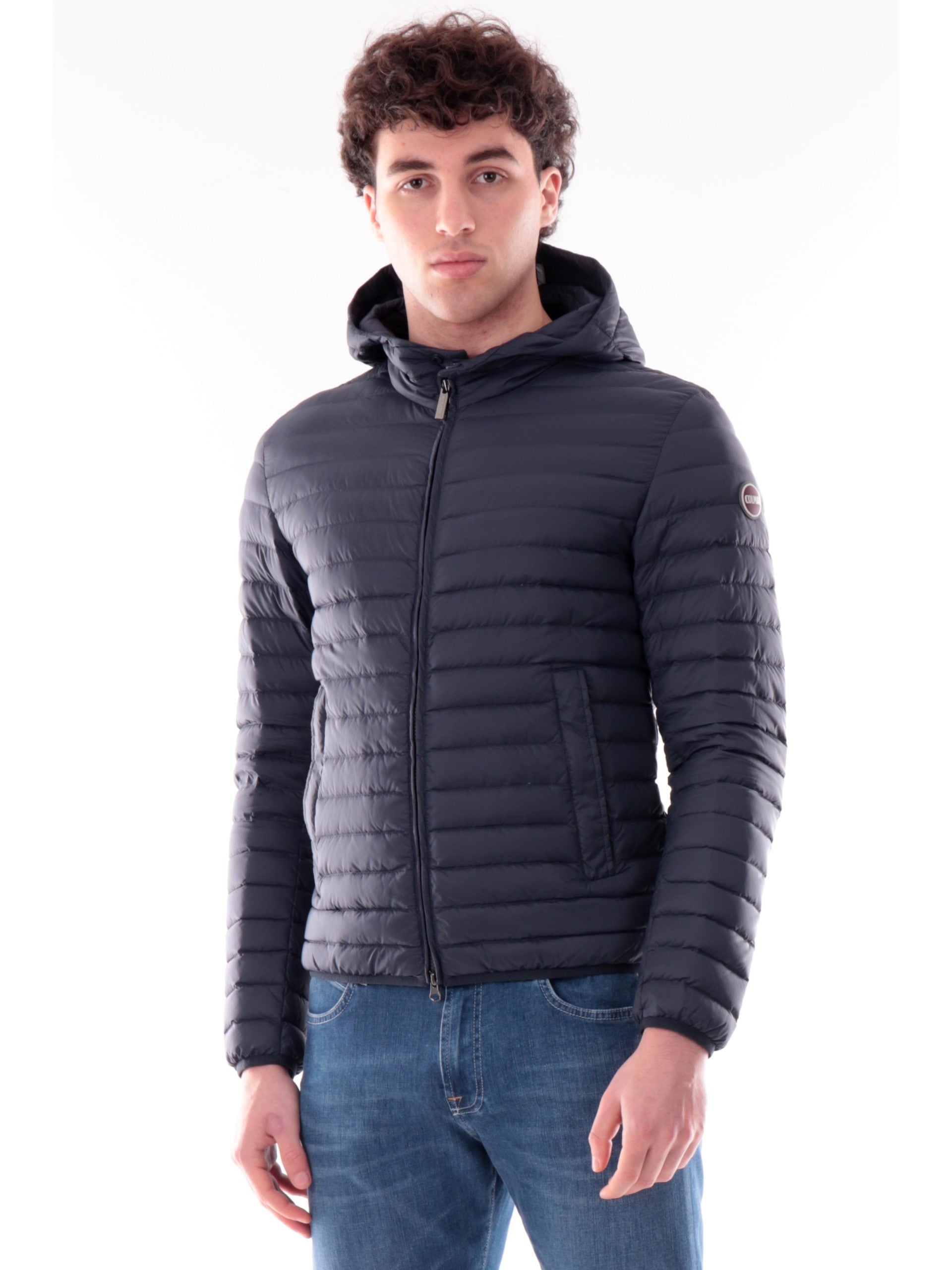 Piumino 100 grammi blu Colmar da uomo. Questo piumino Colmar blu ha il cappuccio fisso con il bottone, la chiusura full zip con doppio cursore, il patch gommato del brand applicato sulla manica sinistra, due tasche laterali con chiusura zip e polsini e fondo elasticizzati, all'interno troviamo una tasca con zip. Ideale per le giornate di primavera e le sere d’estate.