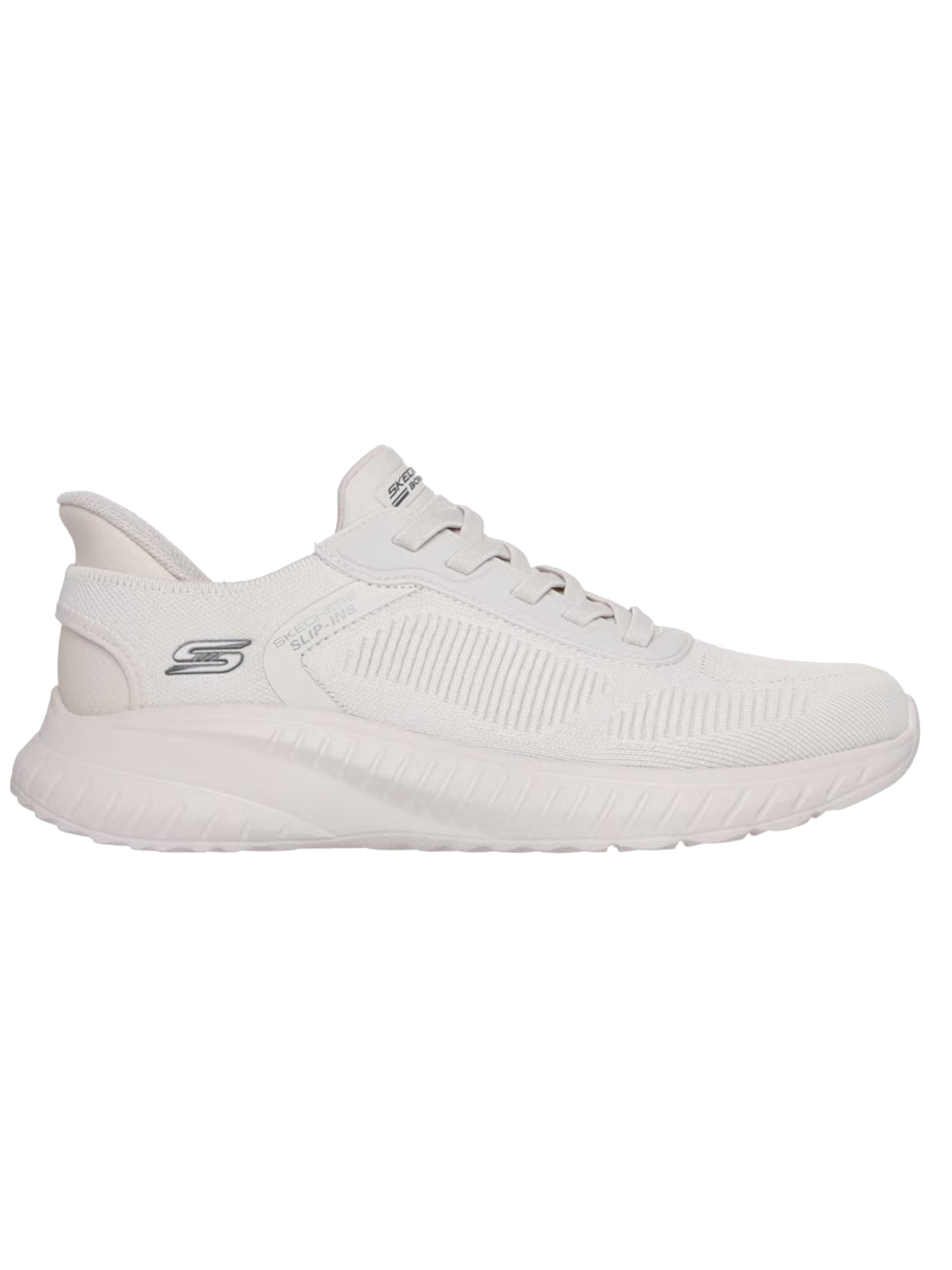 Scarpe Skechers bianche Bobs Squad Chaos solid Step da uomo Vegan. Queste scarpe Skechers bianche hanno la tomaia in tessuto traspirante, la chiusura con lacci, la suola in gomma che garantisce un corretto sostegno dell'arco plantare, una soletta ammortizzata Skechers Memory Foam e la tecnologia SLIP IN per il massimo comfort e praticità