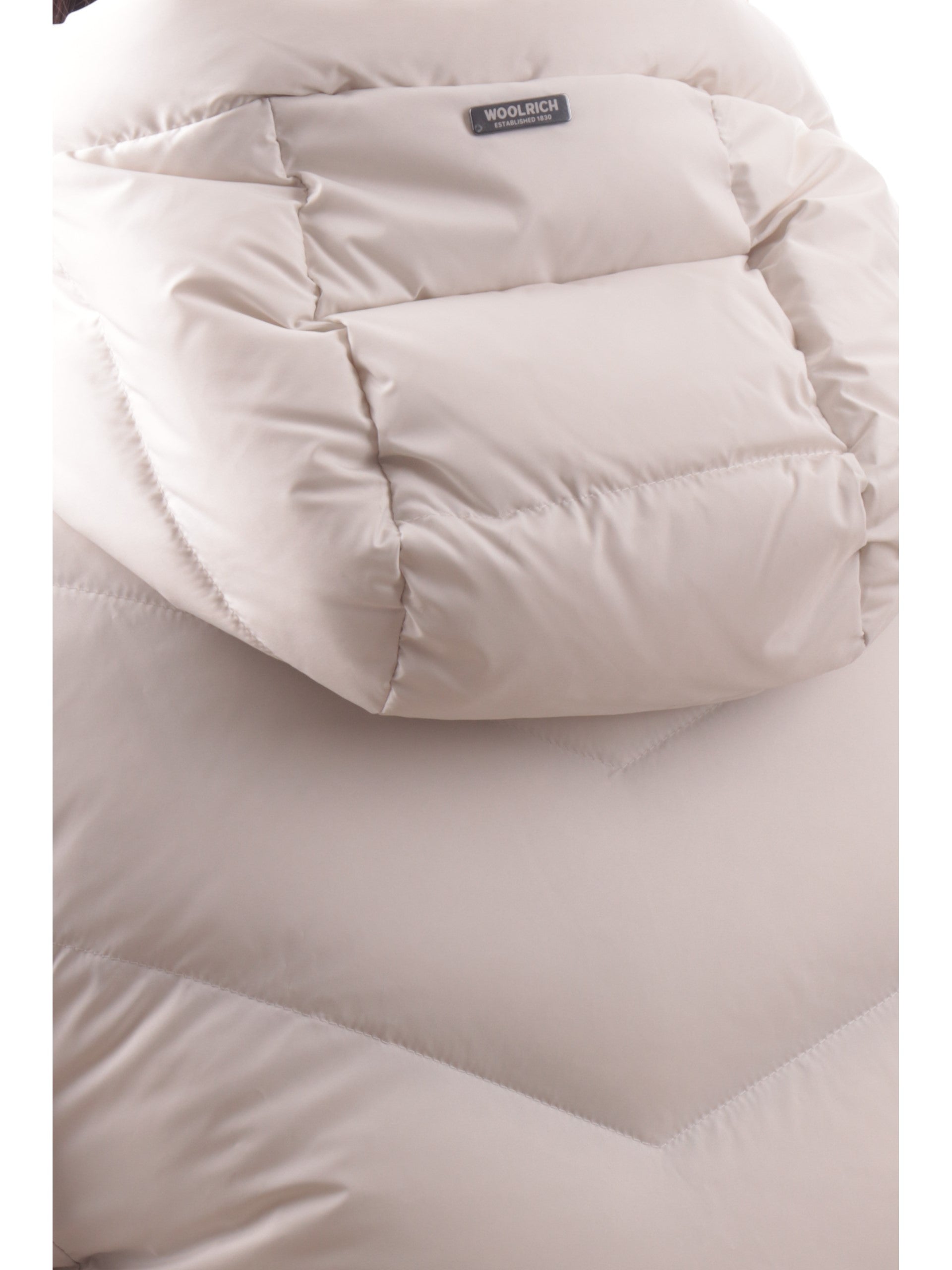 Piumino lungo Woolrich bianco da donna collo alto SHIRLEY. Questo piumino da donna bianco WOOLRICH realizzato da un tessuto caldo trapuntato è caratterizzato da cappuccio fisso regolabile con lacci, chiusura full zip centrale con doppio cursore, due tasche laterali con zip, polsini con bottoni e fondo regolare e il logo applicato sul cappuccio. Questa giacca lunga Woolrich realizzata in vera piuma garantisce protezione e comfort durante le giornate più fredde.