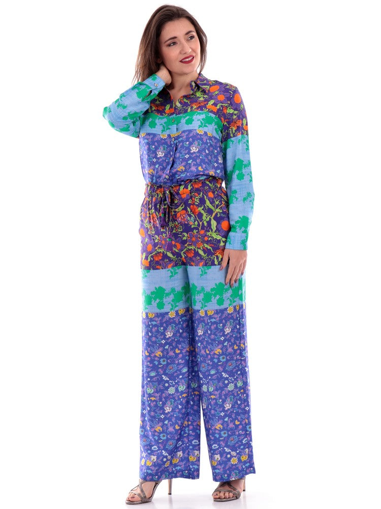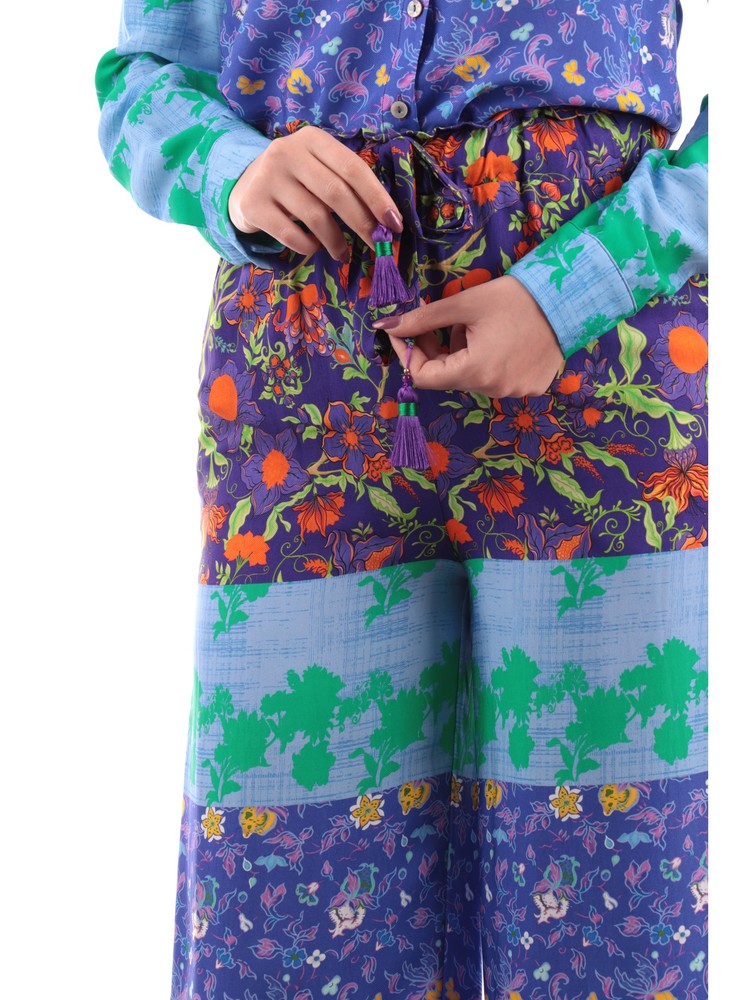 Pantaloni palazzo Wu'Side viola da donna multifantasia 23701, realizzati in morbida viscosa. Questo pantalone Wu Side viola ha la banda elastica sul punto vita regolabile con laccetti, due tasche laterali aperte con taglio obliquo e il fondo a zampa.