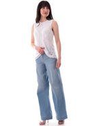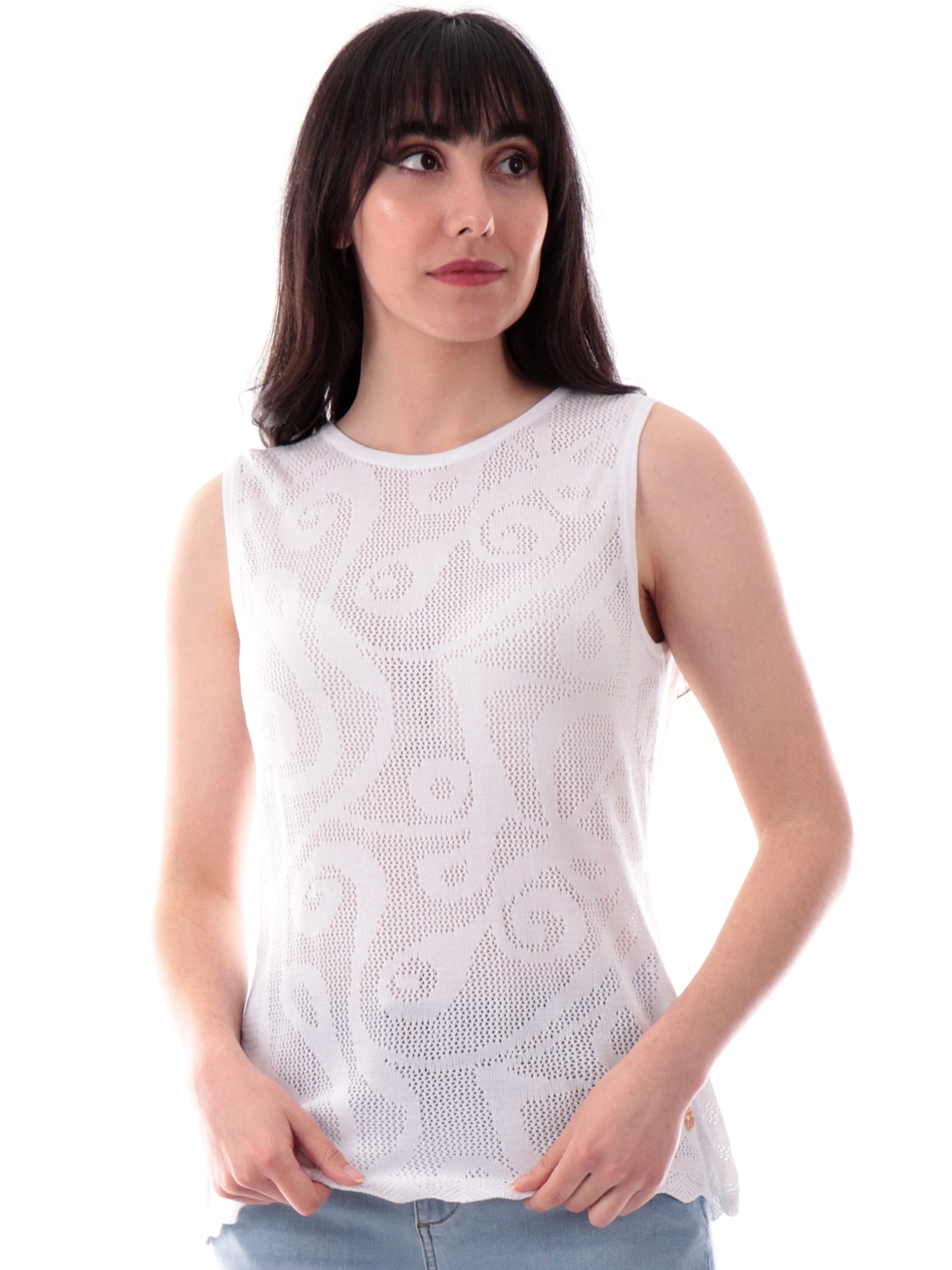 Canotta Yes Zee in filo traforata realizzata effetto uncinetto. Questa maglia Yes Zee traforata è realizzata in morbida viscosa fresca ed elasticizzata . Questa maglia Yes Zee è perfetta per essere utilizzata anche come sottogiacca donna elegante e raffinato.