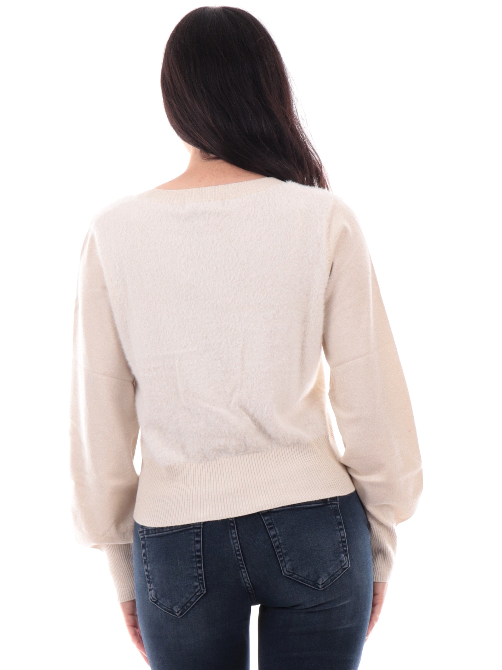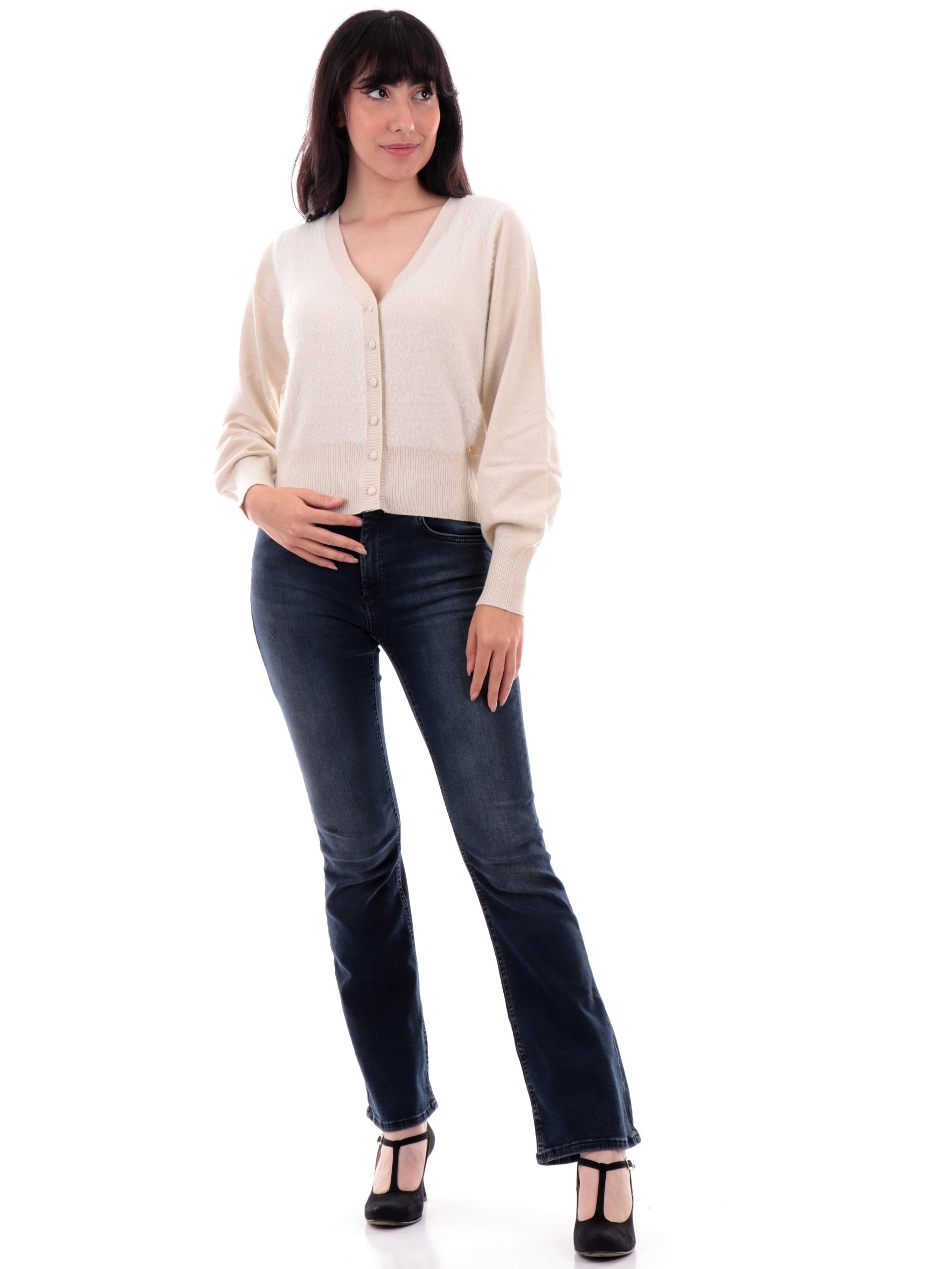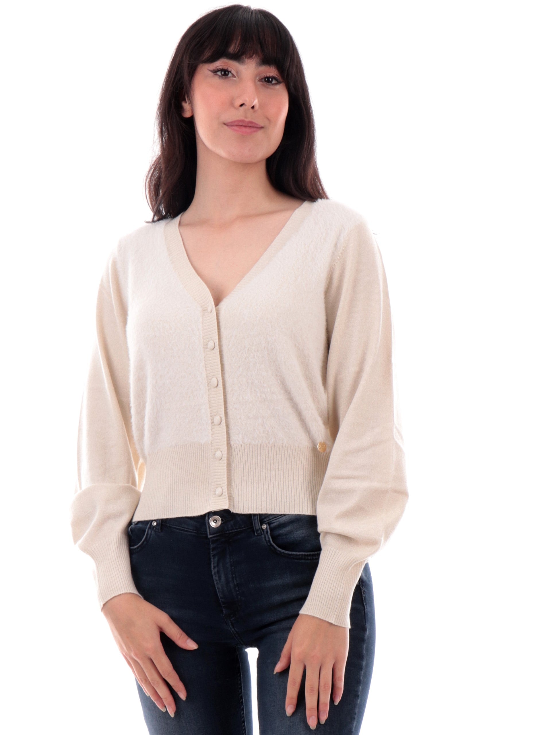 Cardigan Yes Zee bianco da donna in lurex e pelliccia eco M092IS000. Questo cardigan donna Yes Zee bianco ha lo scollo a V, la chiusura con bottoni, polsini e fondo elasticizzati a costine.