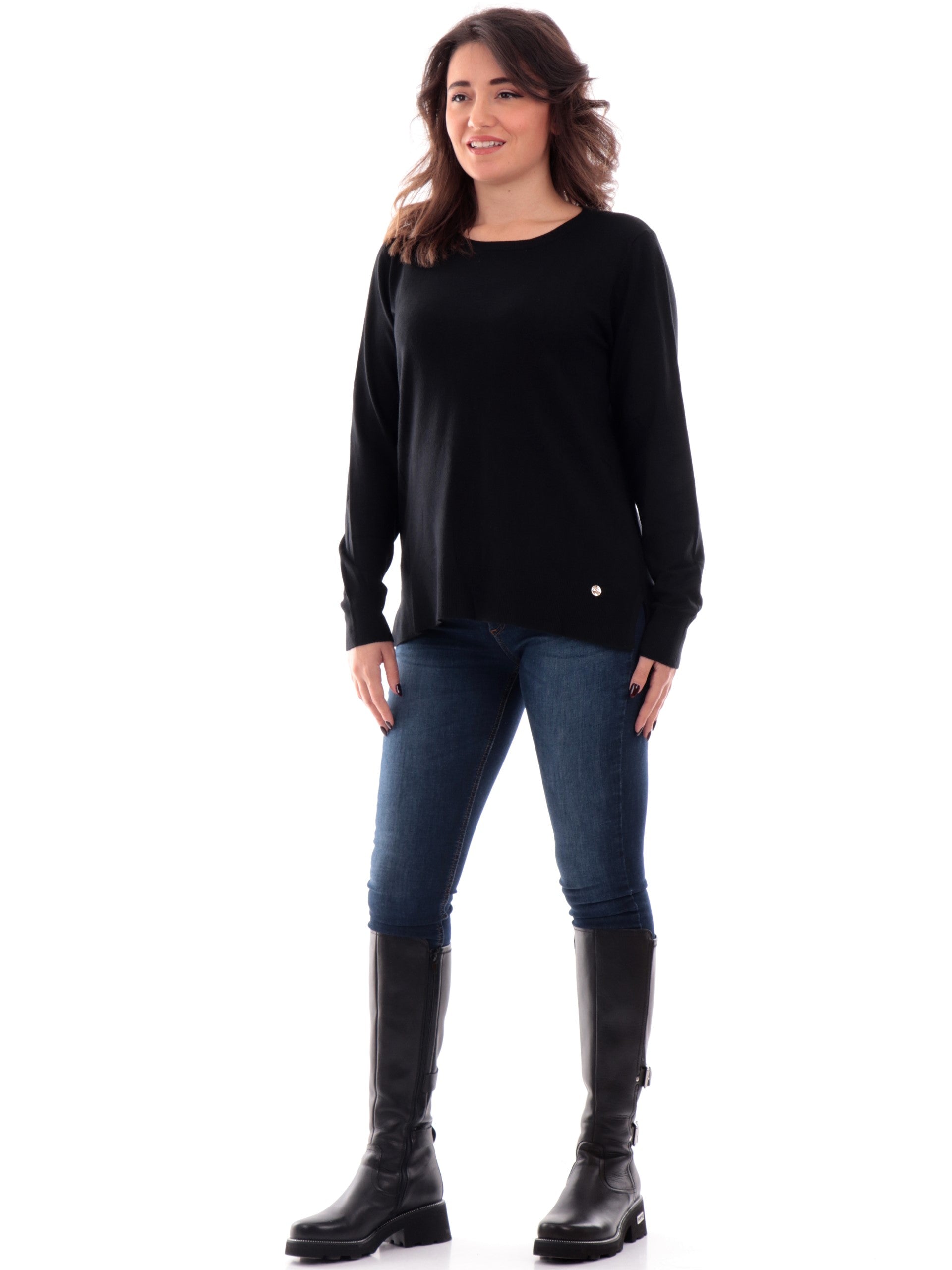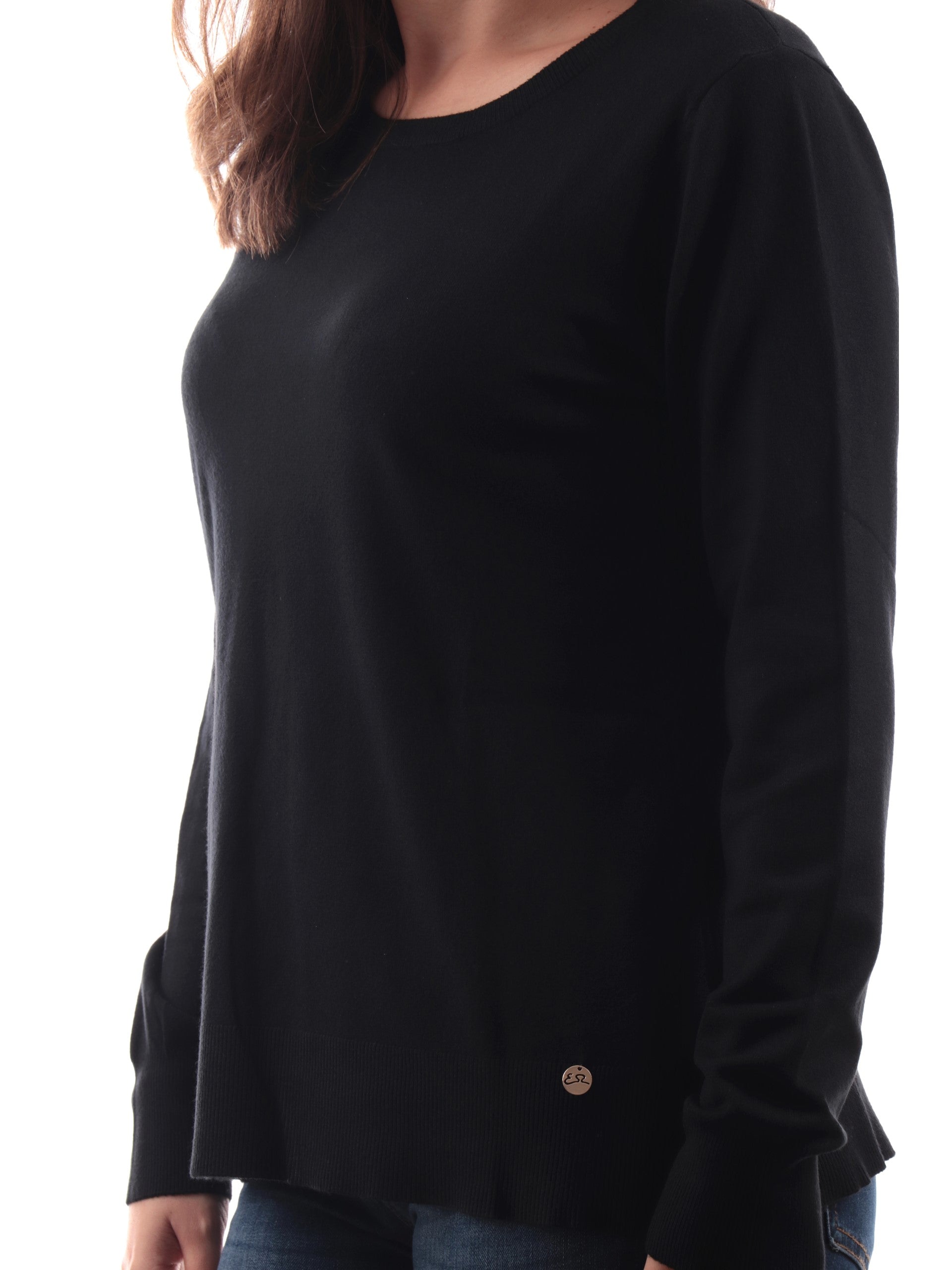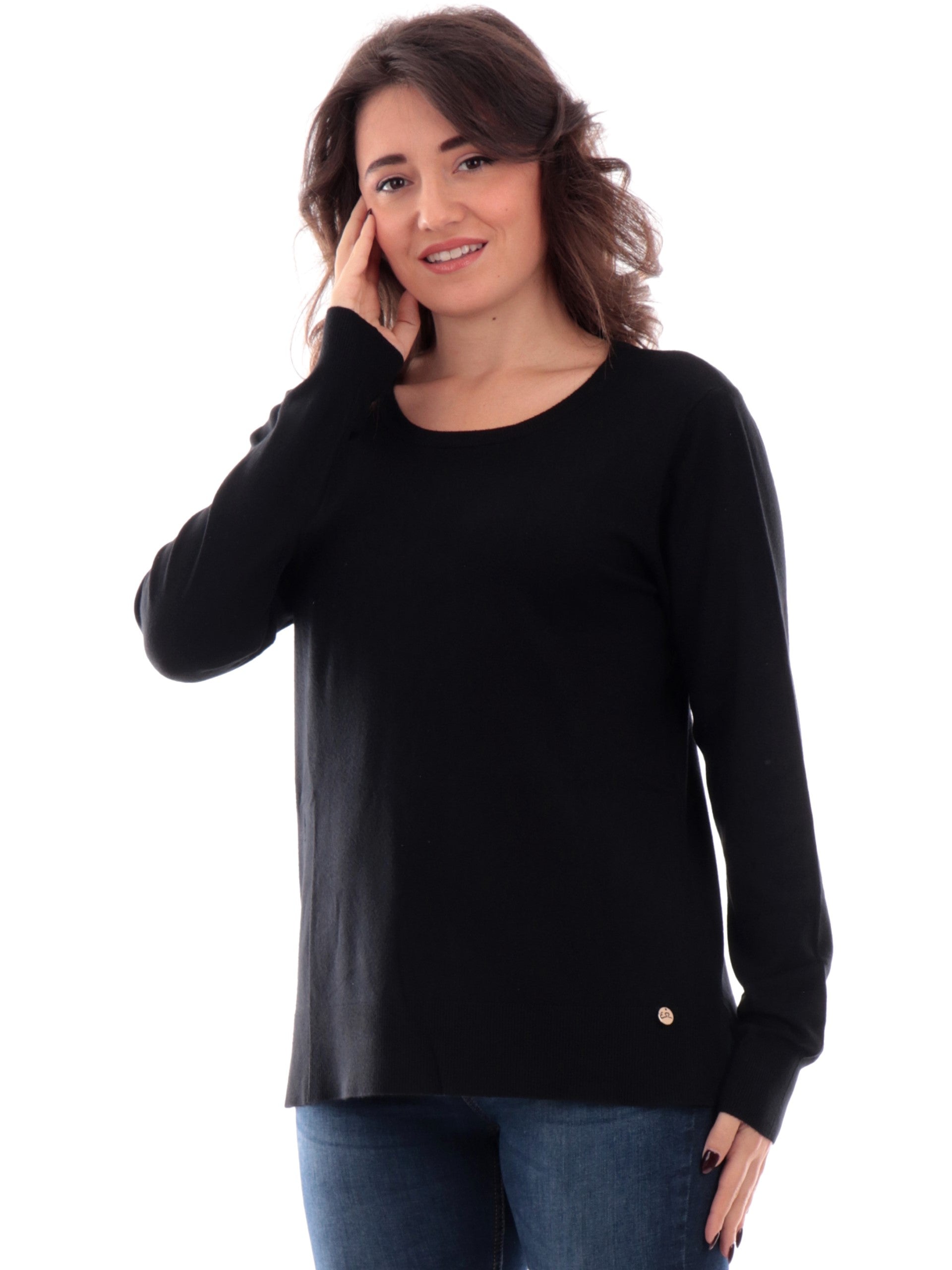 Maglione Yes Zee nero da donna a tinta unita. Questo maglia morbida Yes Zee ha il girocollo a costine, le maniche lunghe, il logo del brand posto sul fondo a contrasto colore, polsini e fondo elasticizzati a costine. La composizione viscosa rende questo maglione estremamente morbido, non può mancare nel tuo armadio.