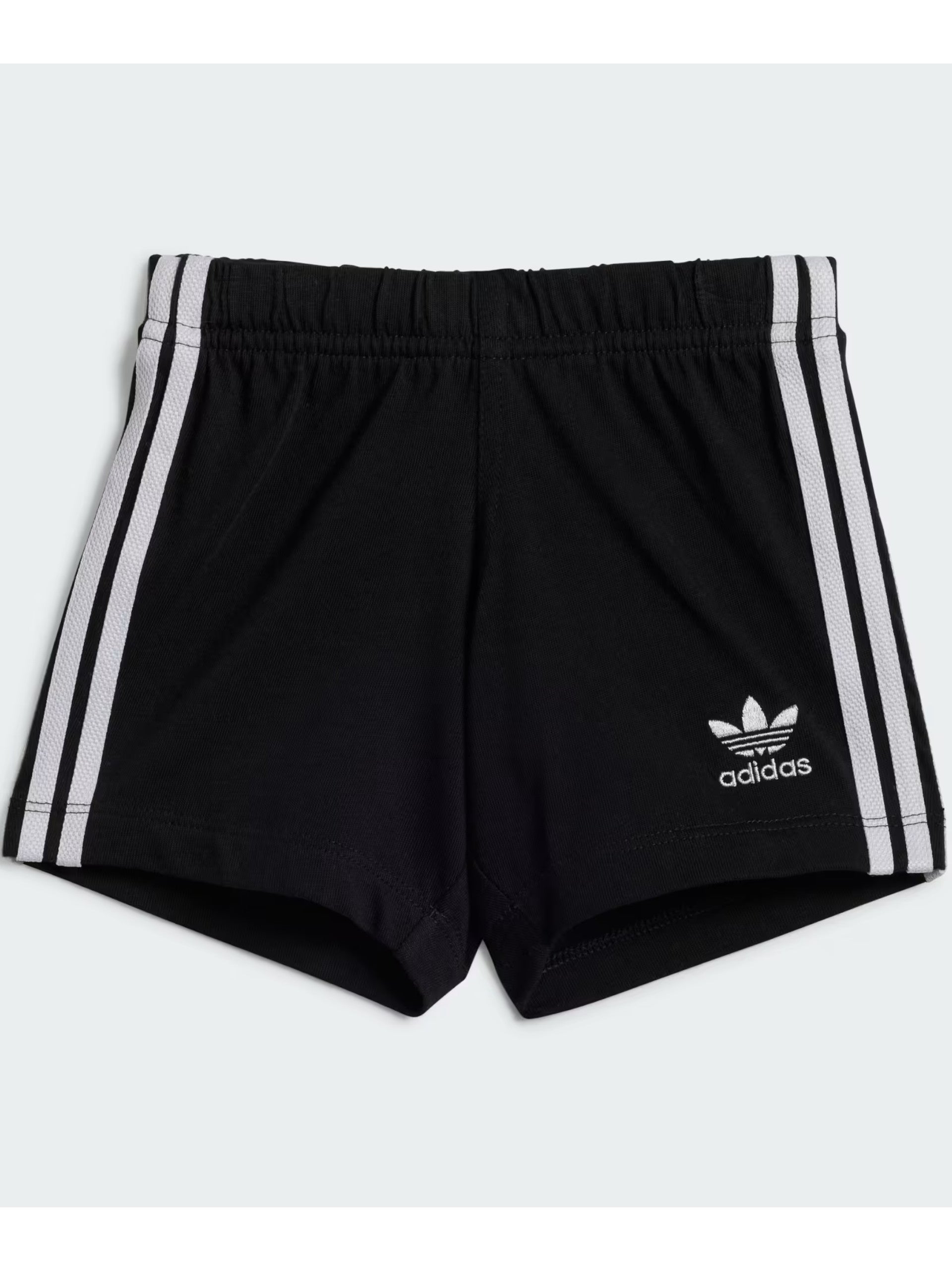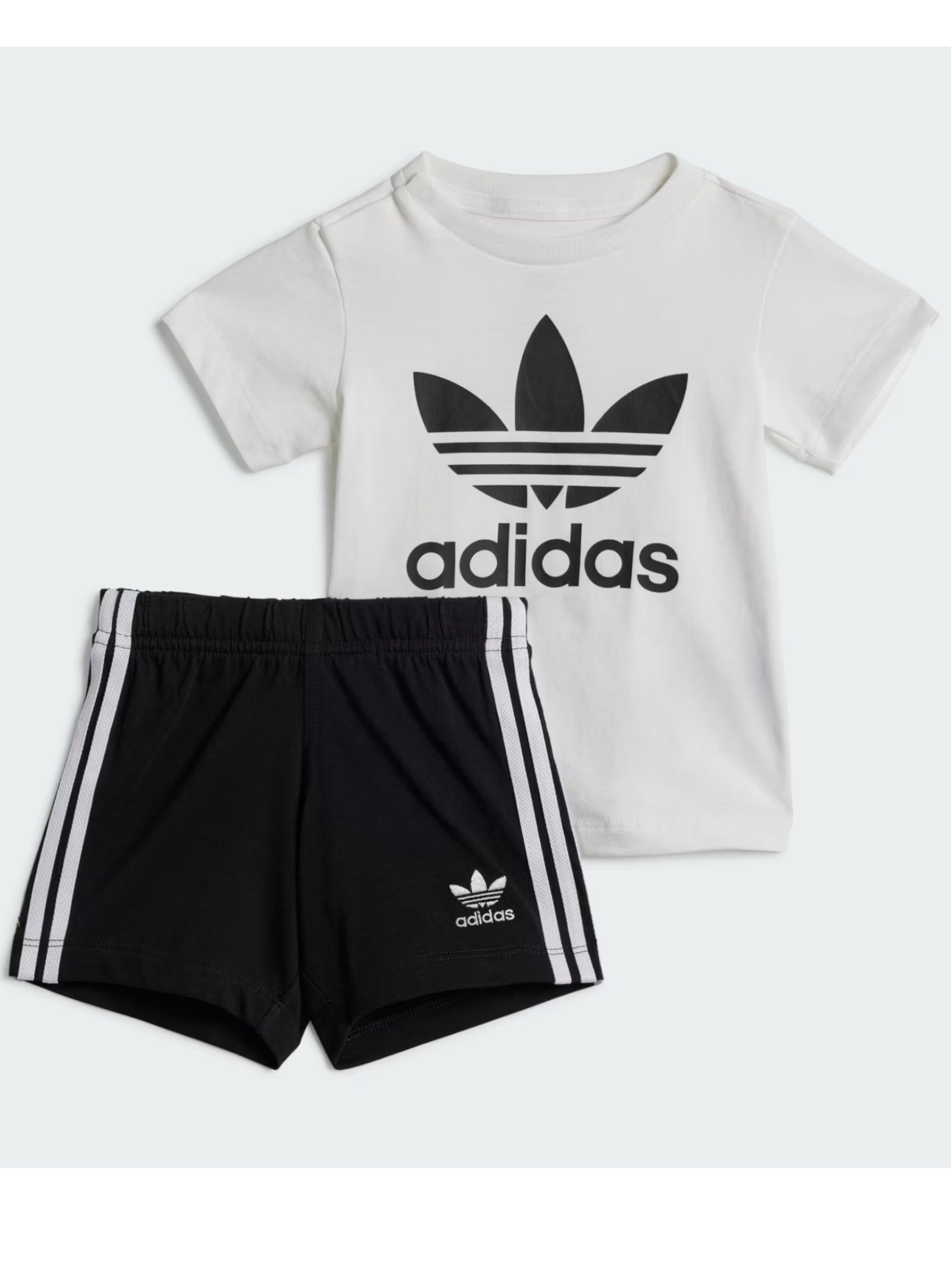 Tuta Adidas bianca e nera Kids t-shirt e bermuda JE0521, realizzata in 100% puro cotone. La t-shirt di questo set Adidas ha le maniche corte, la chiusura con bottoni automatici e il logo Adidas Originals nero. I bermuda di questo set Adidas hanno la banda elastica sul punto vita regolabile con laccetti, le 3Stripes ambo i lati e il logo Adidas Originals bianco ricamato.
