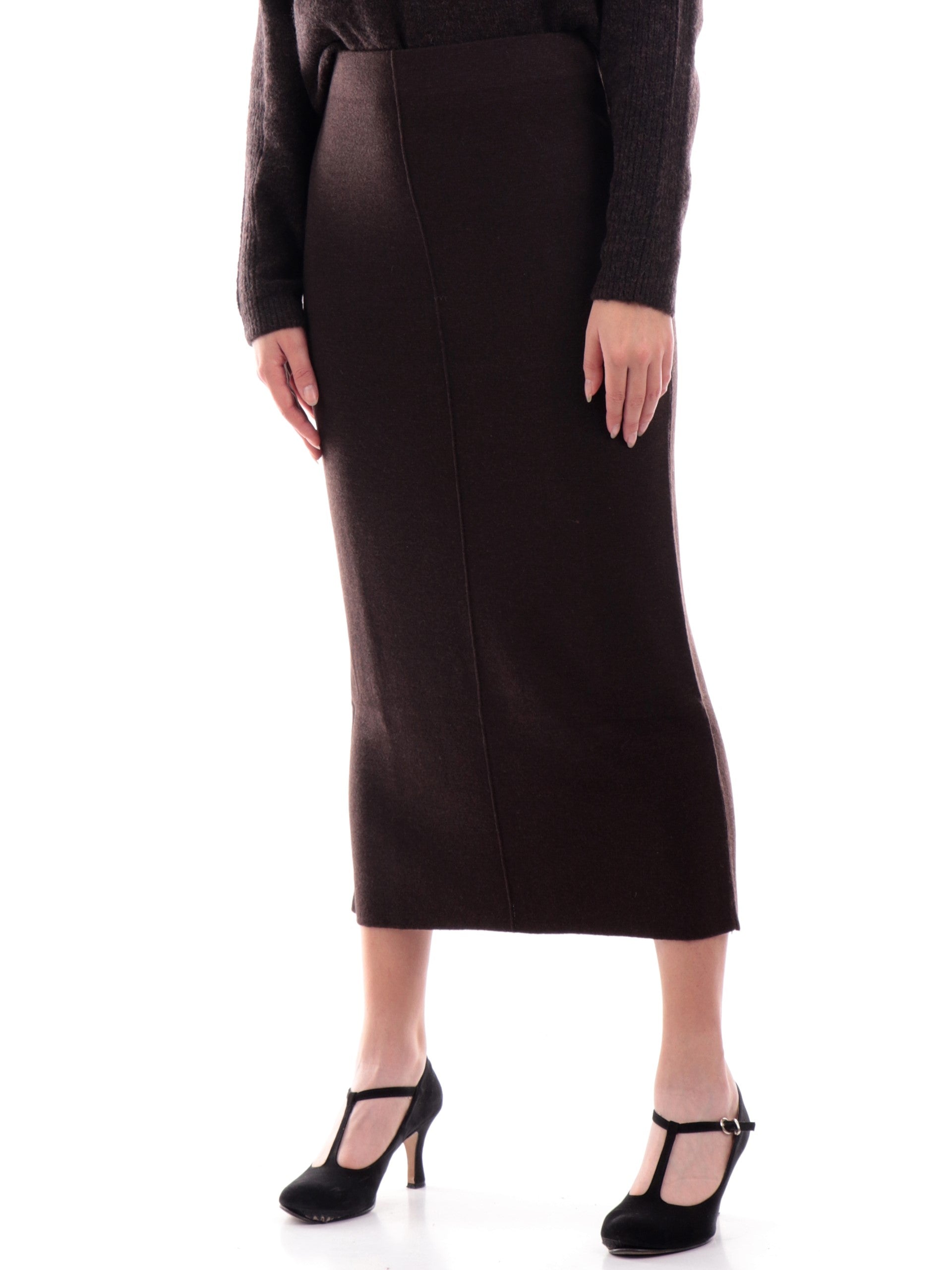 Gonna Anis marrone da donna in maglia 245W1335, realizzata in misto lana. Questa gonna Anis White marrone ha la banda elastica sul punto vita e il fondo leggermente svasato.