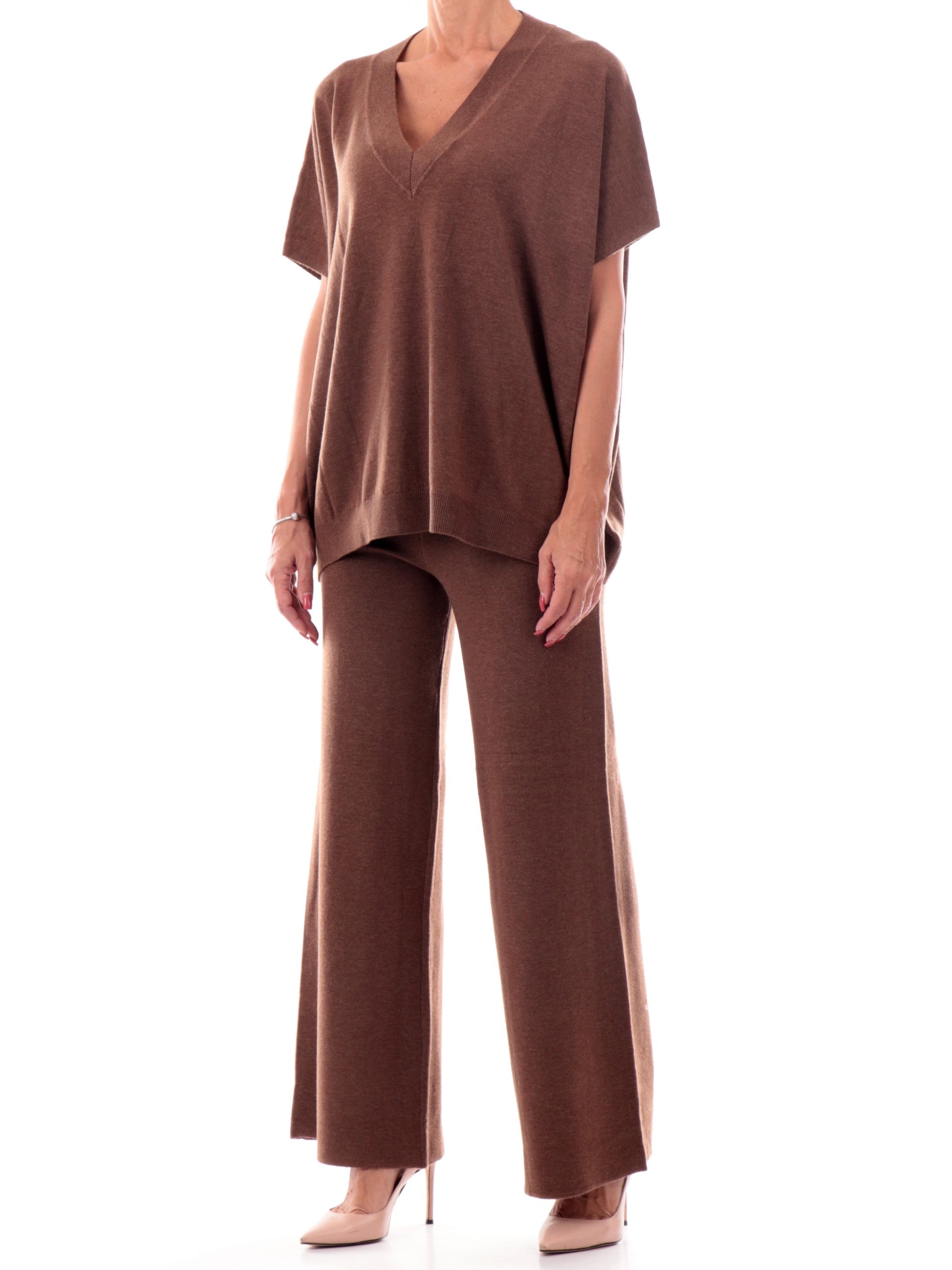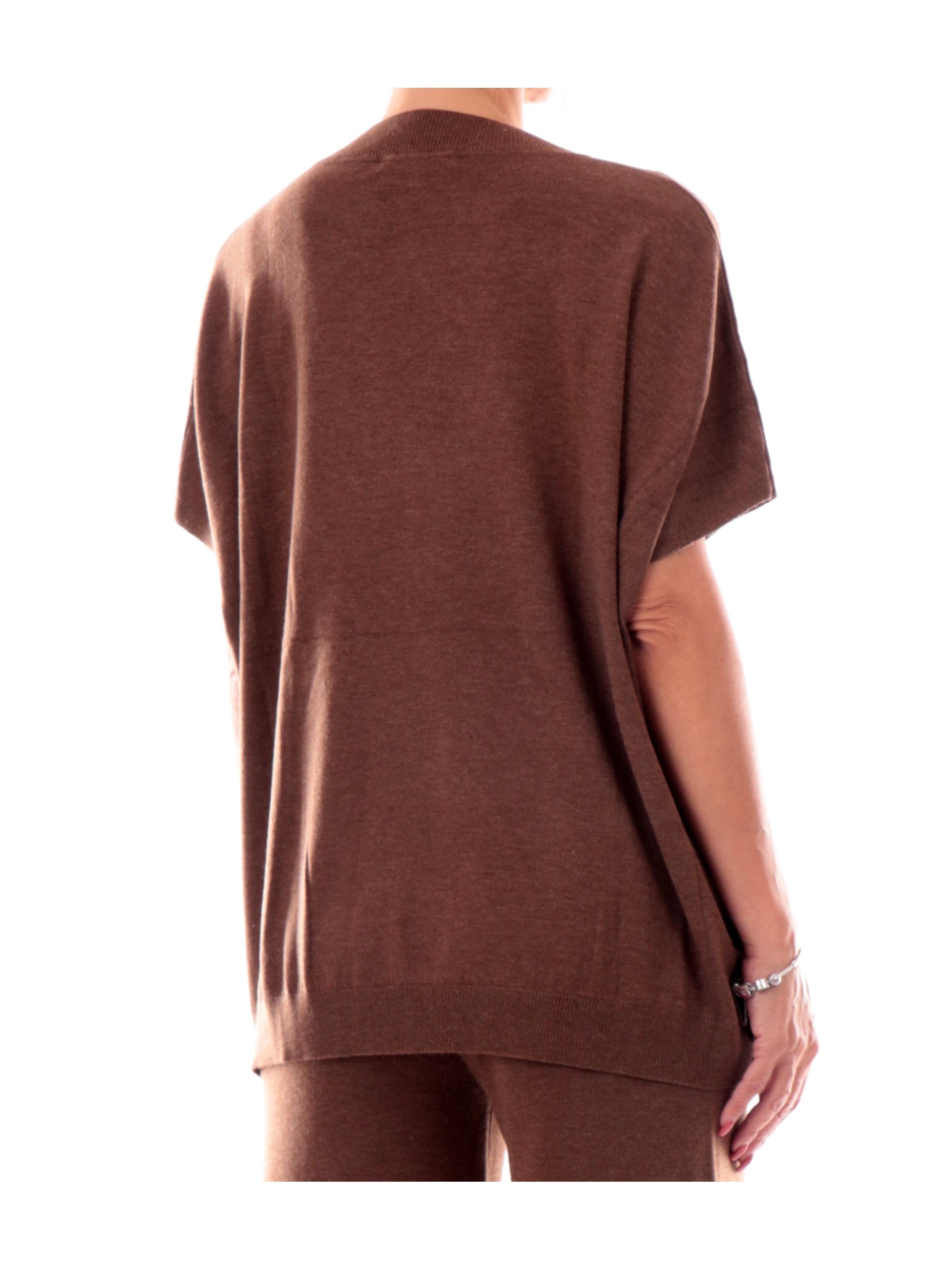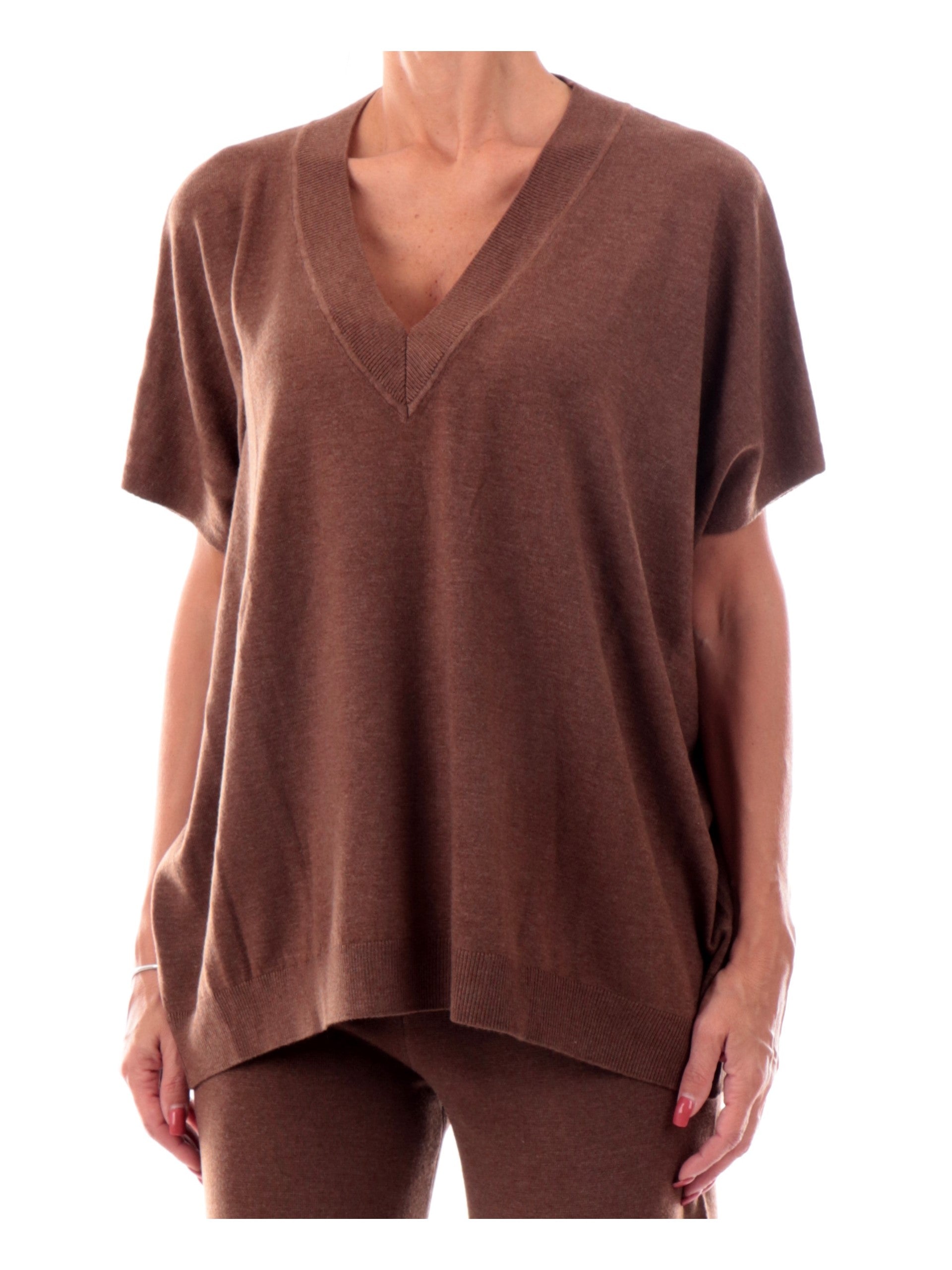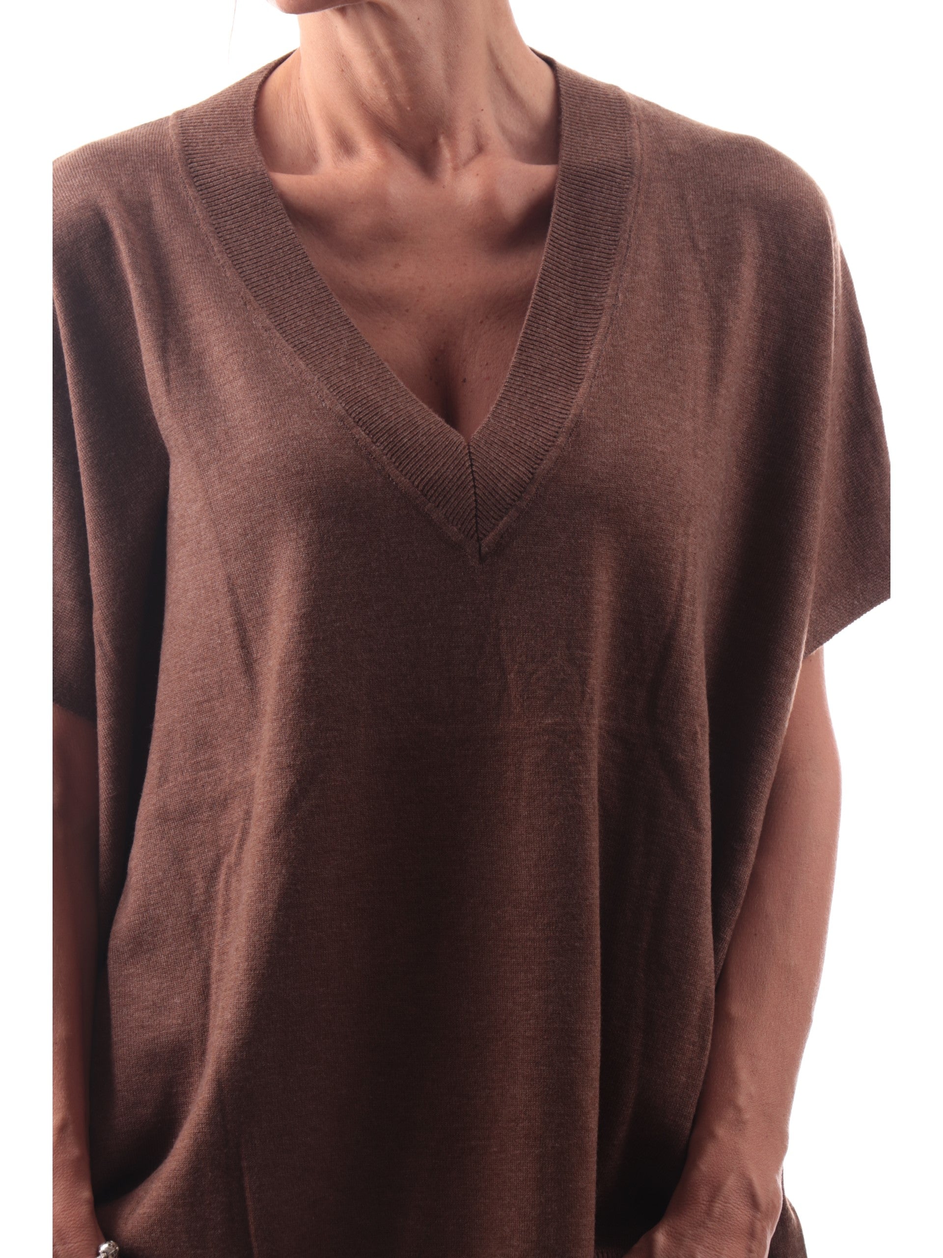 Maglia over marrone da donna Anis White. Questa maglia è realizzata da un tessuto leggero e morbido al tatto, con una scollatura a V, maniche corte e fondo elasticizzati.