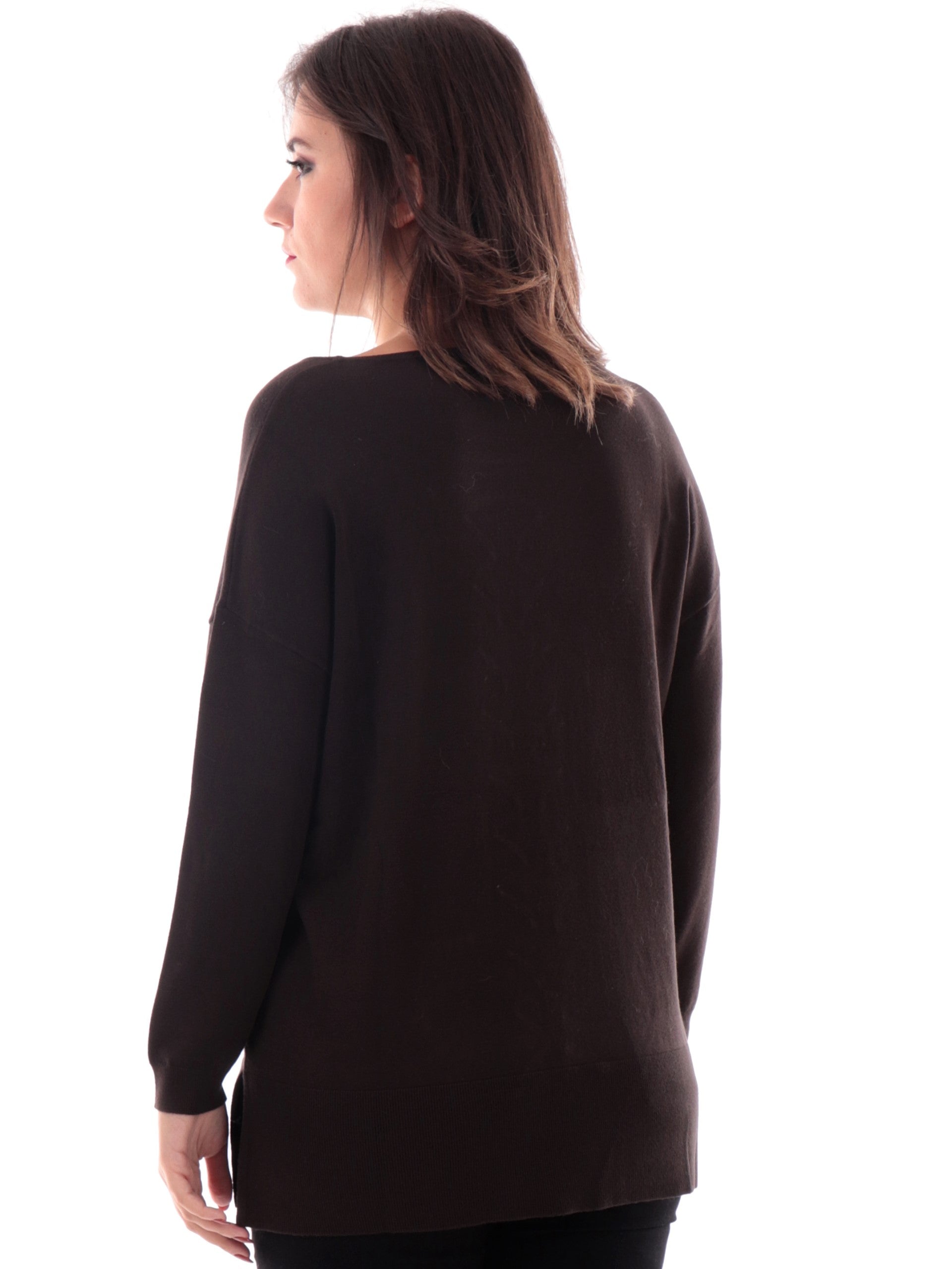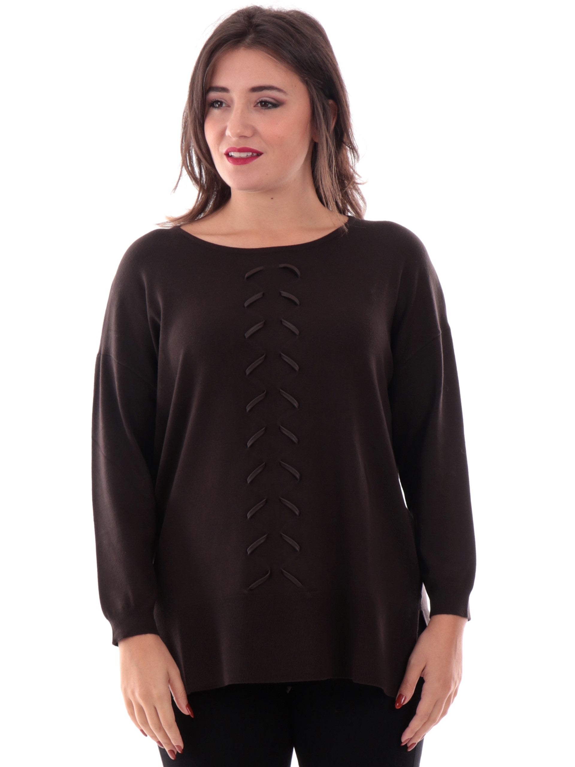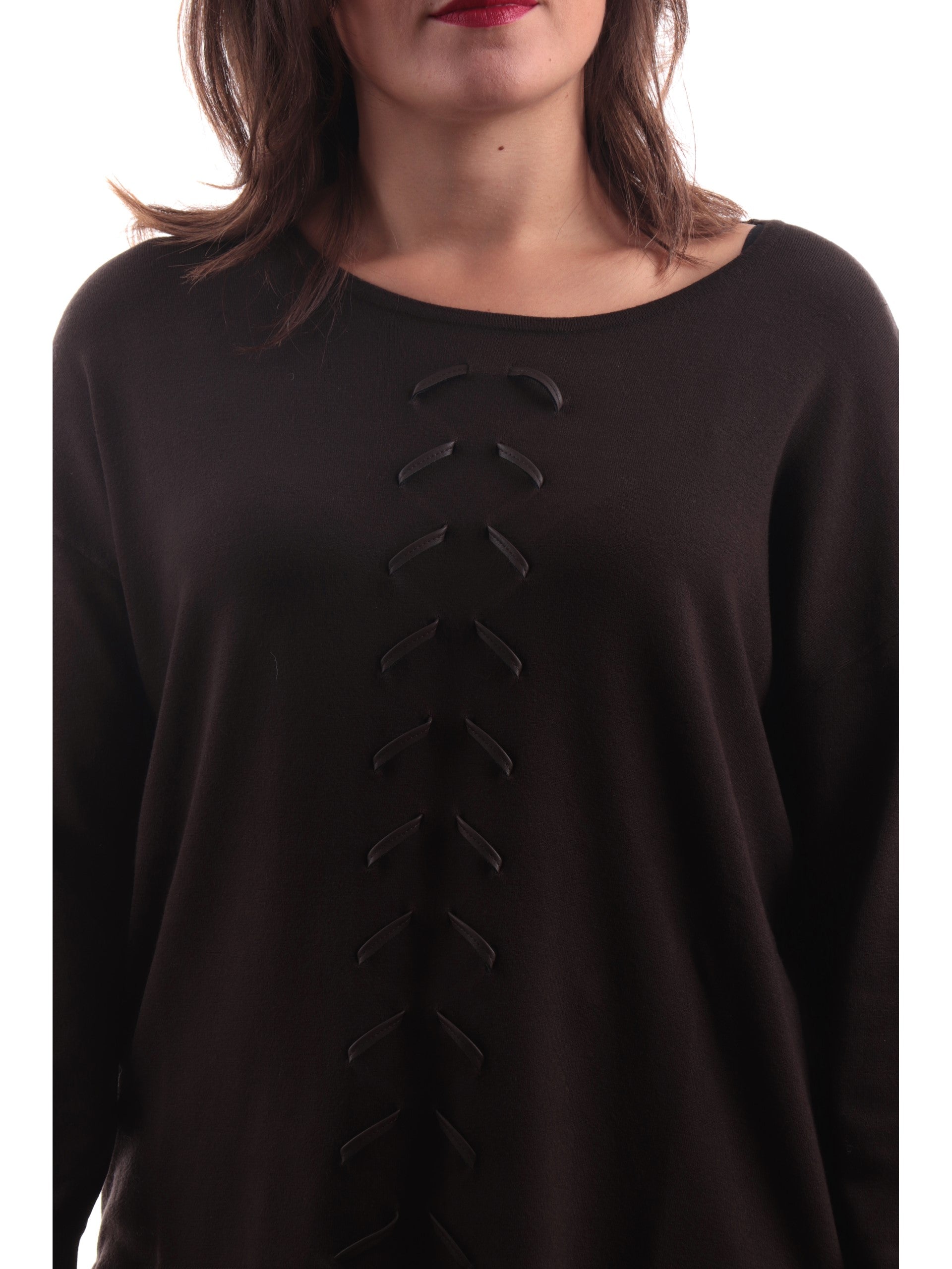 Maglione Anis marrone da donna collo laccio pelle 245F1010, realizzato in morbida viscosa. Questo maglione donna Anis ha le maniche lunghe, il fondo con spacchi laterali e lacci in pelle sul davanti.