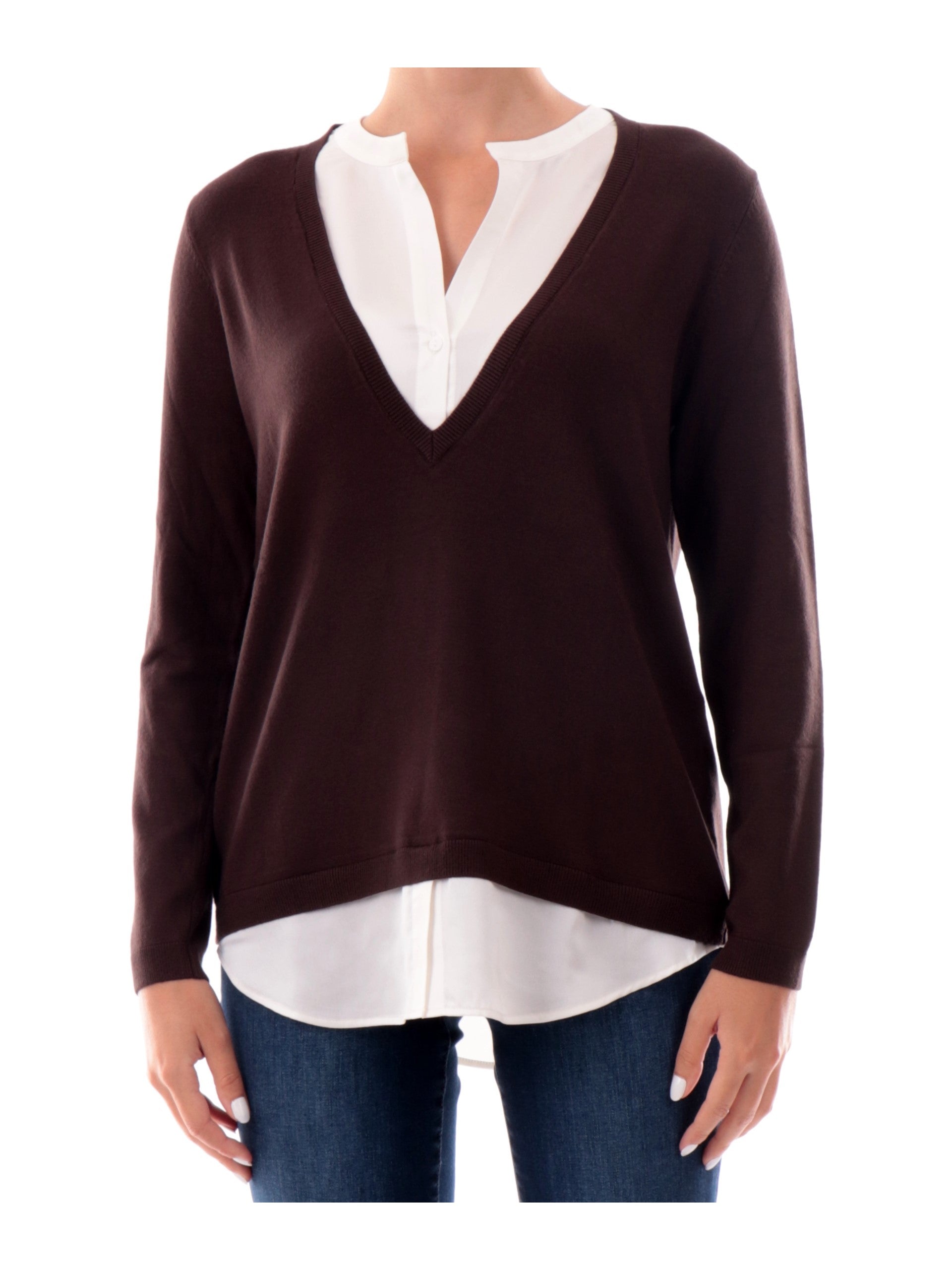 Maglione Anis marrone da donna inserto serafino 255W1000, realizzato in viscosa. Questo maglione donna Anis marrone ha lo scollo a V, polsini e fondo elasticizzati con inserti in raso.
