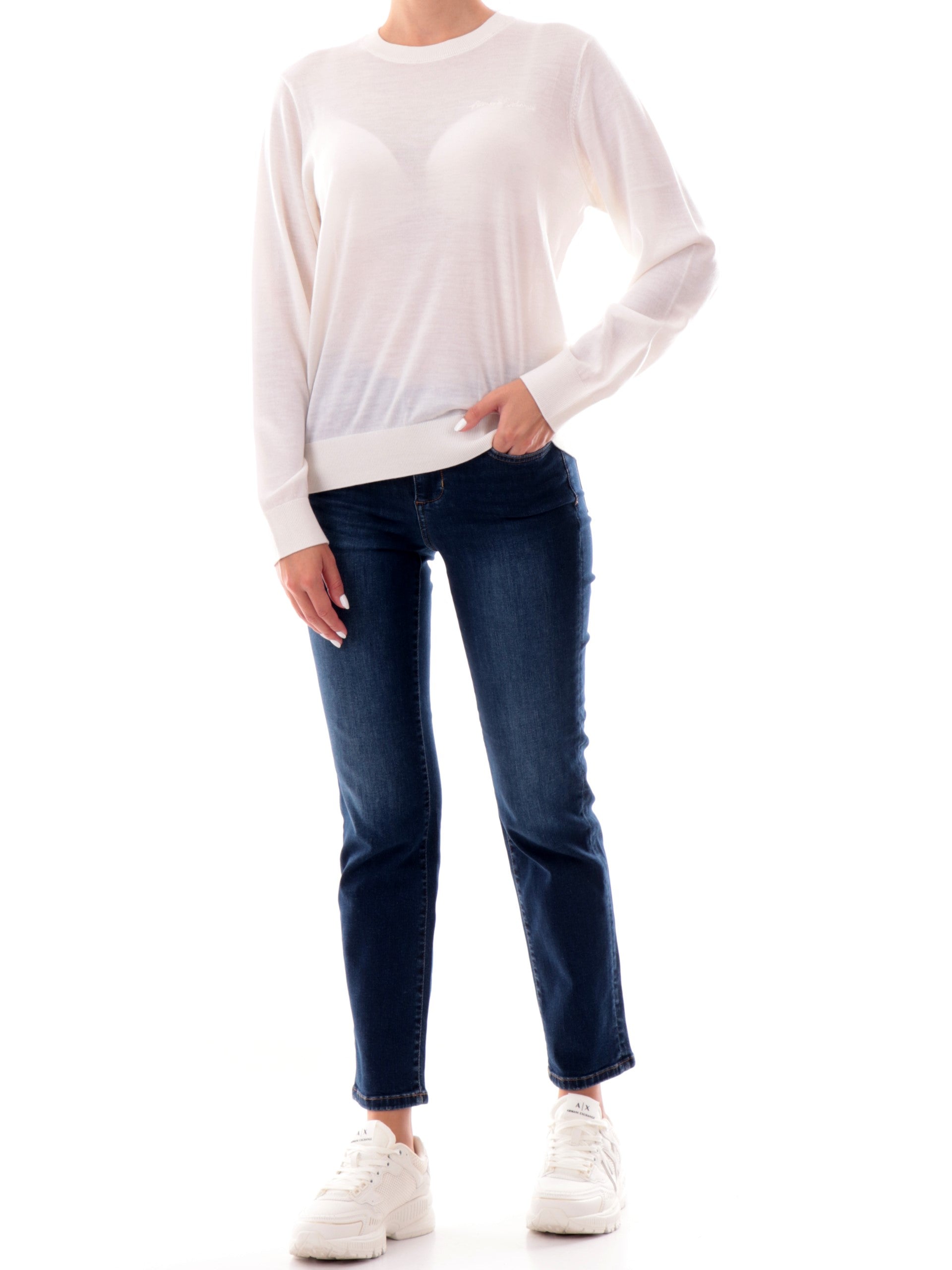 Maglione Armani Exchange Bianco da donna con logo lato cuore ricamato. Questo maglione Armani donna è realizzato in finissima lana vergine e bordi rifiniti a costine.