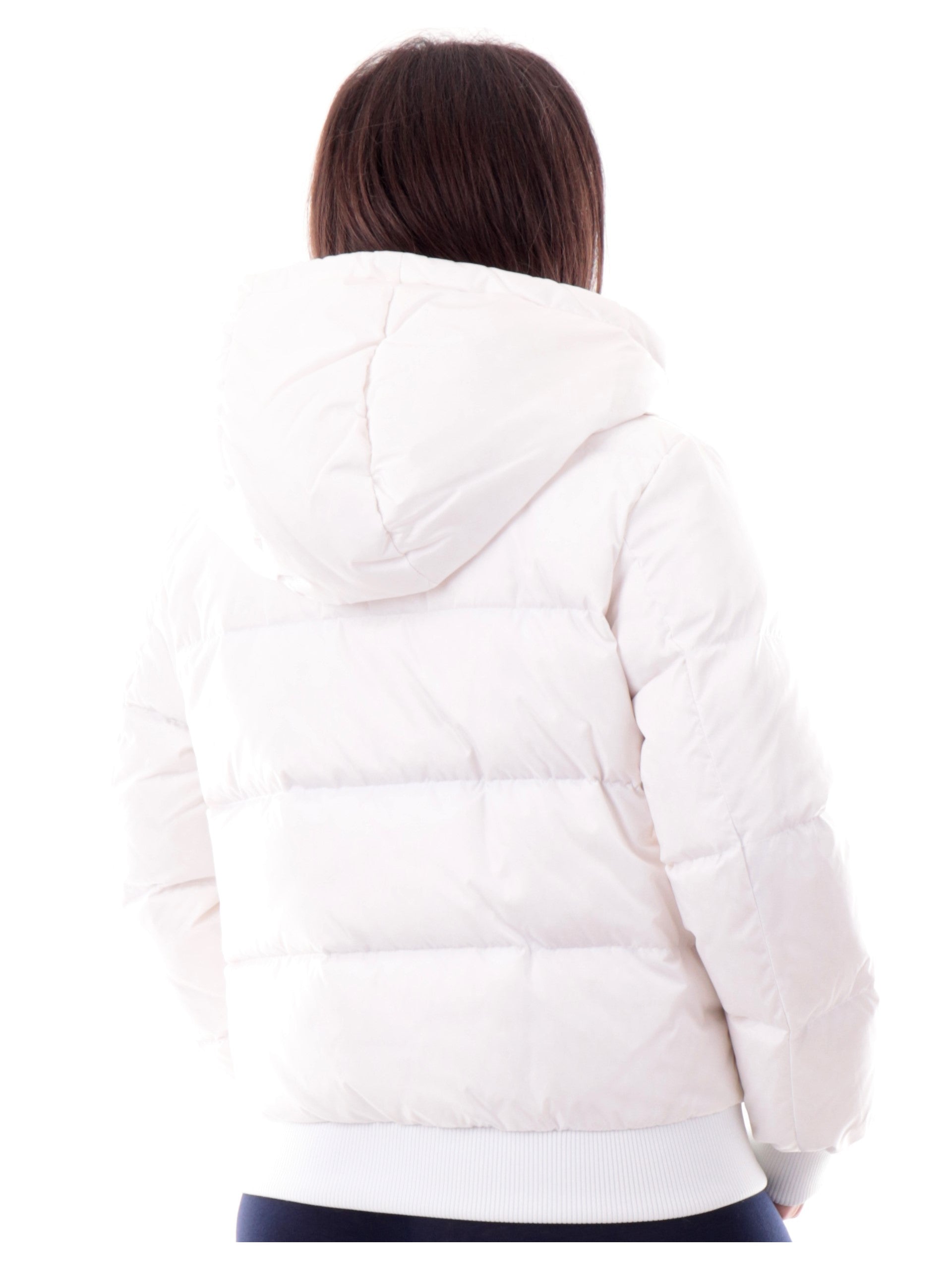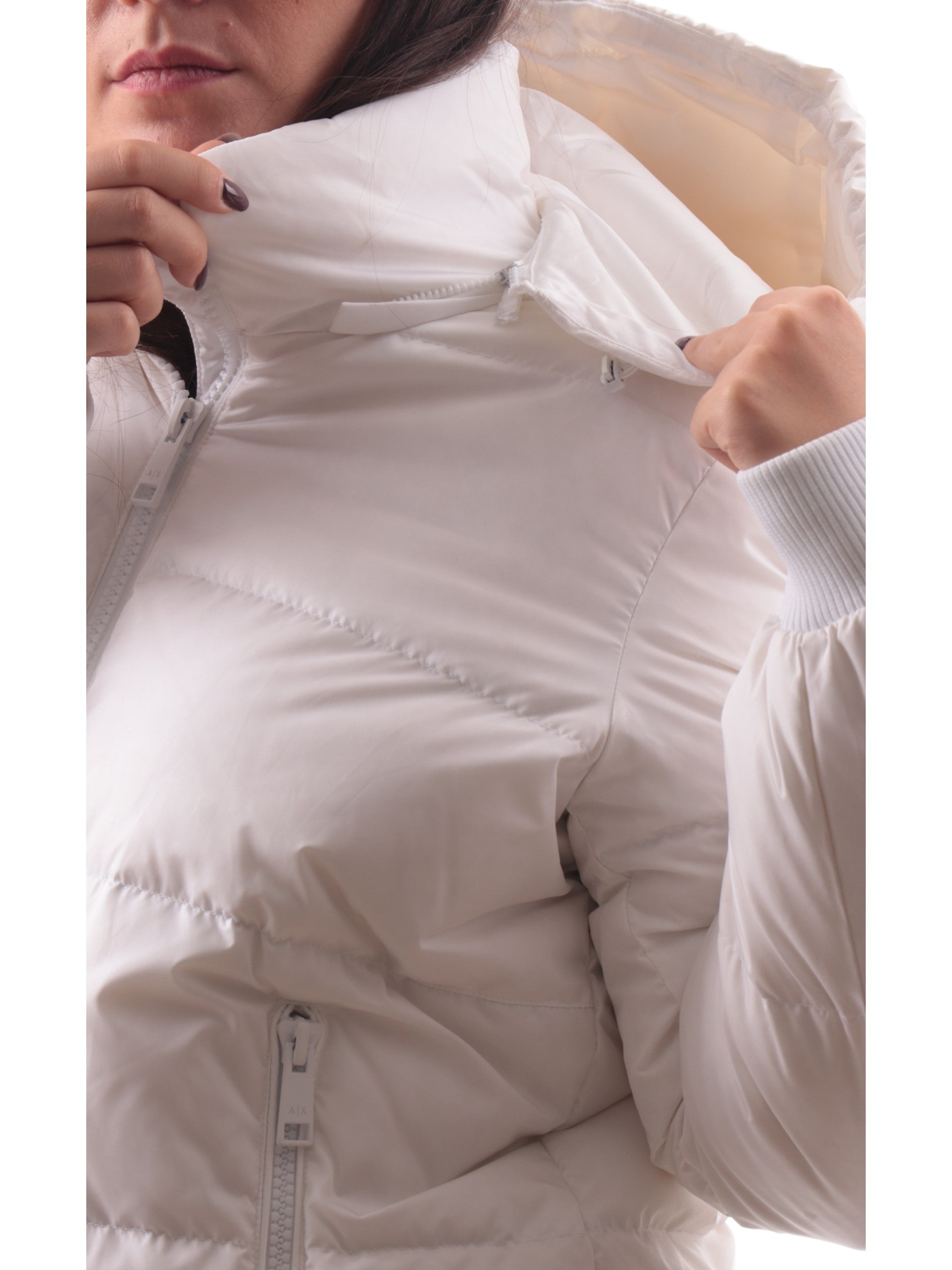 Piumino Armani Exchange AX bianco da donna XW000228AF12286, realizzato con imbottitura in vera piuma. Questo piumino AX bianco ha il cappuccio removibile, la chiusura full zip centrale, due tasche laterali con zip, polsini e fondo elasticizzati a costine. Patch Armani applicato sulla manica sinistra a contrasto colore.