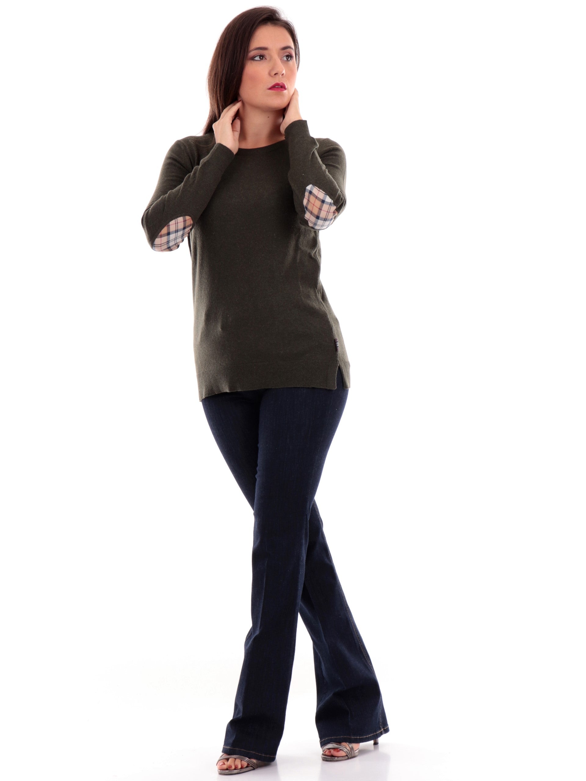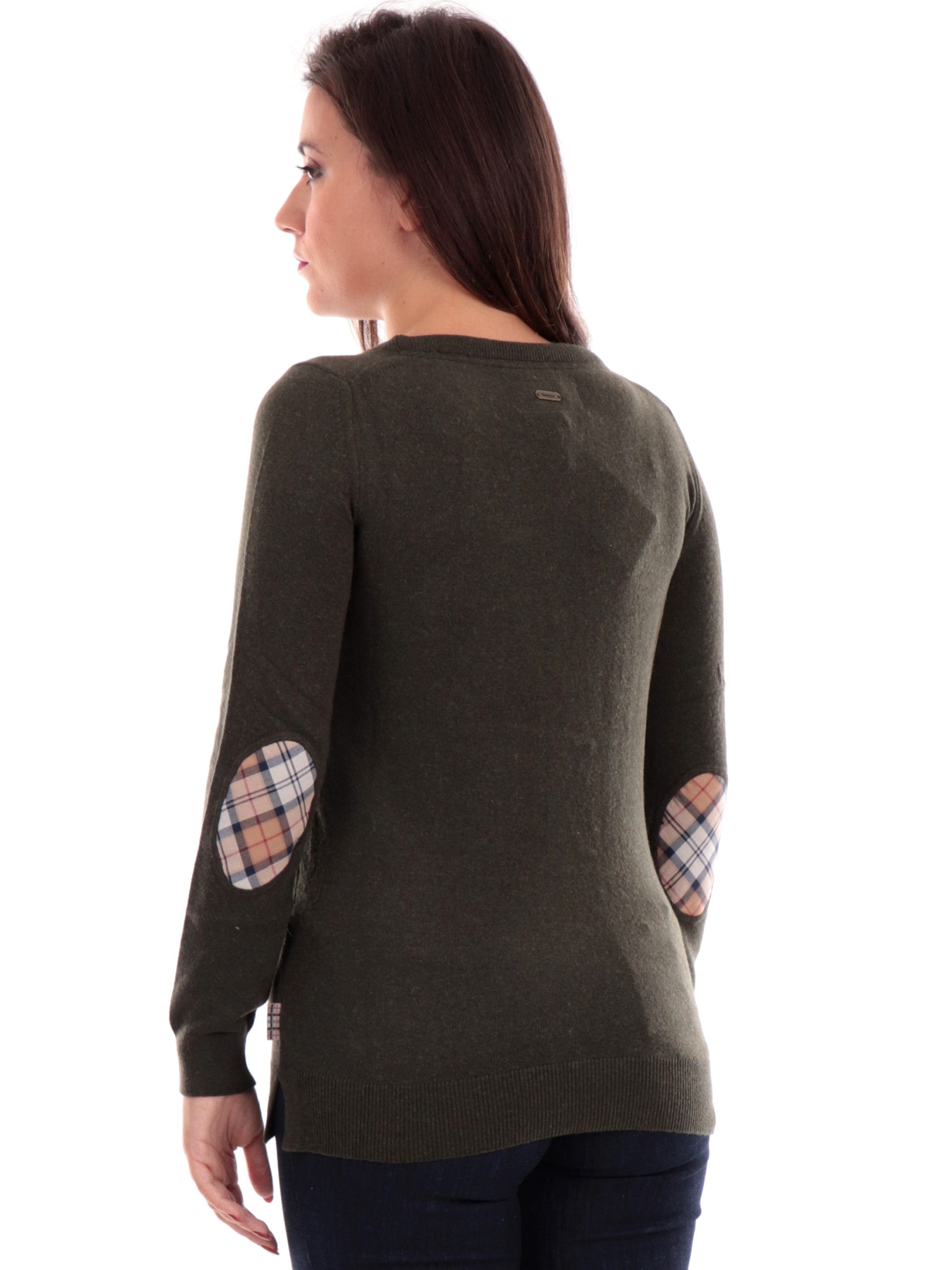 Maglione Barbour verde da donna a tinta unita Pendle Crew LKN1075. Questo pullover Barbour verde girocollo dallo stile casual e dalla vestibilità regolare ha delle toppe decorative sui gomiti e polsini e fondo a costine. Questo maglione Barbour da donna dal taglio semplice ma ricercato, è ideale per la stagione Autunno/Inverno e si abbina facilmente ai tuoi outfit.