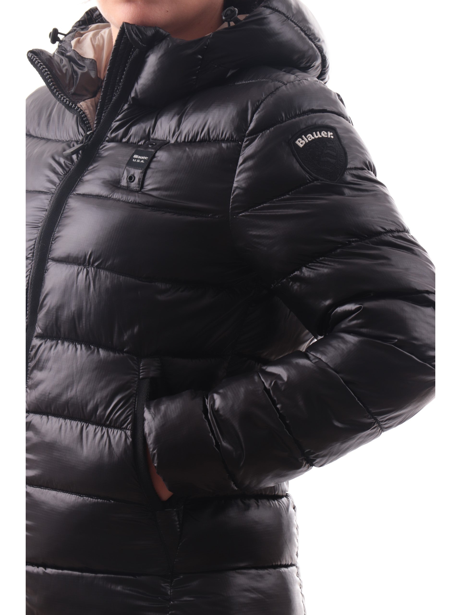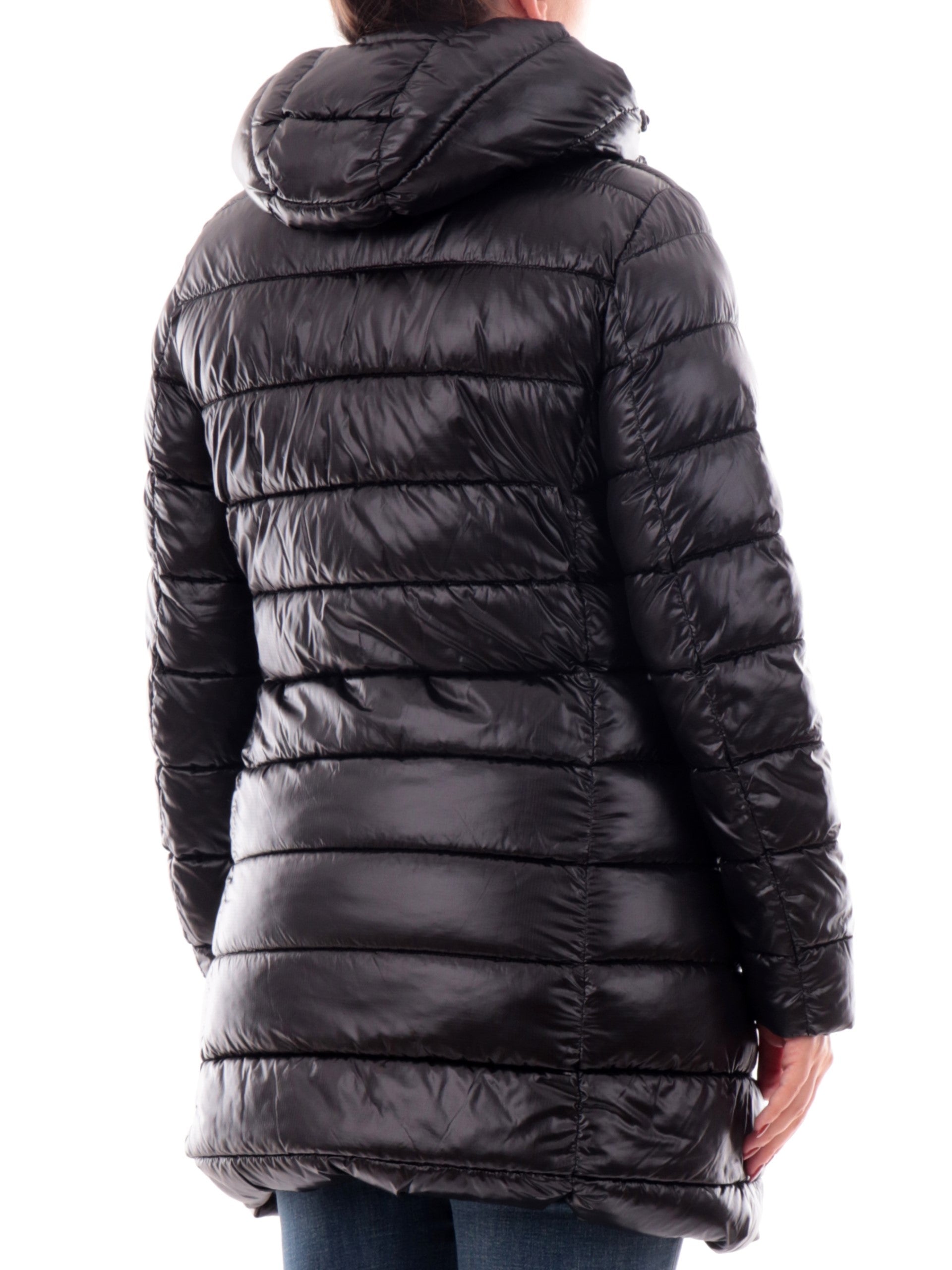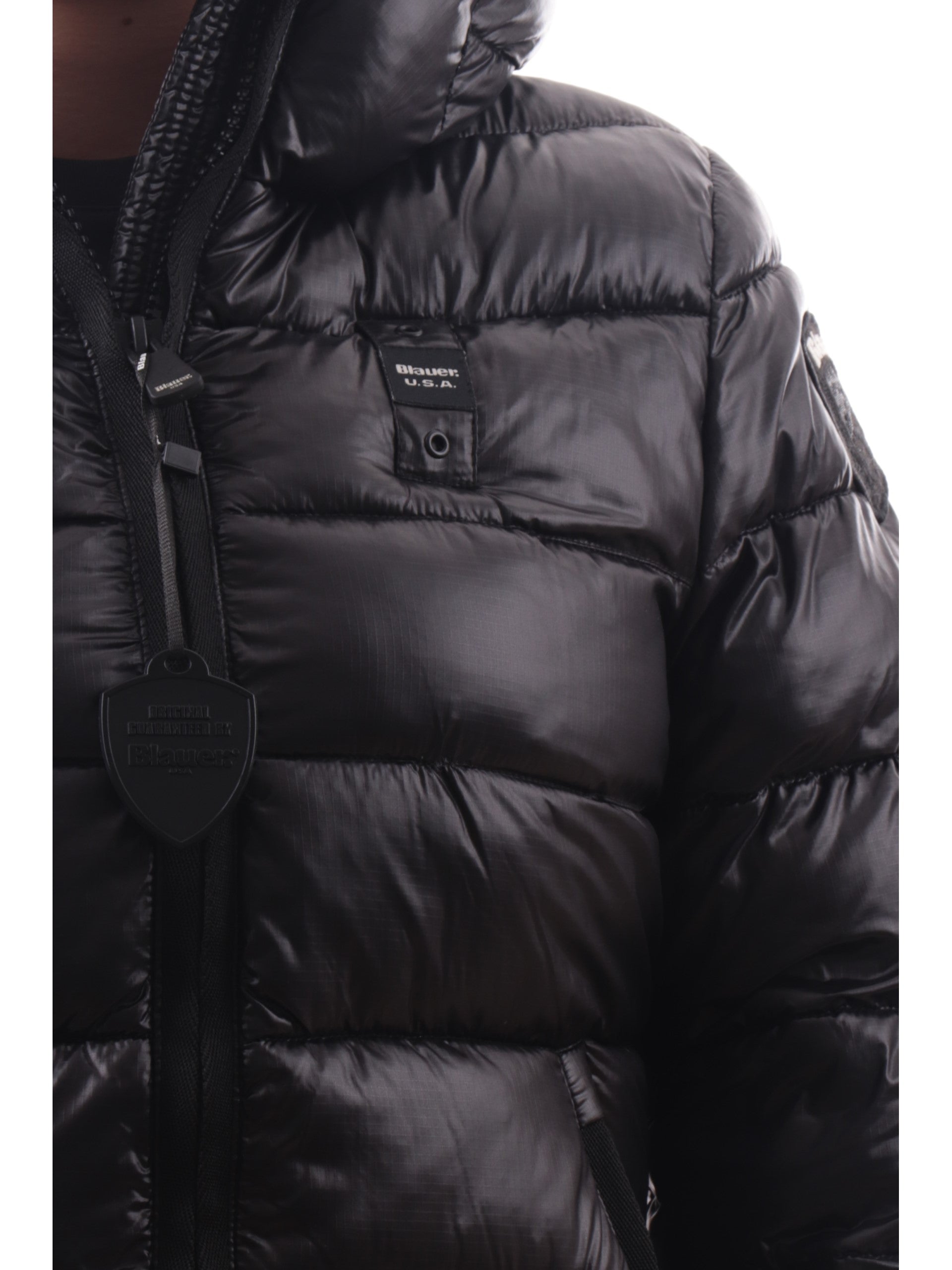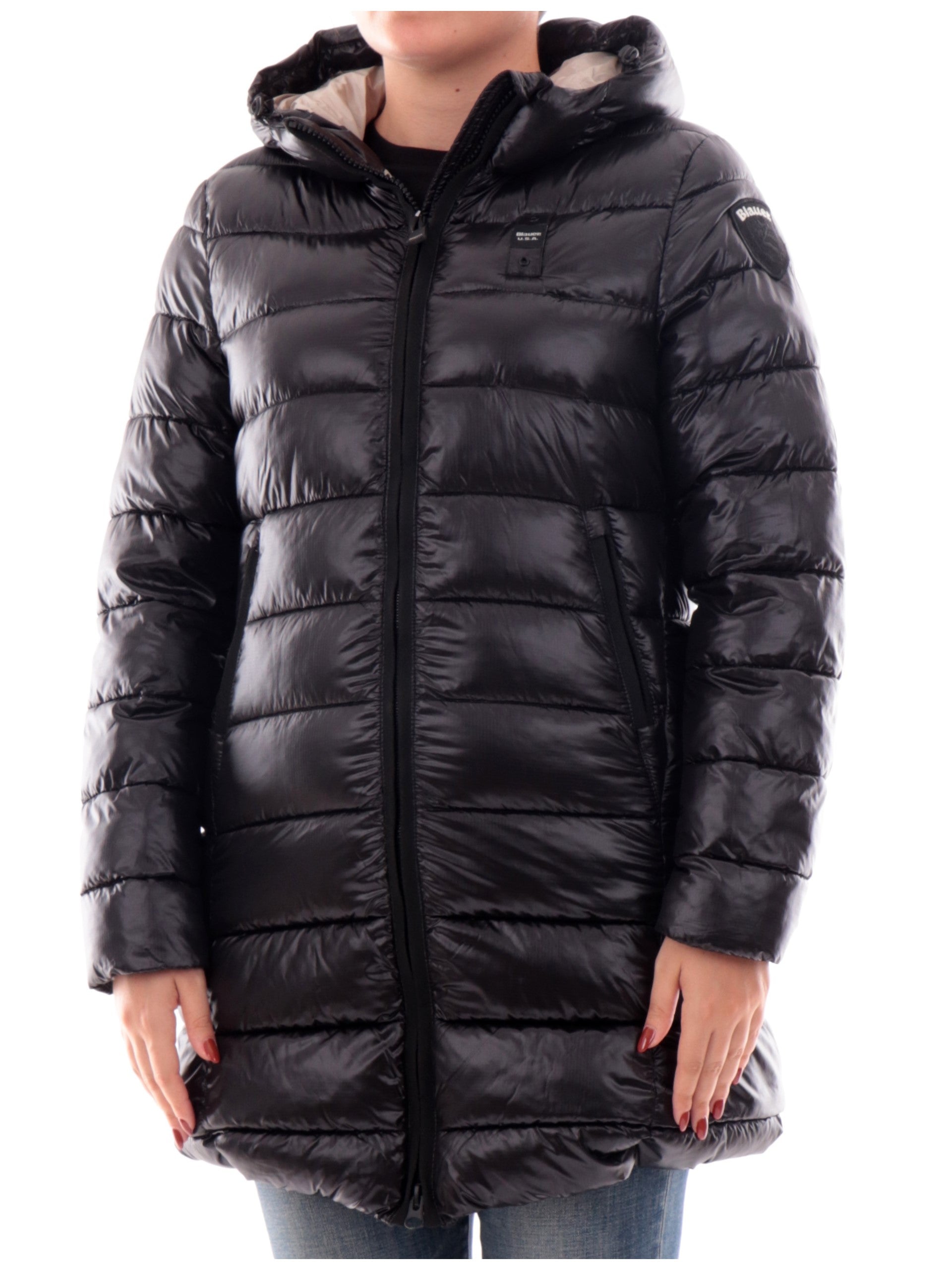 Cappotto Blauer nero da donna Imbottito Adelaide K02069006647, realizzato con imbottitura eco-friendly. Questo trench lungo Blauer nero ha il cappuccio fisso regolabile con coulisse, lo scaldacollo, la chiusura full zip centrale, due tasche laterali con zip e il patch del brand cucito sulla manica sinistra tono su tono.