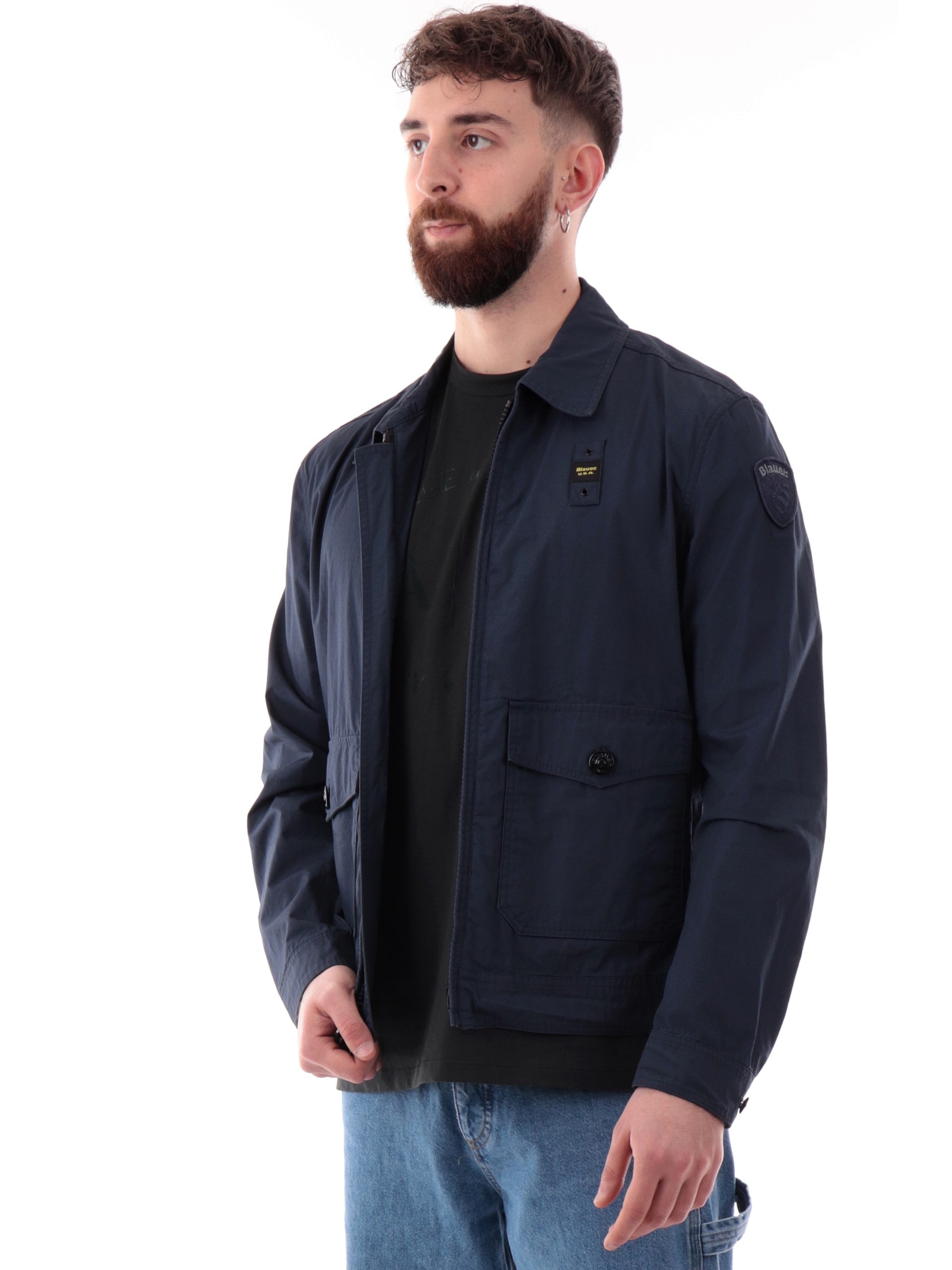 Giacca Blauer blu da uomo con tasconi e colletto alla francese C04176006854, realizzata in 100% puro cotone. Questo giubbino Blauer blu ha il colletto alla francese, la chiusura full zip centrale, due tasconi frontali con patta, fondo regolabile con bottoni e il patch del brand applicato sulla manica sinistra.