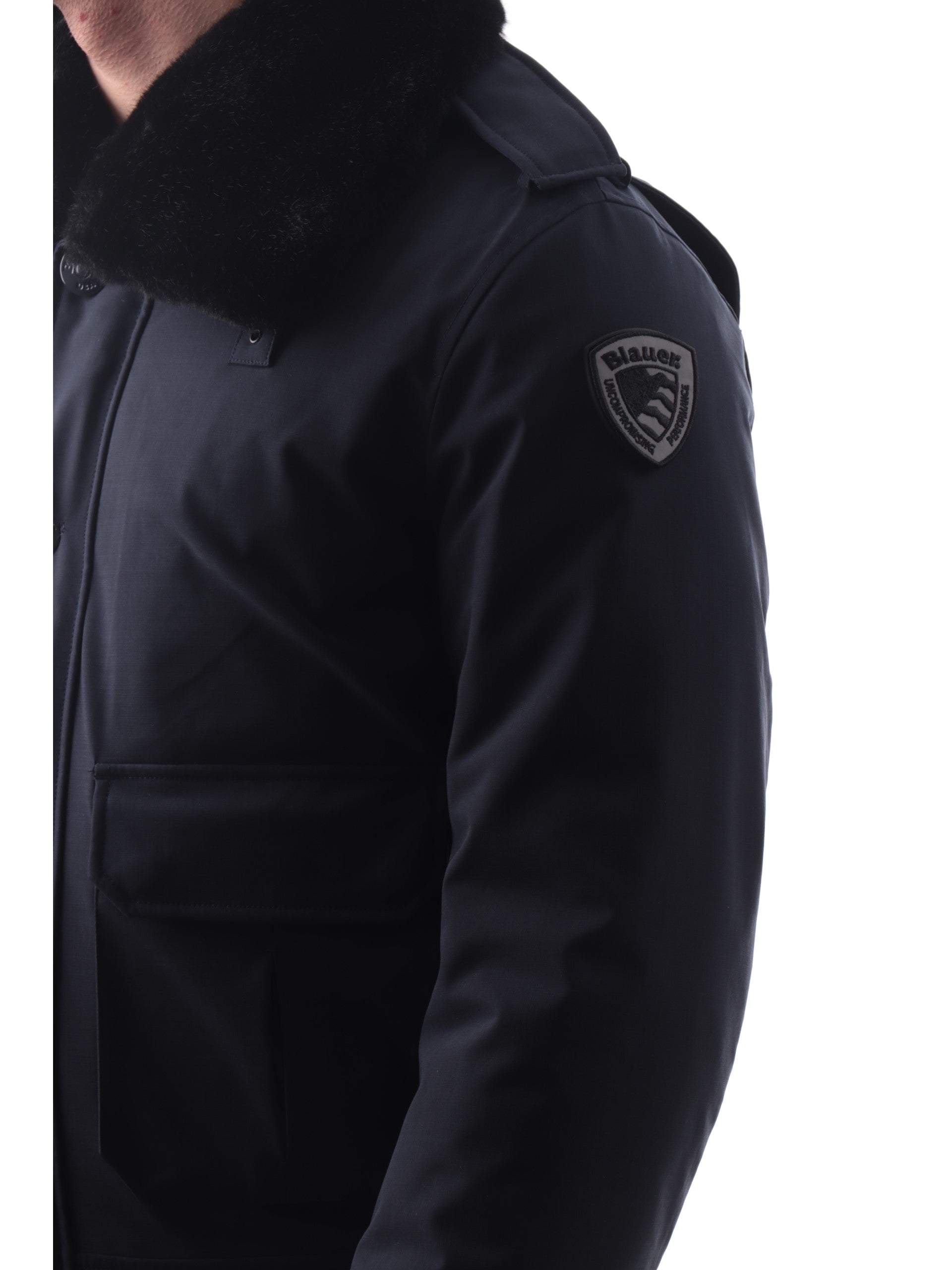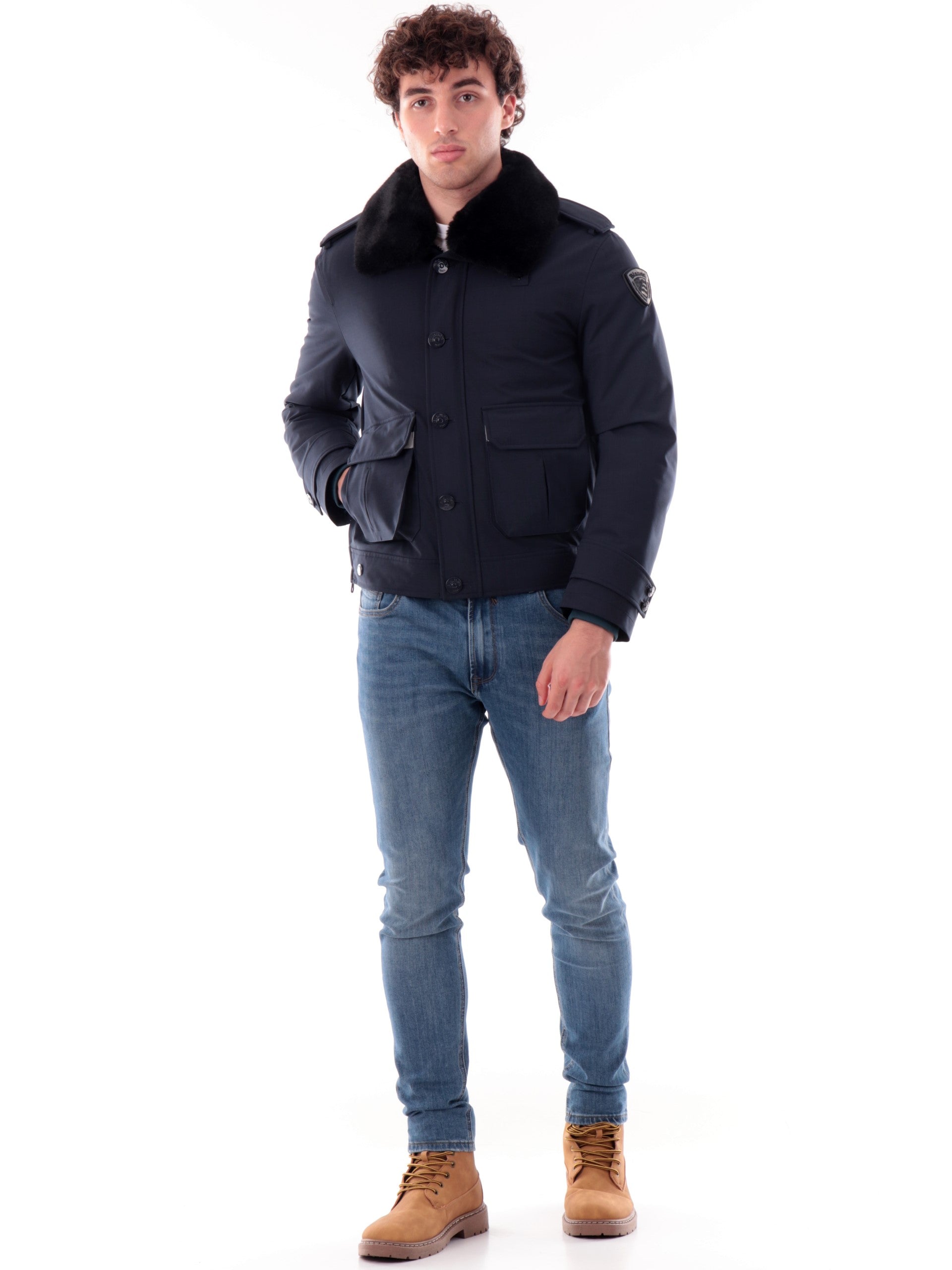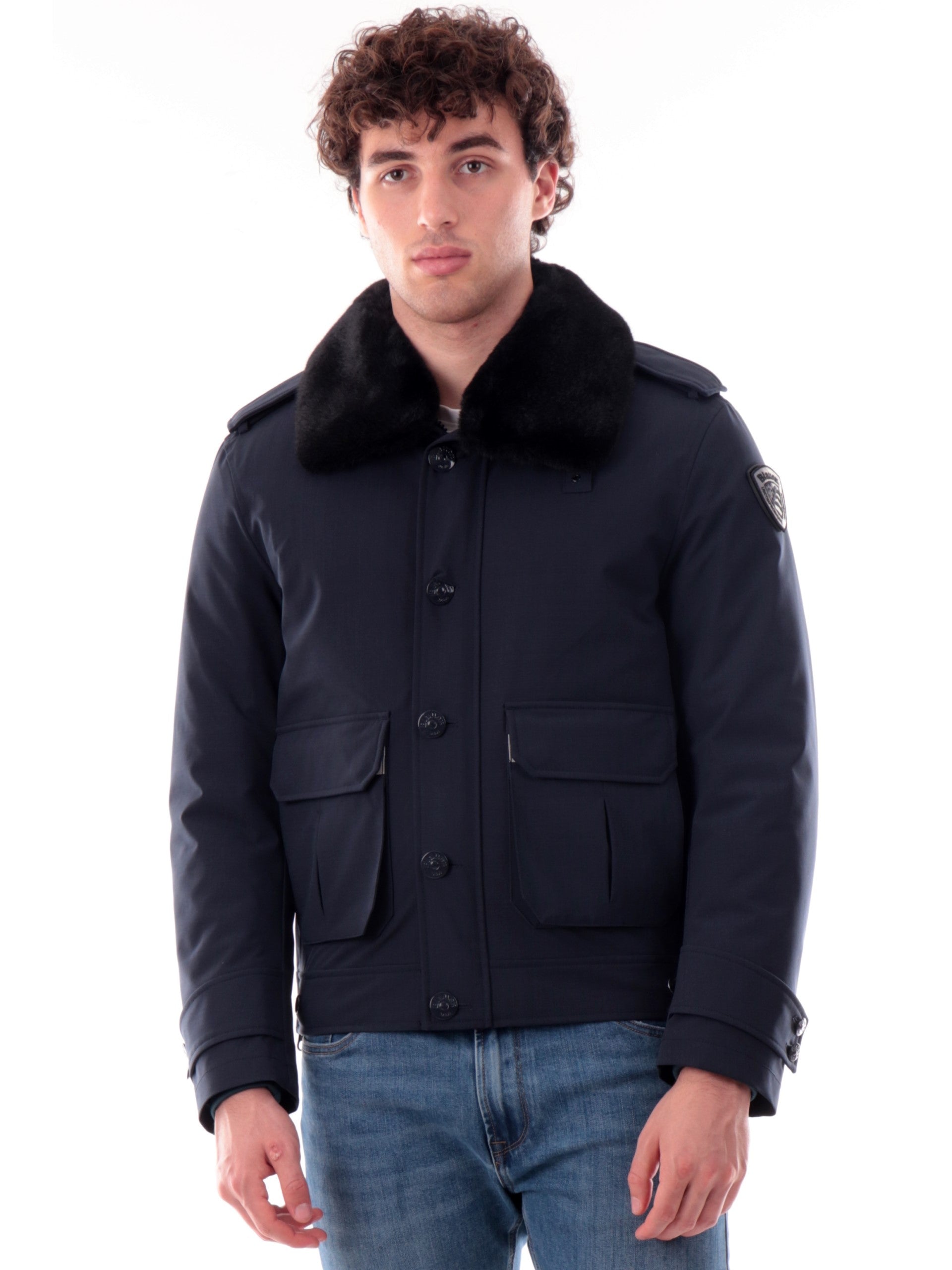 Giacca Blauer blu tessuto tecnico da uomo Ward con pelliccia eco C05125007283. Questo giubbino Blauer blu ha la pelliccia eco rimovibile, la chiusura full zip centrale nascosta da una patta con bottoni, due tasconi frontali con patta e il patch Blauer rimovibile sulla manica sinistra.