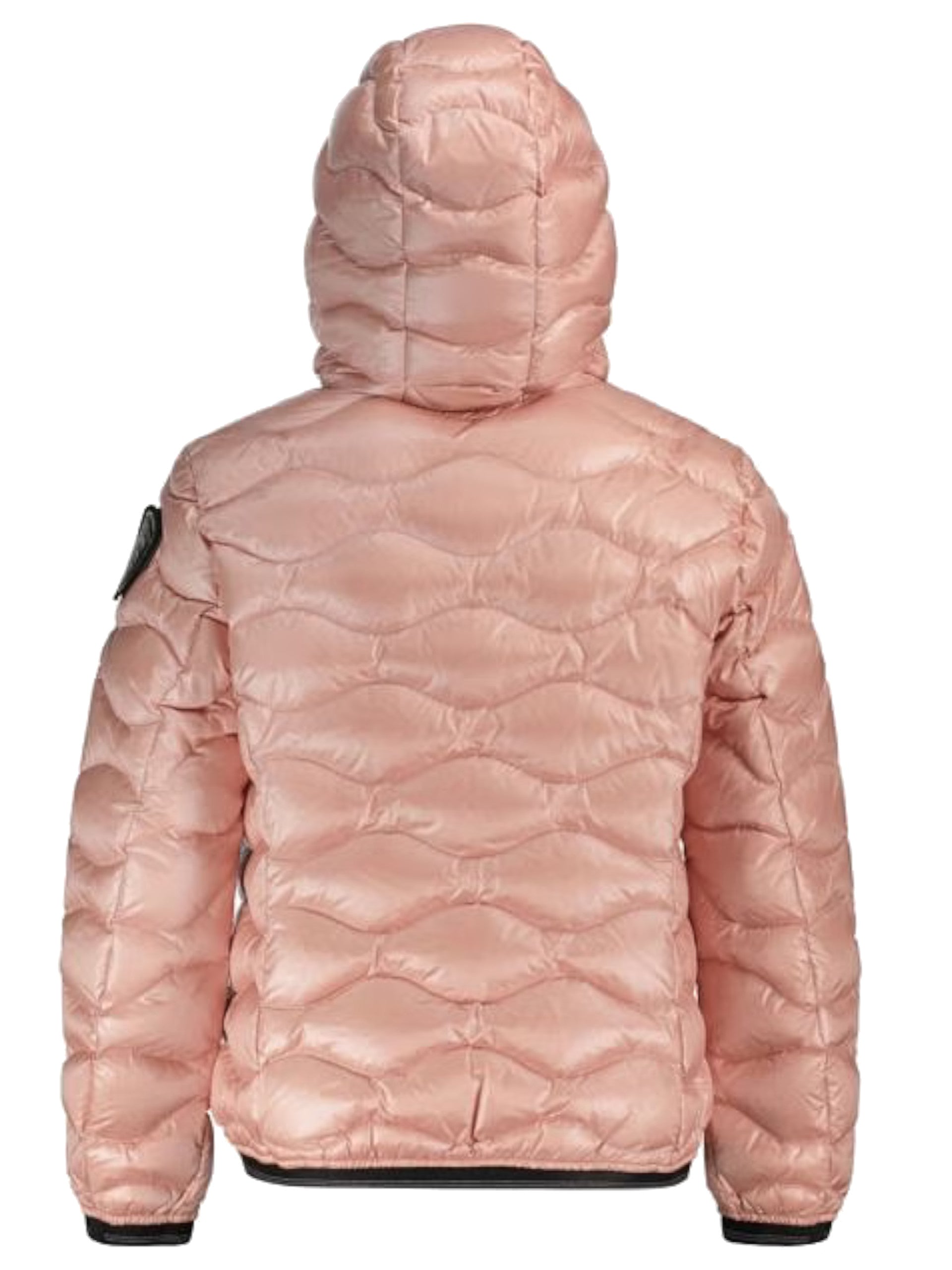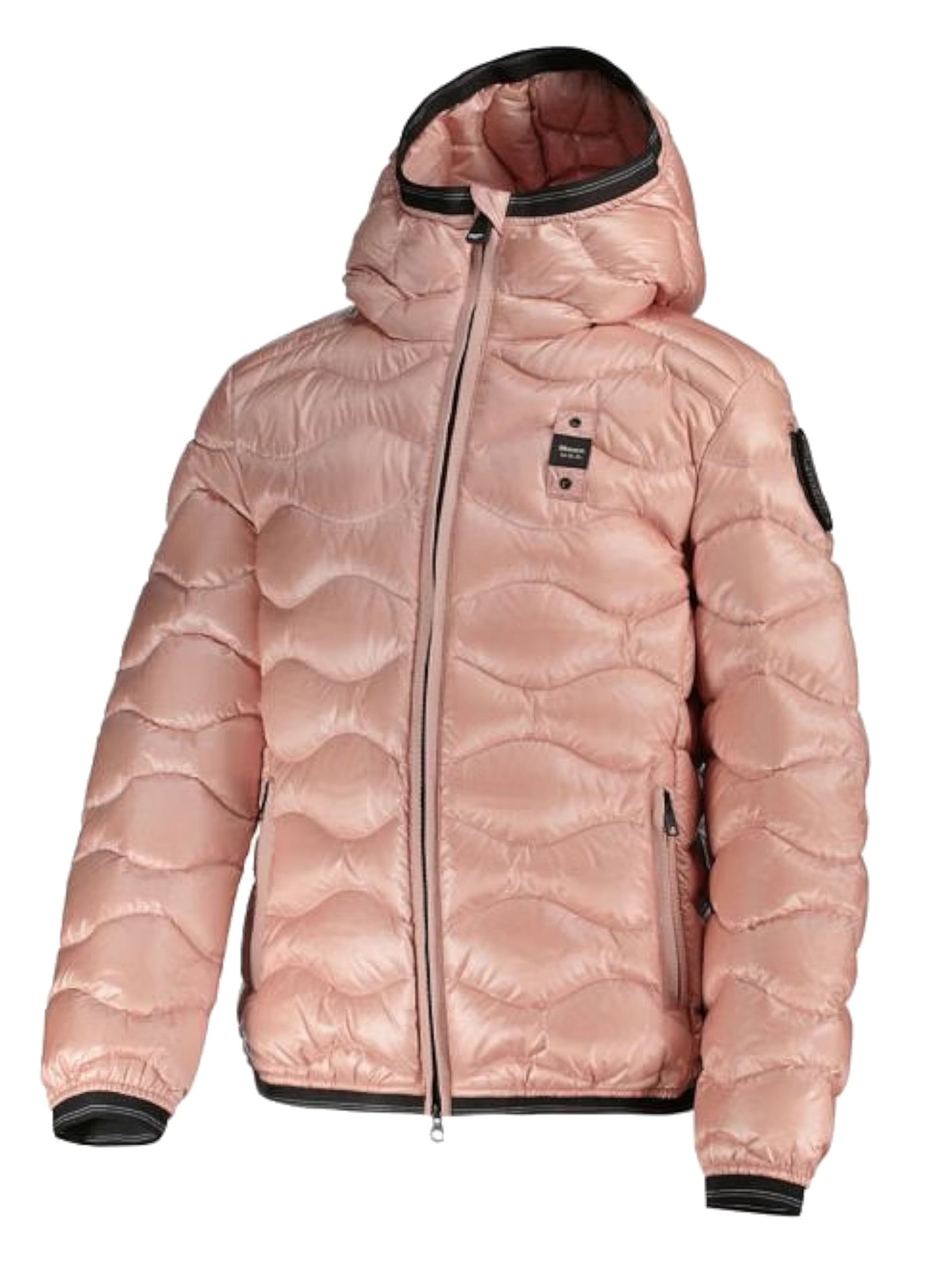 Piumino Blauer rosa cipria onde logo strass Lowell da bambina C03385007285520, realizzato con imbottitura in piuma d'oca. Questo giubbino Blauer onde rosa ha il cappuccio fisso regolabile con coulisse, la chiusura full zip centrale, due tasche laterali con zip e il patch Blauer brillantini removibile sulla manica sinistra con strass