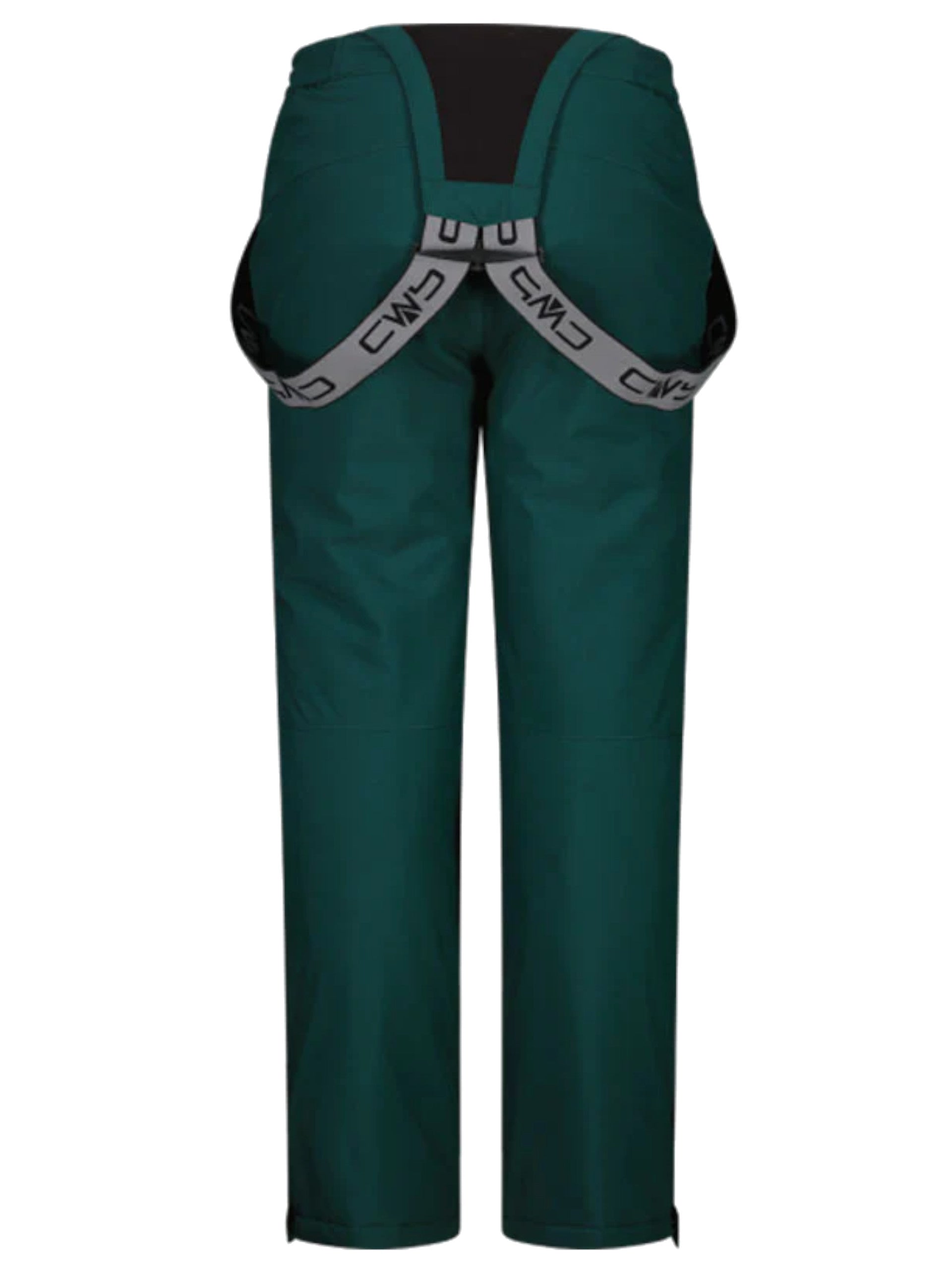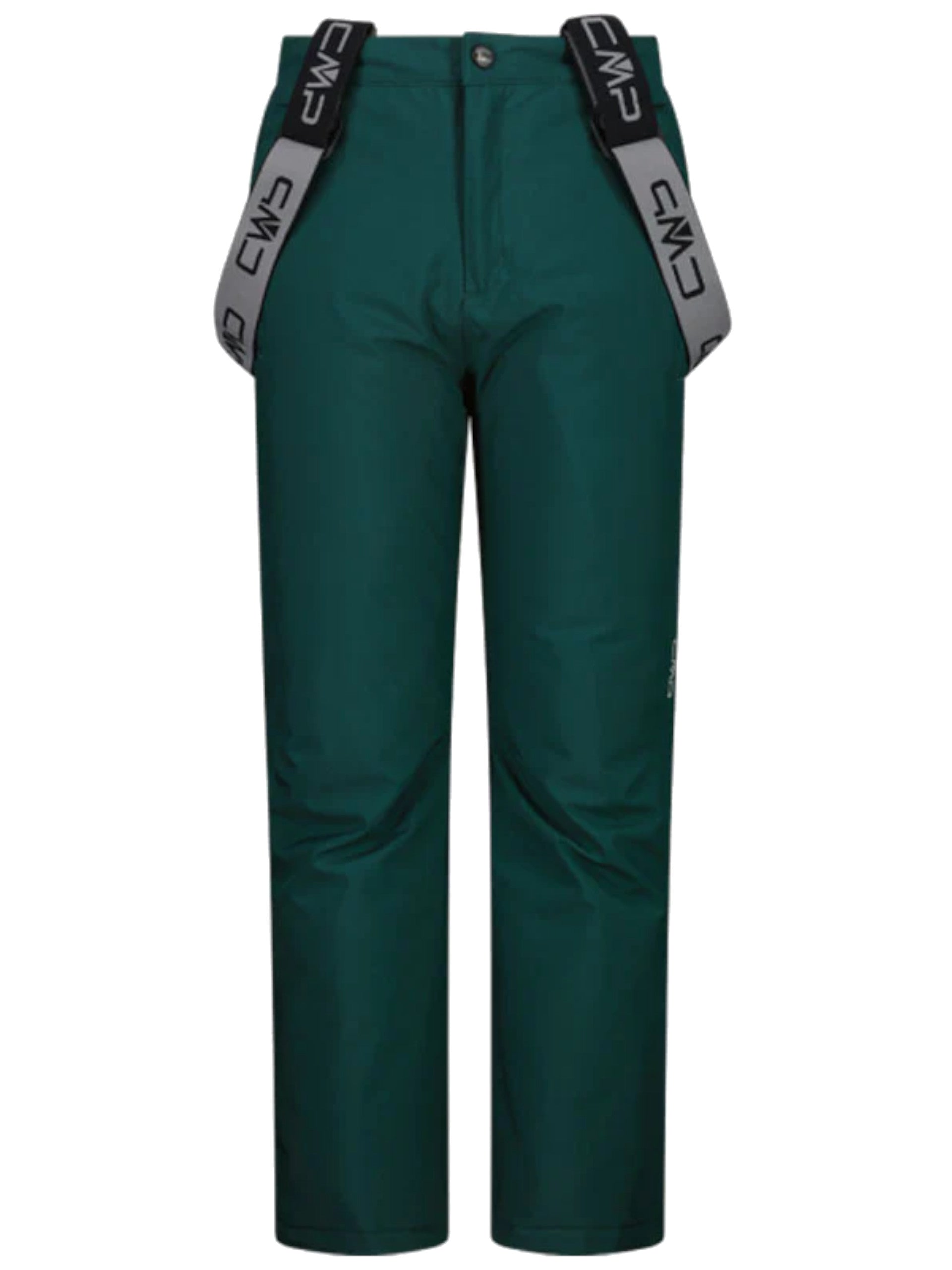 Salopette da sci verde da bambino CMP. Questa salopette da bambina dotata di cuciture termonastrate e tecnologia Clima Protect che garantiscono un buon livello di impermeabilità, traspirabilità, idrorepellenza e protezione. Modello ergonomico, comodo e funzionale grazie alle bretelle regolabili, staccabili sul fronte e alle ghette sul fondo. Questa salopette è caratterizzata dalla chiusura a bottone più zip, due tasche laterali con zip e fondo con zip.