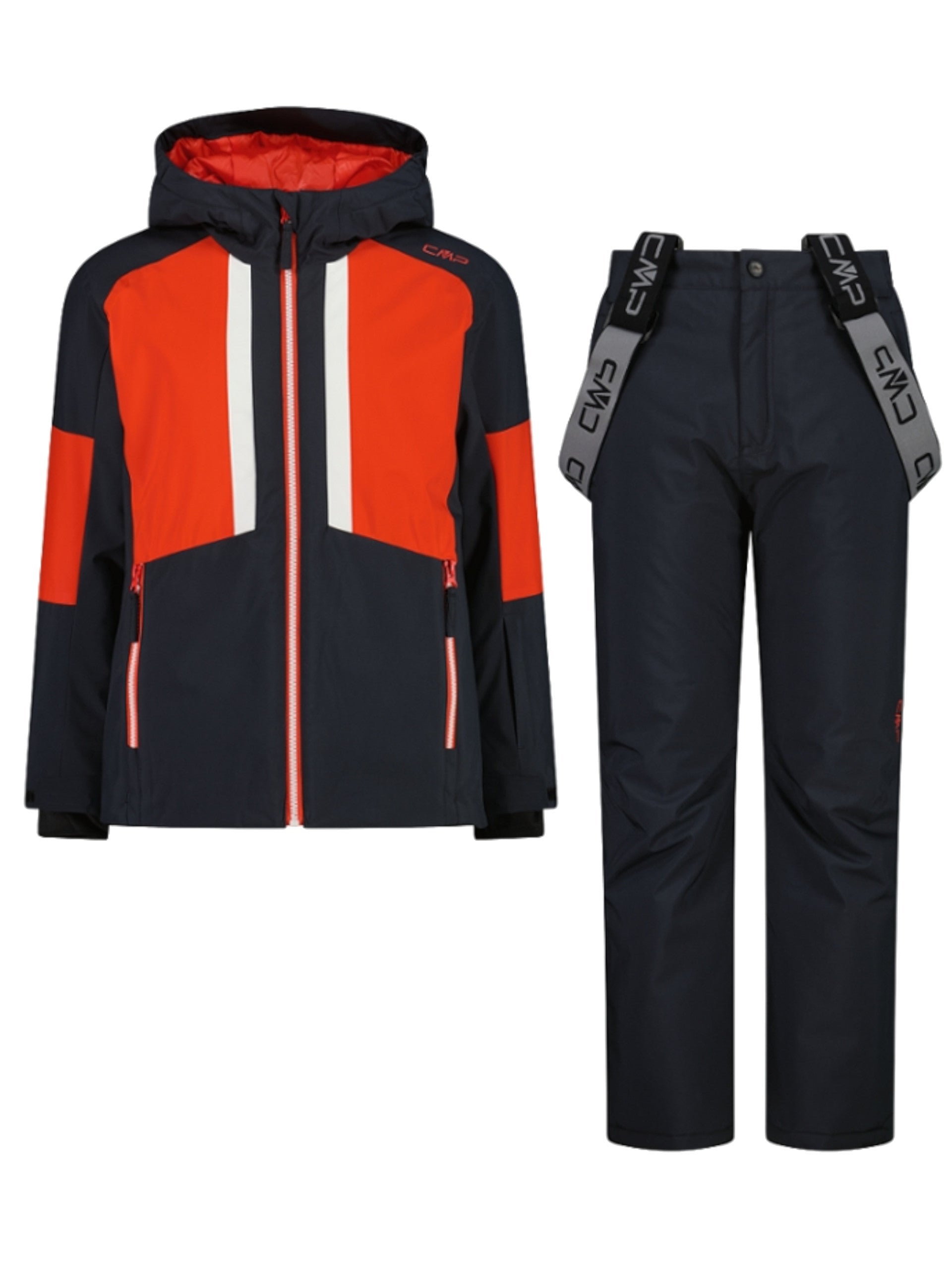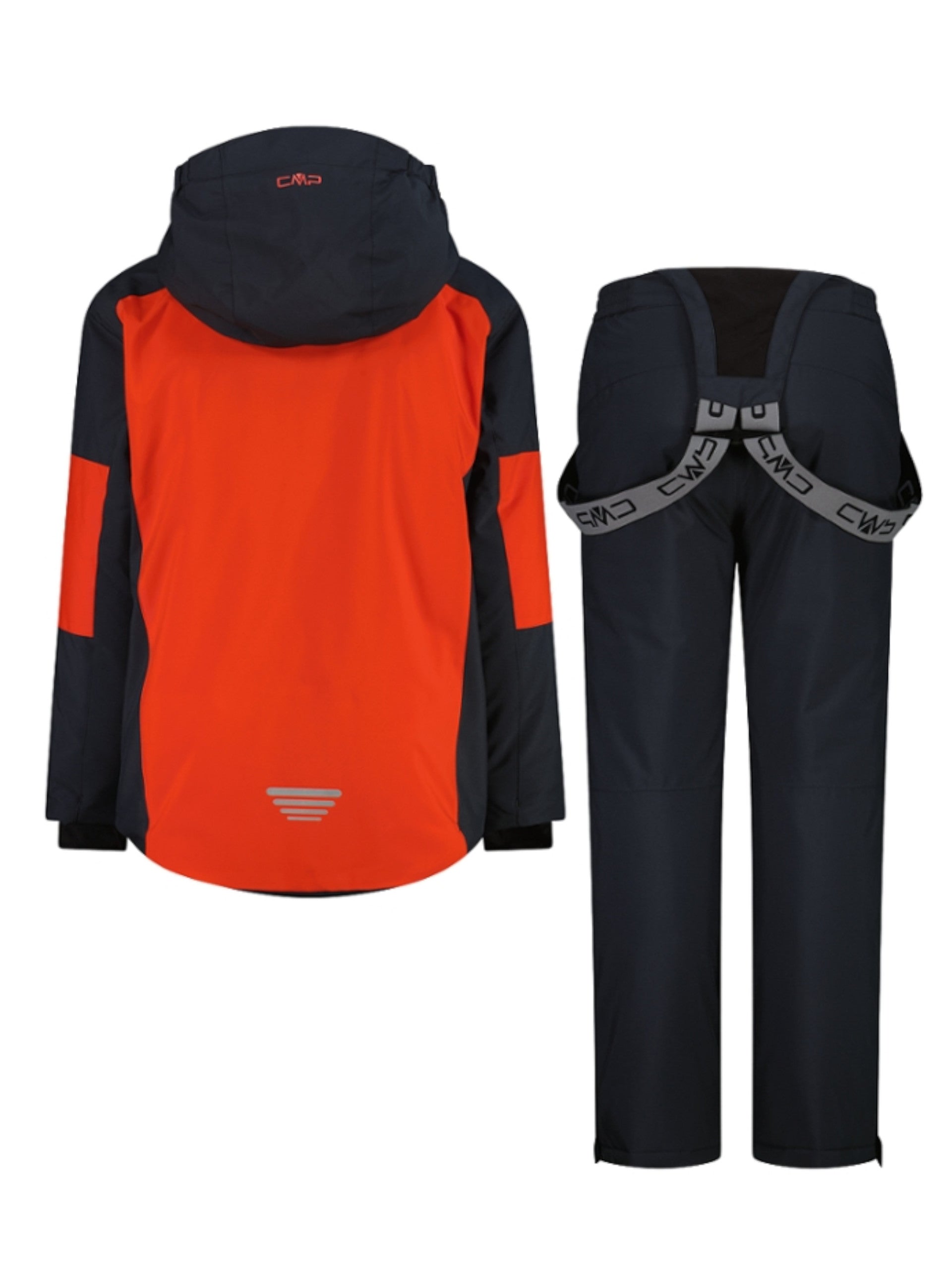Tuta da sci nera da bambino CMP. Questo set da sci composto da giacca con cappuccio fisso e pantaloni con bretelle. L'imbottitura Feel Warm Flat garantisce calore anche in condizioni di freddo e umidità, mentre la membrana Clima Protect, il trattamento esterno water repellent e le cuciture parzialmente nastrate offrono protezione dagli agenti atmosferici mantenendo un'ottima traspirabilità. Giacca con polsini regolabili con velcro e polsini interni in licra con apertura per il pollice, zip frontale con patta antivento e antisfregamento, fondo regolabile con coulisse, due tasche laterali con zip e skipass pocket sulla manica. Pantaloni con bretelle regolabili, ghetta antineve sul fondo, due tasche con zip.