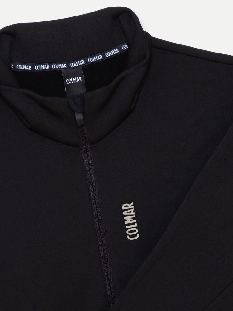 Colmar schwarzes Schnee-Sweatshirt für Herren mit durchgehendem Reißverschluss in der Mitte. Dieses Colmar-Ski-Sweatshirt hat einen hohen Kragen, einen durchgehenden Reißverschluss in der Mitte, lange Ärmel, zwei seitliche Reißverschlusstaschen, elastische Bündchen und einen normalen Saum. Markenlogo auf der Vorderseite in Kontrastfarbe. Dieses Colmar-Sweatshirt eignet sich perfekt zum Tragen unter einer Skijacke.