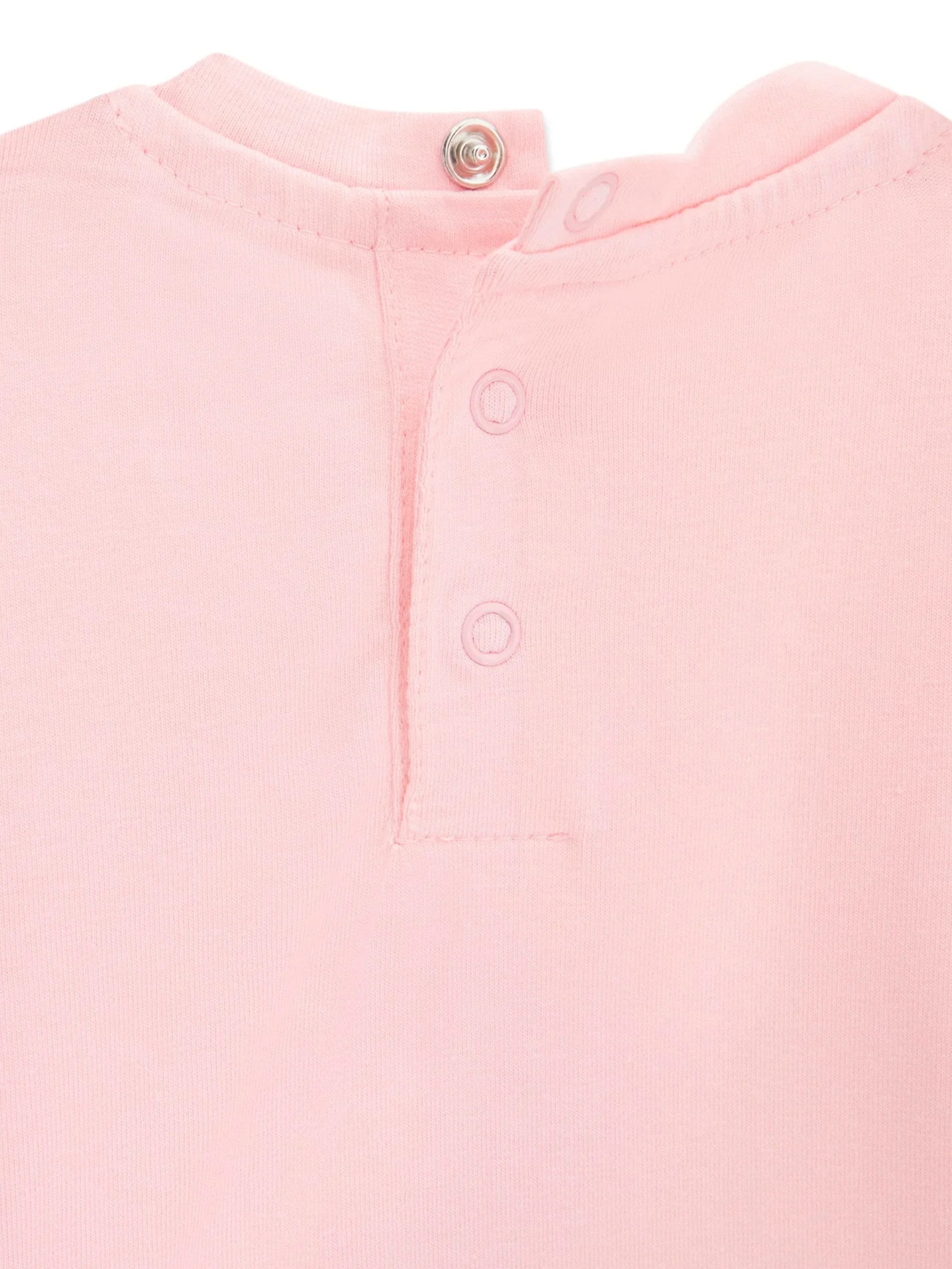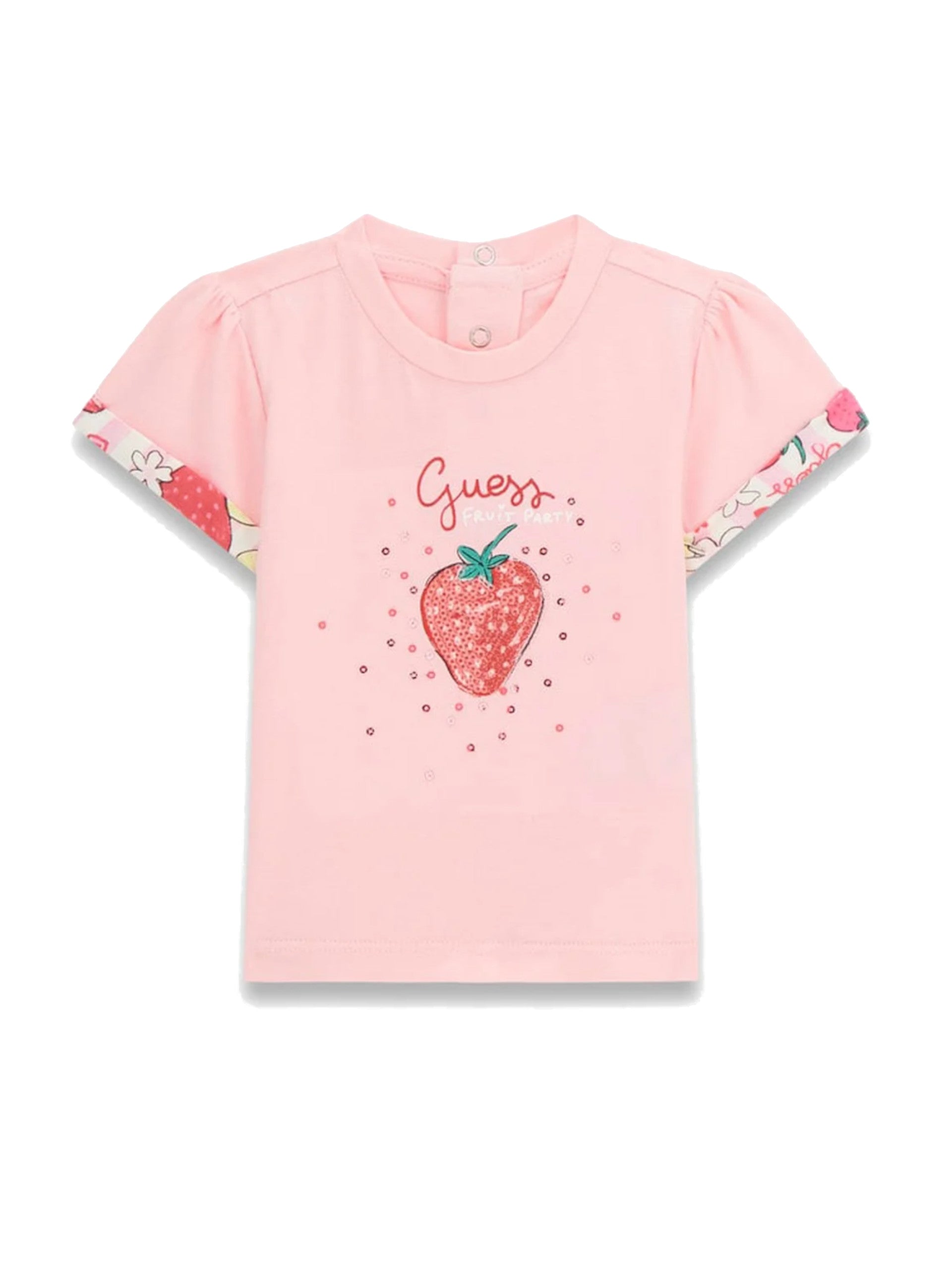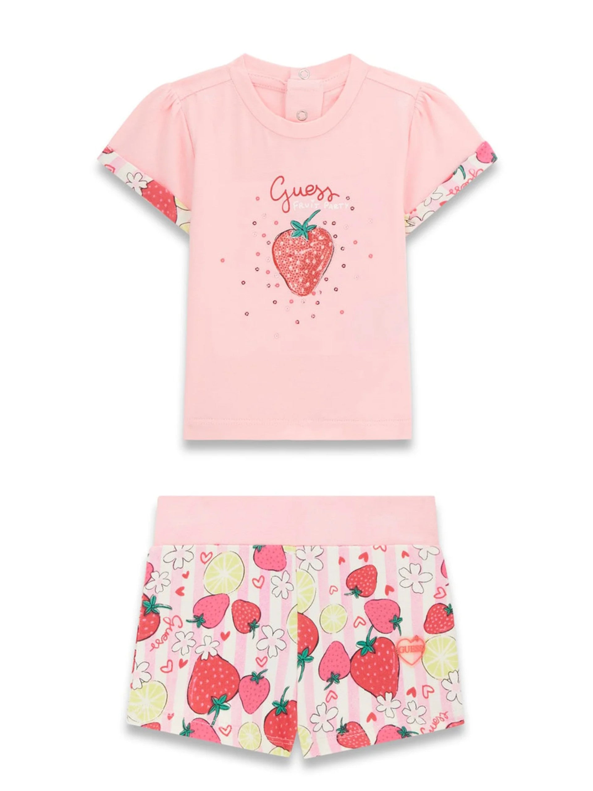 Completo rosa Guess da neonata con stampa fragole. Questo set Guess, realizzato in cotone, perfetto per la stagione estiva, è composto dalla T-shirt rosa e dal pantaloncino. Questa T-shirt rosa, realizzata in cotone è caratterizzata dal girocollo con chiusura a bottone, maniche corte, scritta Guess e la stampa di una fragola con pailletes applicata sul davanti. Il pantaloncino rosa ha la banda elastica sul punto vita, e la stampa fragole