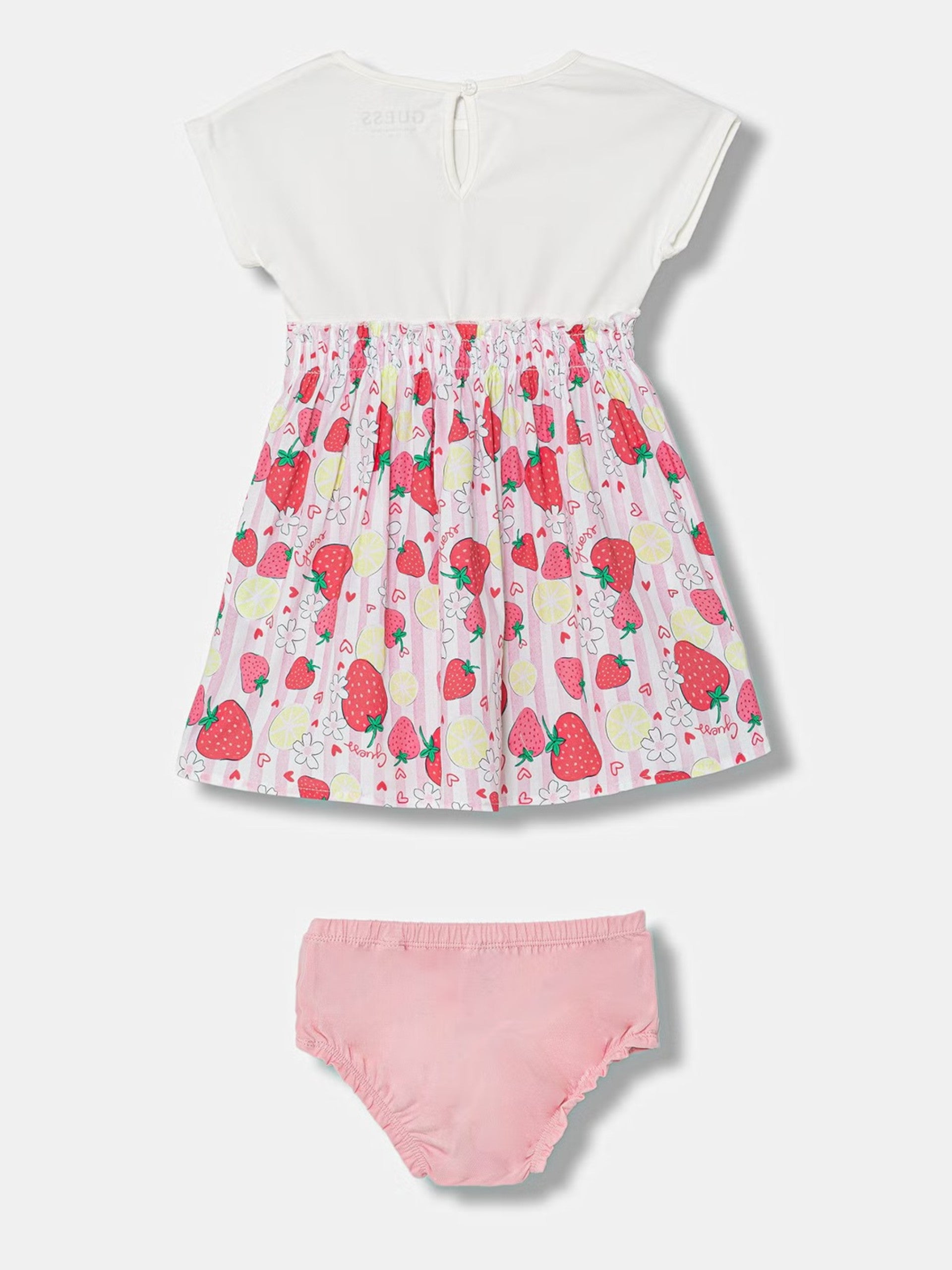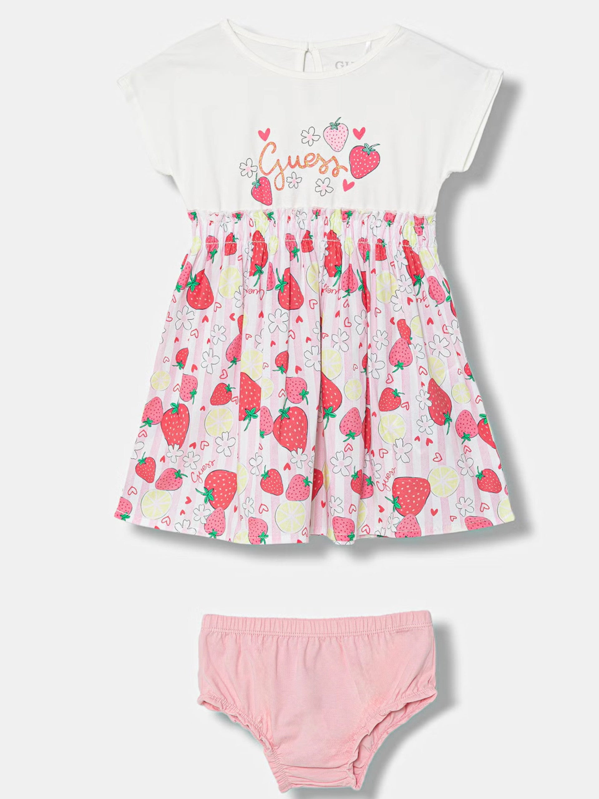 Vestito Guess rosa da neonata con culotte. Questo vestito da bambina, realizzato in cotone, perfetto per la stagione primavera-estate, è caratterizzato dal girocollo con chiusura a bottone, maniche corte, la scritta Guess rosa brillantinata e la stampa con le fragole. QUesto vestito è perfetto sia per le occasioni speciali e sia per tutti i giorni