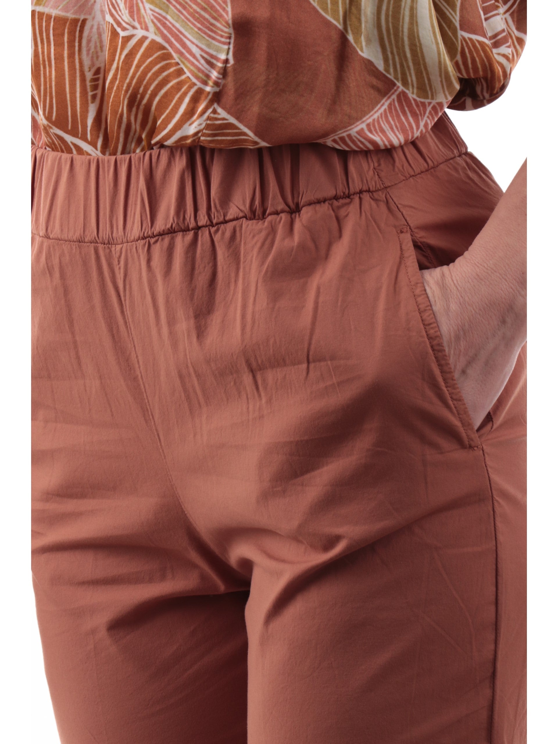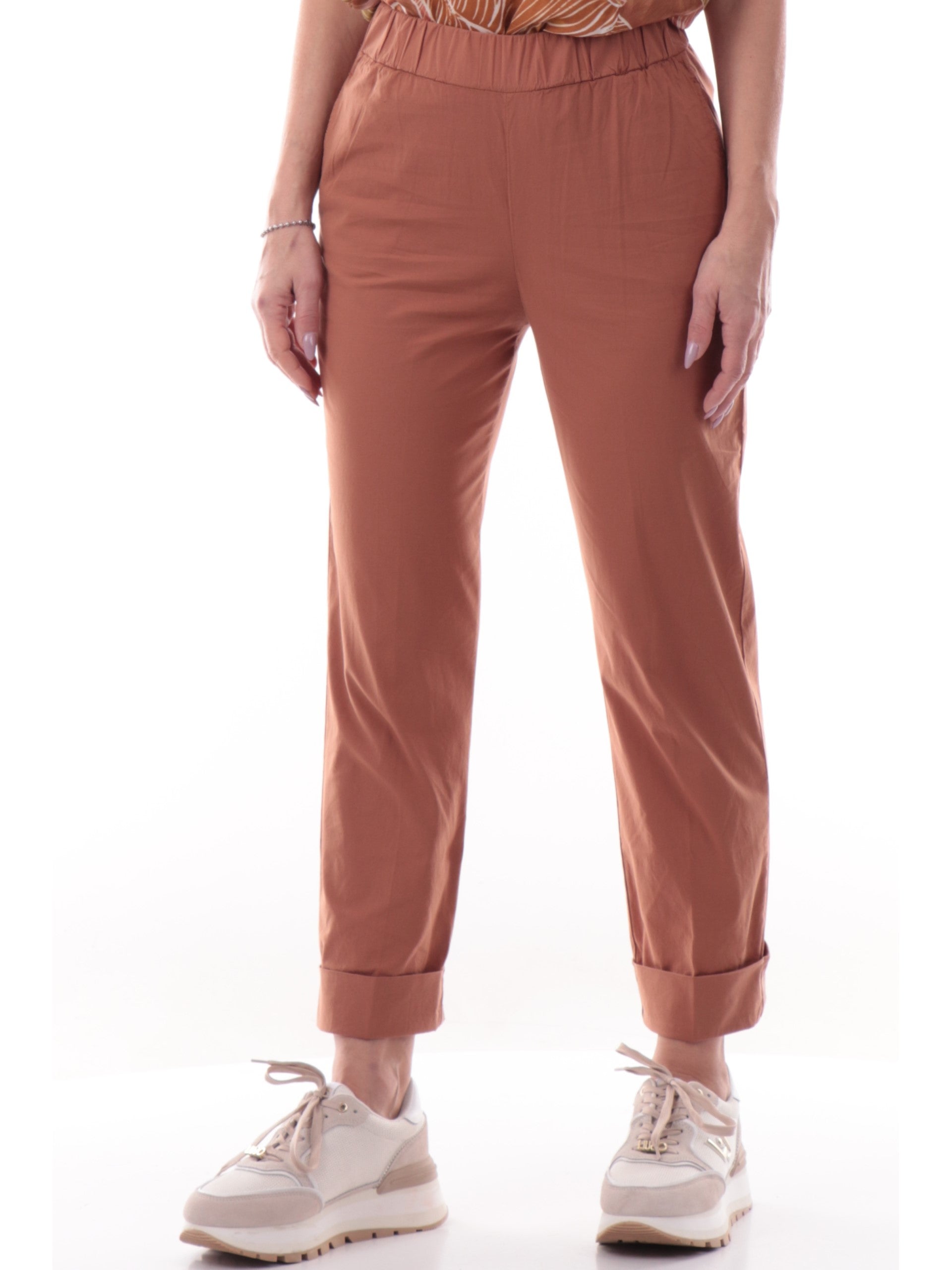 Pantaloni tuta Deha marroni da donna con risvolto Popeline D22488, realizzati in cotone. Questi pantaloni Deha marroni hanno la banda elastica sul punto vita, due tasche laterali aperte e il fondo con risvolto.