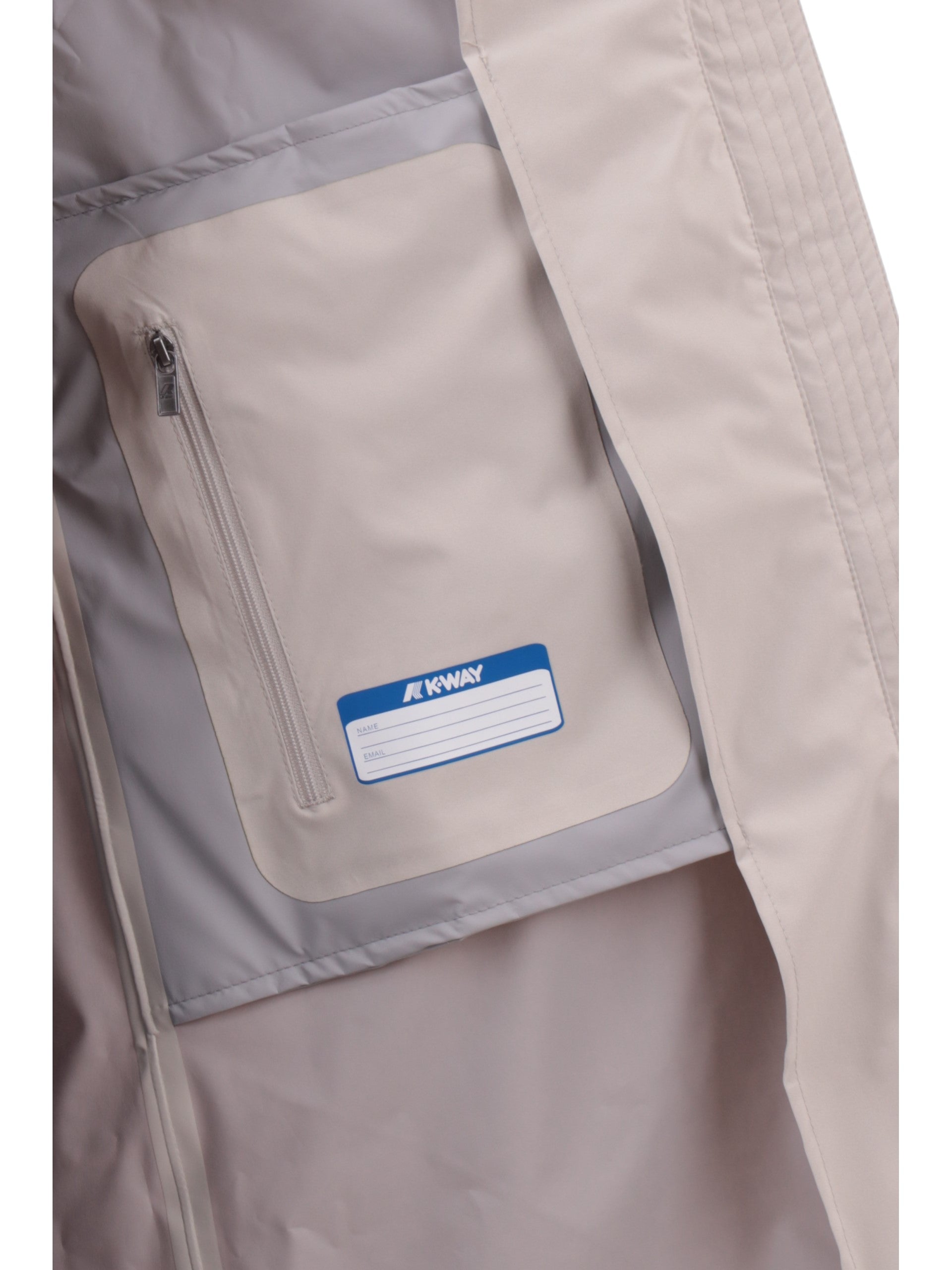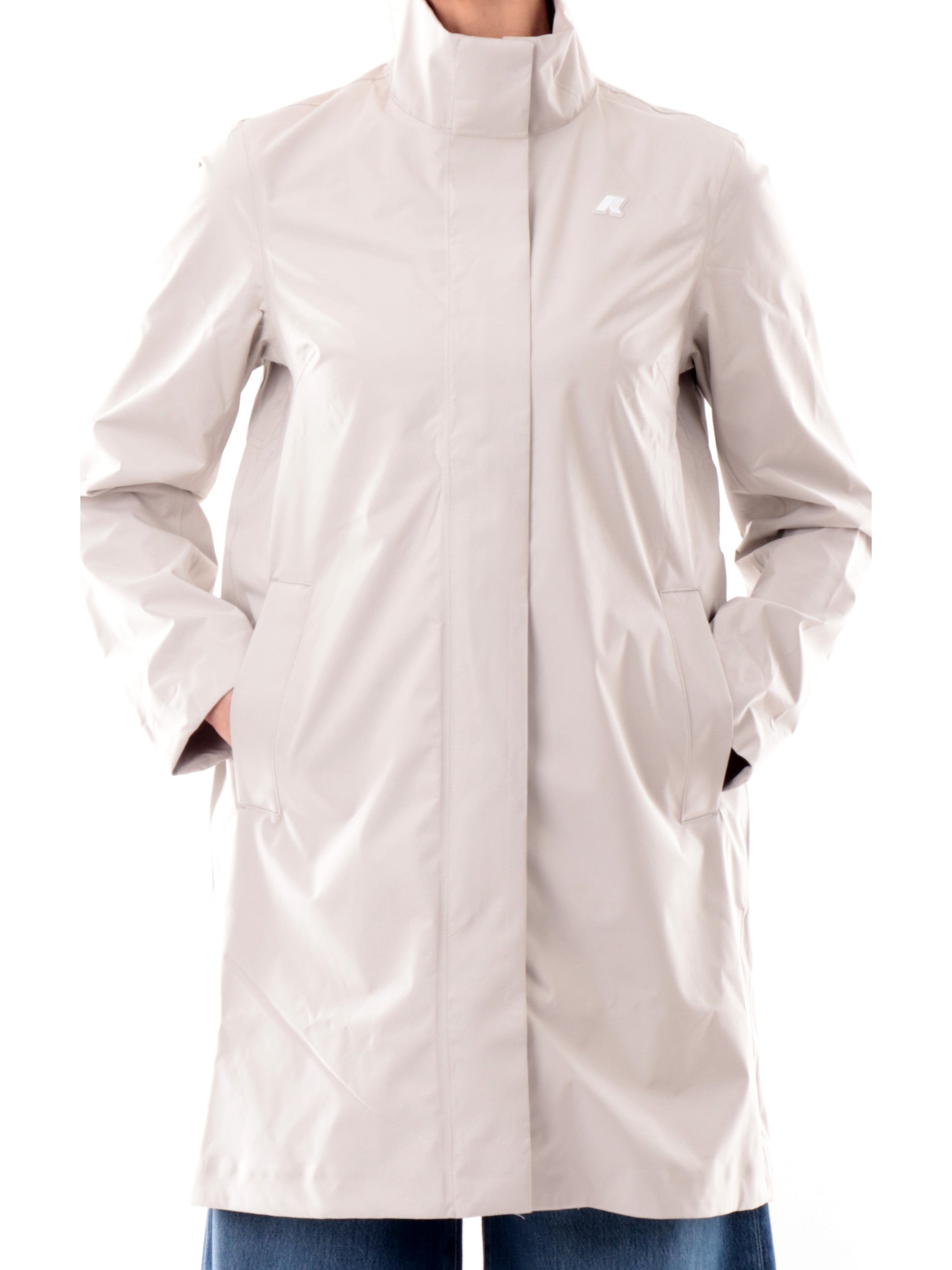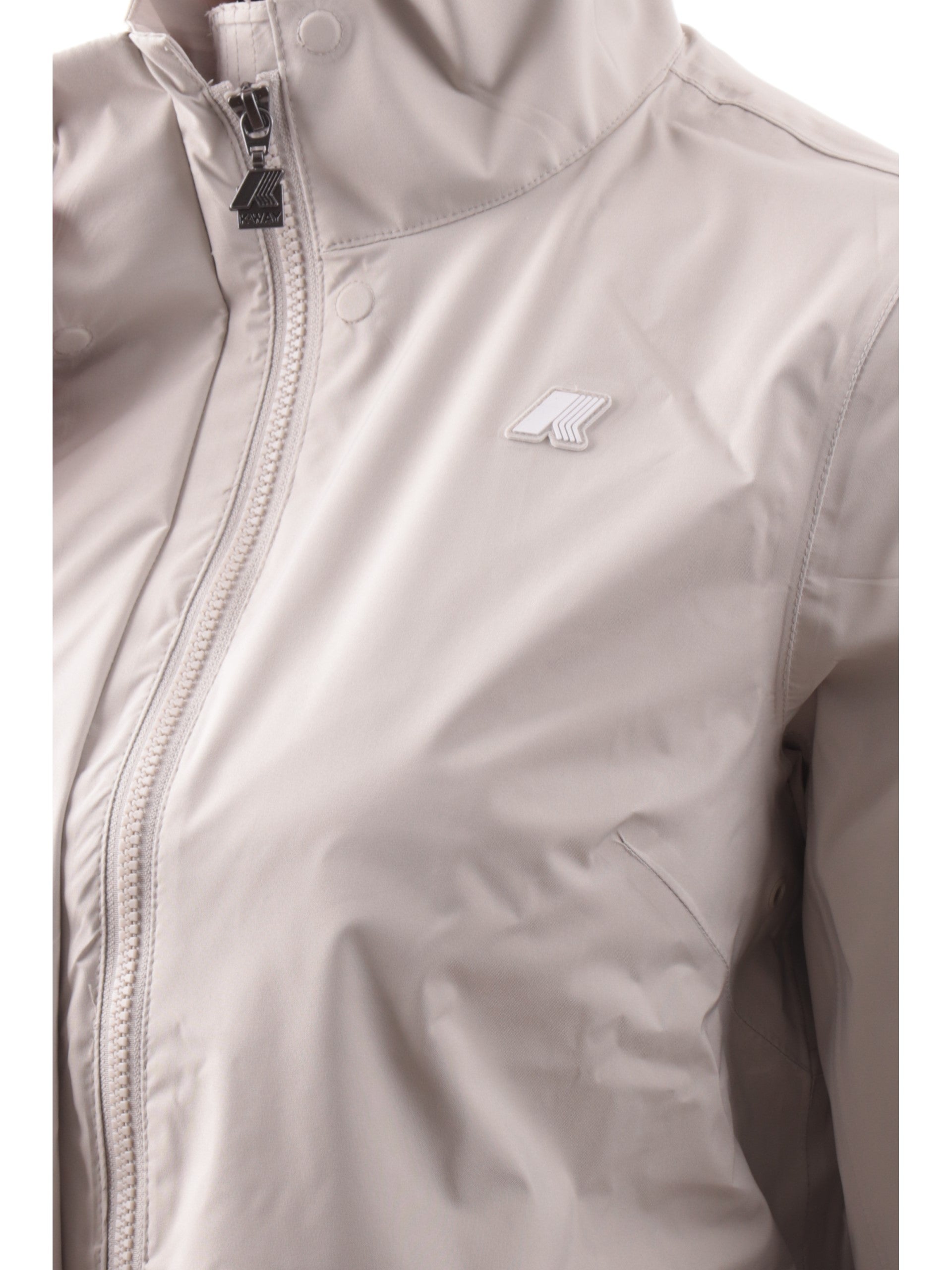 Giacca beige da donna K-Way Dukesse Stretch 2Lay. Questa giacca a tre quarti da donna, ideale per la mezza stagione, è realizzata da un tessuto tecnico stretch, impermeabile e antivento. La giacca è dotata di collo alto e chiusura con zip coperta da patta, due tasche con chiusura magnetica, logo del brand applicato a lato cuore, una tasca interna con zip, polsini regolabili e la vestibilità regular