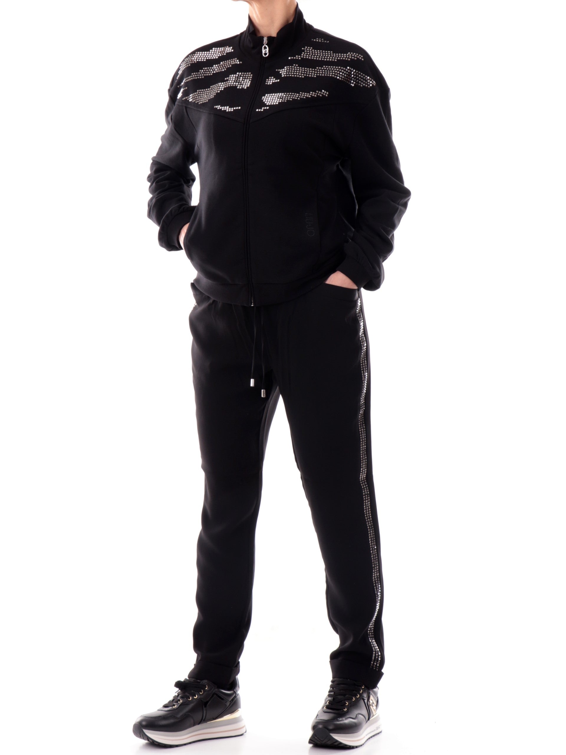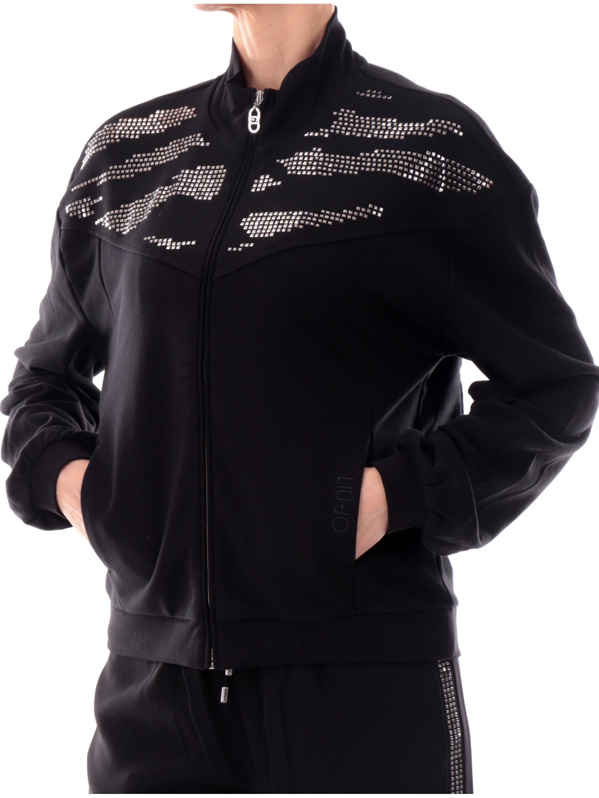 Felpa Liu Jo nera da donna con strass. Questa felpa Liu Jo, realizzata in cotone, è caratterizzata dalla chiusura full zip centrale, due tasche laterali, strass altezza spalle, due tasche laterali aperte di cui la tasca di sinistra con il logo Liu Jo ricamato sopra, polsini e fondo elasticizzati