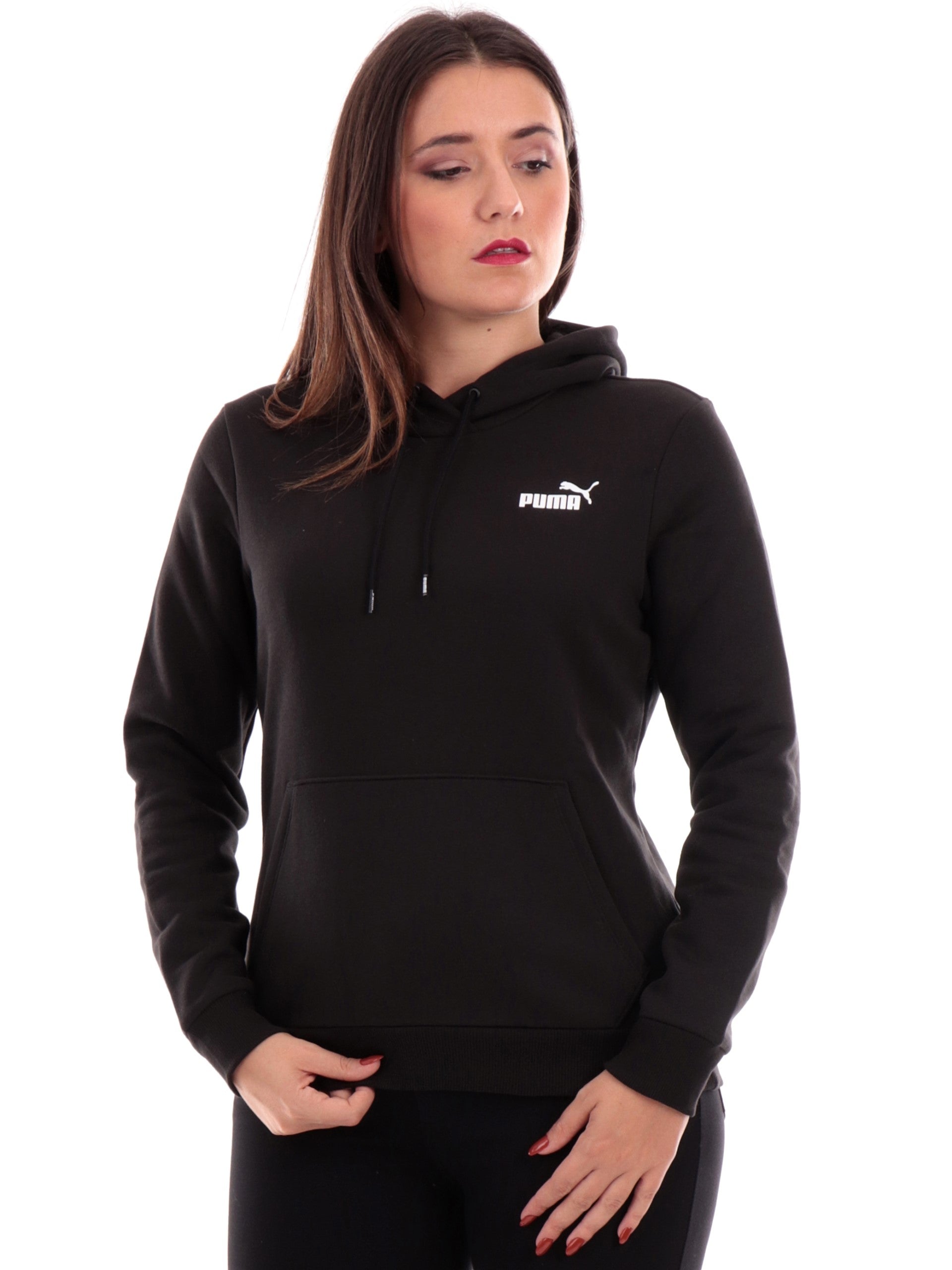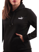Felpa Puma nera da donna con cappuccio 586799, realizzata in morbido cotone. Questa felpa Puma nera ha il cappuccio fisso regolabile con laccetti, una comoda tasca a marsupio, il logo del brand sul cuore, polsini e fondo elasticizzati.