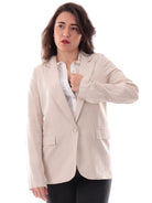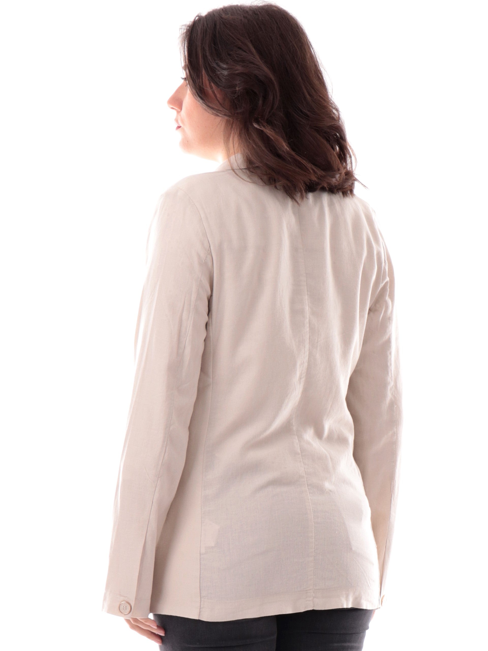 Giacca cerimonia Yes Zee lino beige da donna con rever G436V600. Questa giacca donna Yes Zee beige ha il rever, la chiusura con bottone, due taschini frontali con patta e la composizione in lino che la rende perfetta per le cerimonie estive.