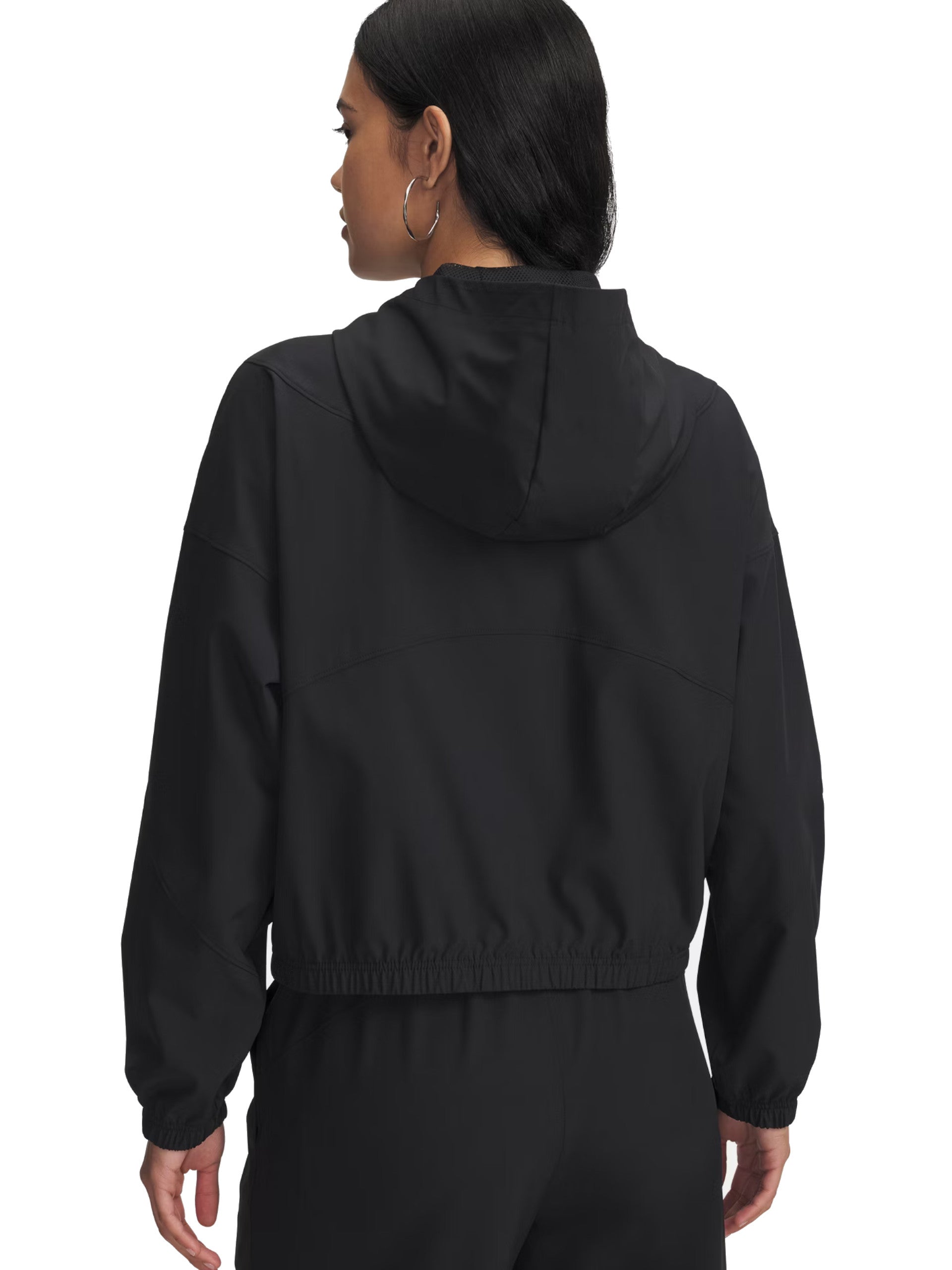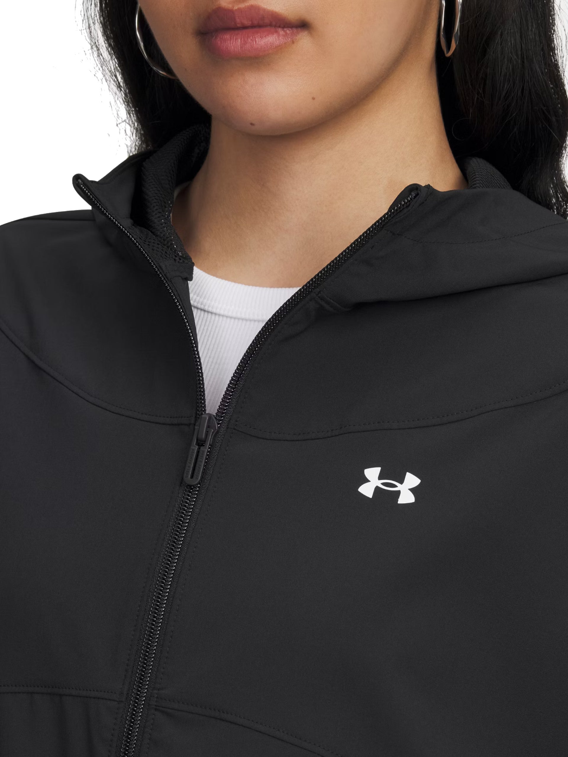 Felpa nera da donna Rival Woven Under Armour. Questa felpa nera, realizzata dalla tecnologia UA Storm che respinge l'acqua e offre massima traspirabilità e dal tessuto elasticizzato che è leggero e resistente e asseconda i tuoi movimenti. QUesta felpa da donna è caratterizzata dal cappuccio fisso, chiusura centrale full zip, due tasche laterali aperte, polsini e fondo elasticizzati