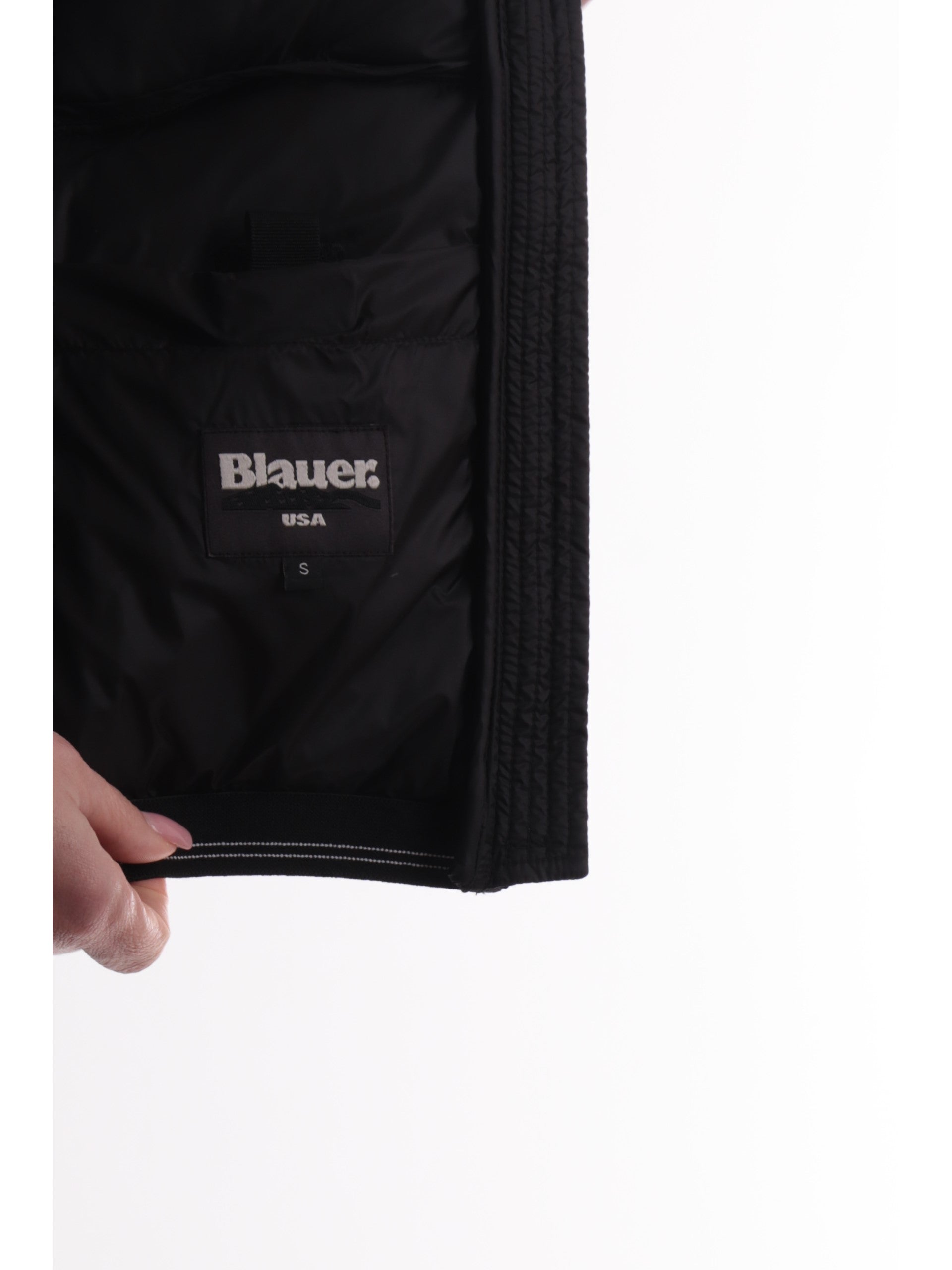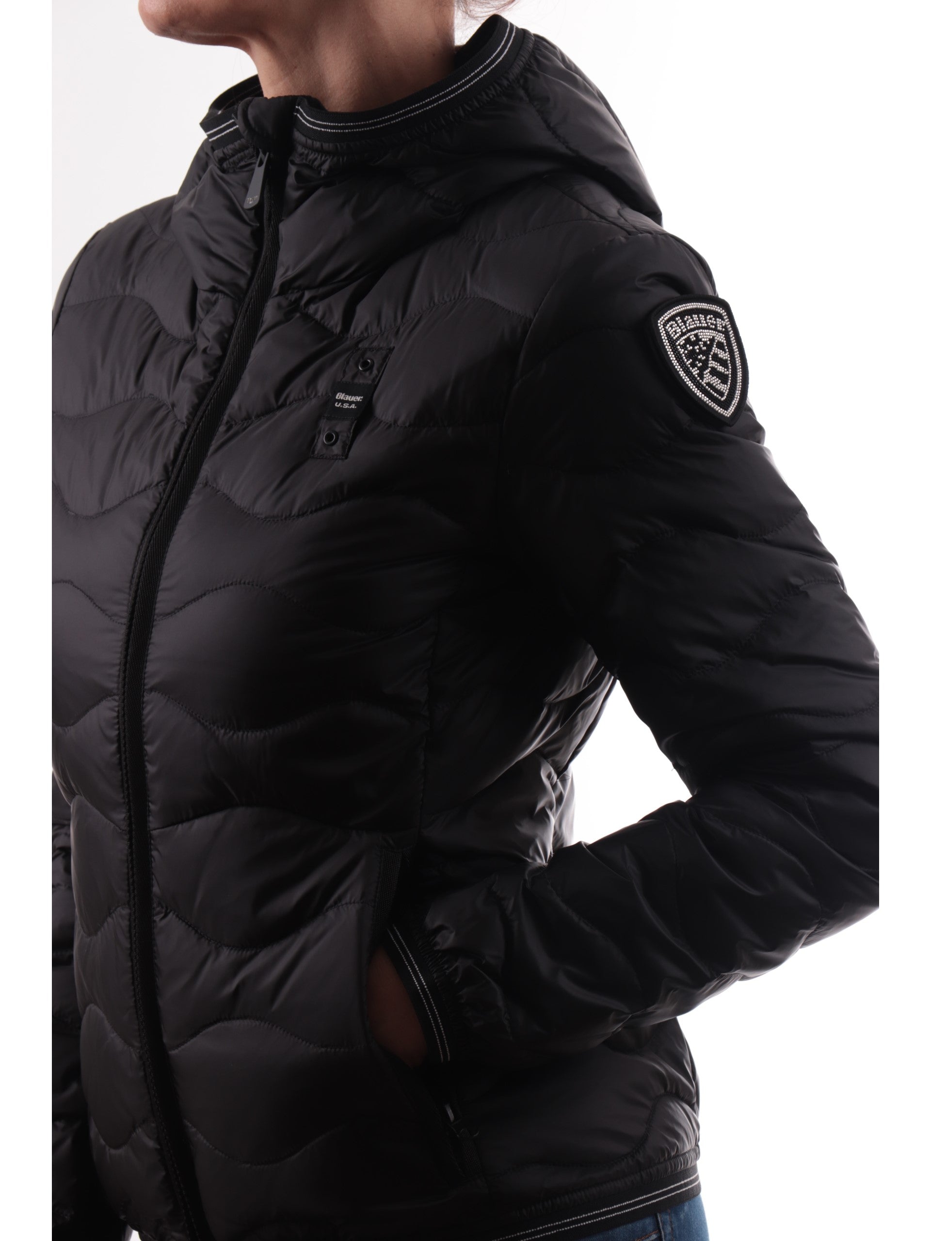 Piumino Blauer nero da donna a onde Camelia. Questo piumino nero, realizzato in vera piuma, perfetta per la stagione primavera, è caratterizzata dal cappuccio fisso, chiusura full zip centrale, due tasche con zip laterali, due tasche interne, il patch Blauer, con strass, è applicato sulla manica sinistra, polsini e fondo con bordi elasticizzati. Questa Giacca Blauer Onda da Donna è l'iconico piumino donna Blauer