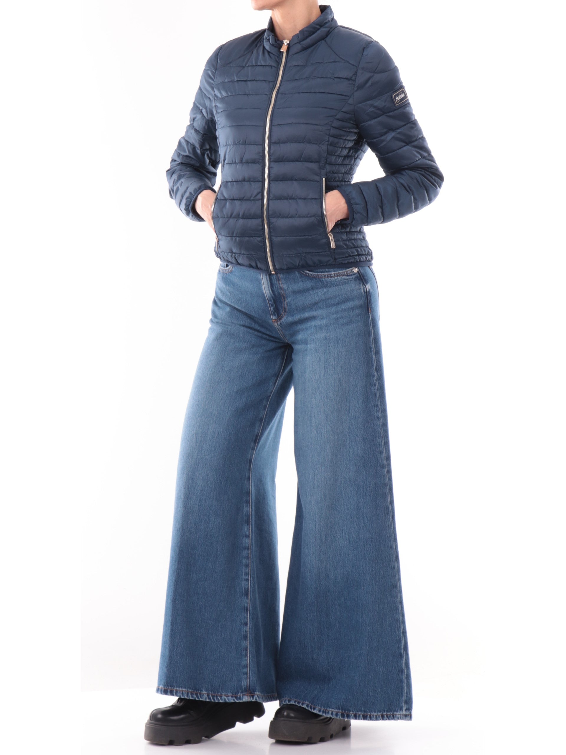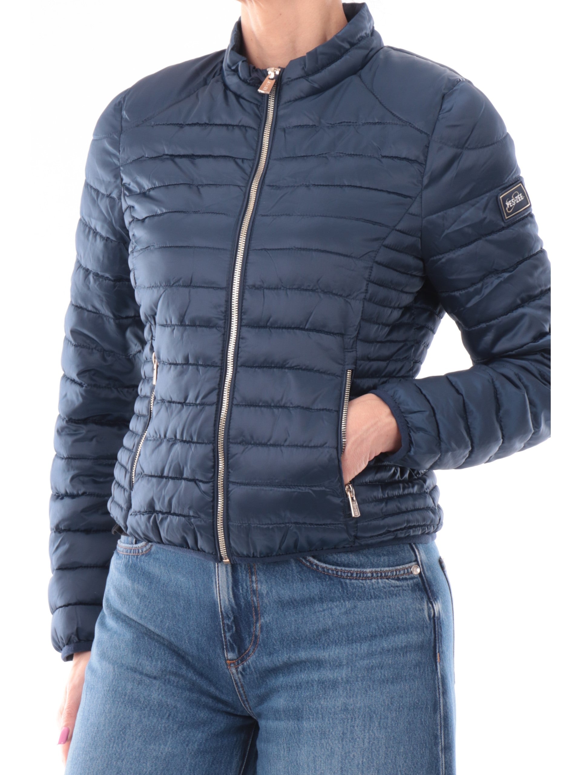 Piumino trapuntato blu da donna Yes Zee. Questo piumino da donna, realizzato da un tessuto morbido e leggero al tatto e impermeabile, perfetto per la stagione primaverile, è caratterizzato dalla chiusura full zip centrale, due tasche laterali con zip, logo del brand applicato sulla manica sinistra, polsini e fondo elasticizzati
