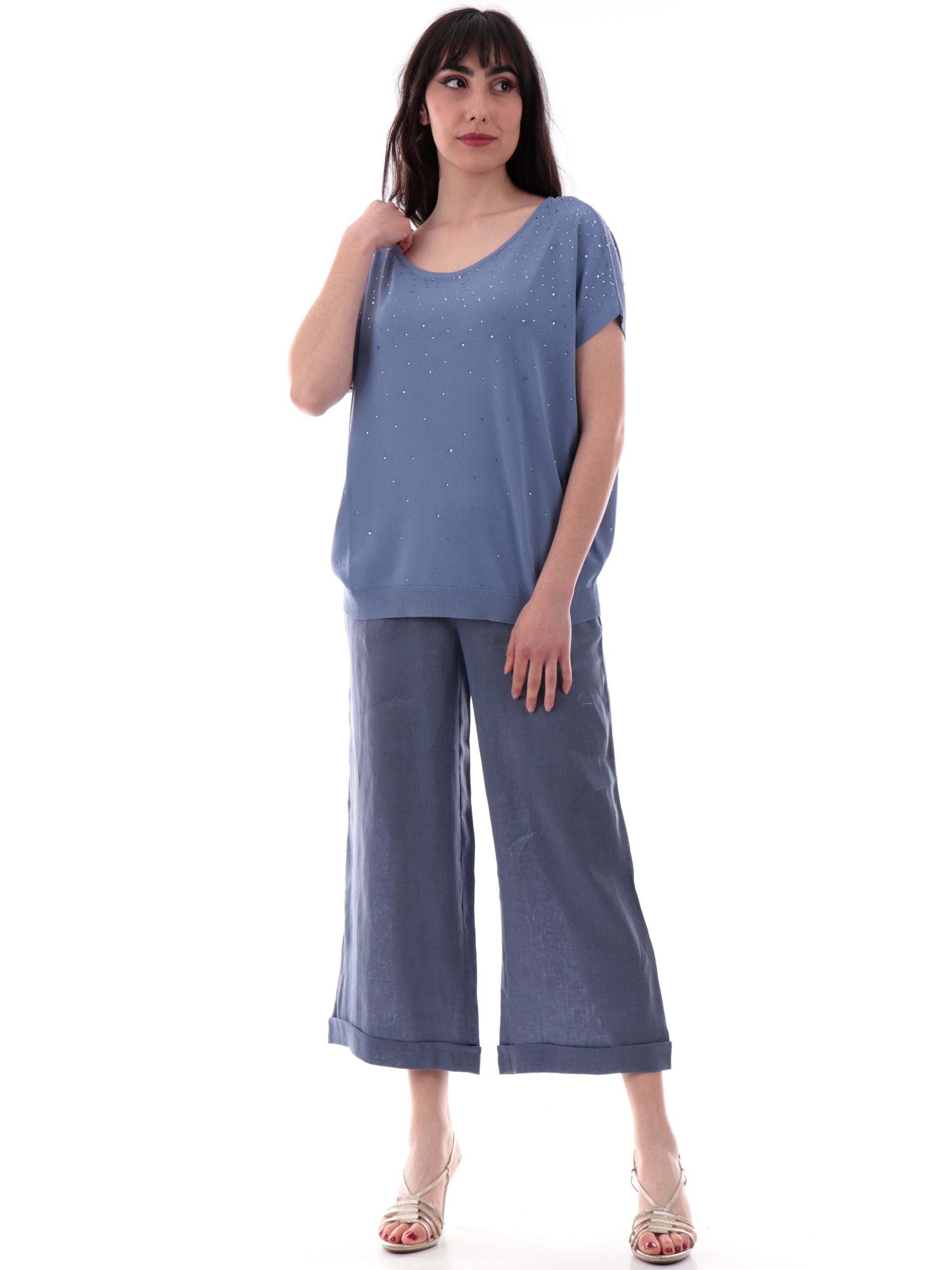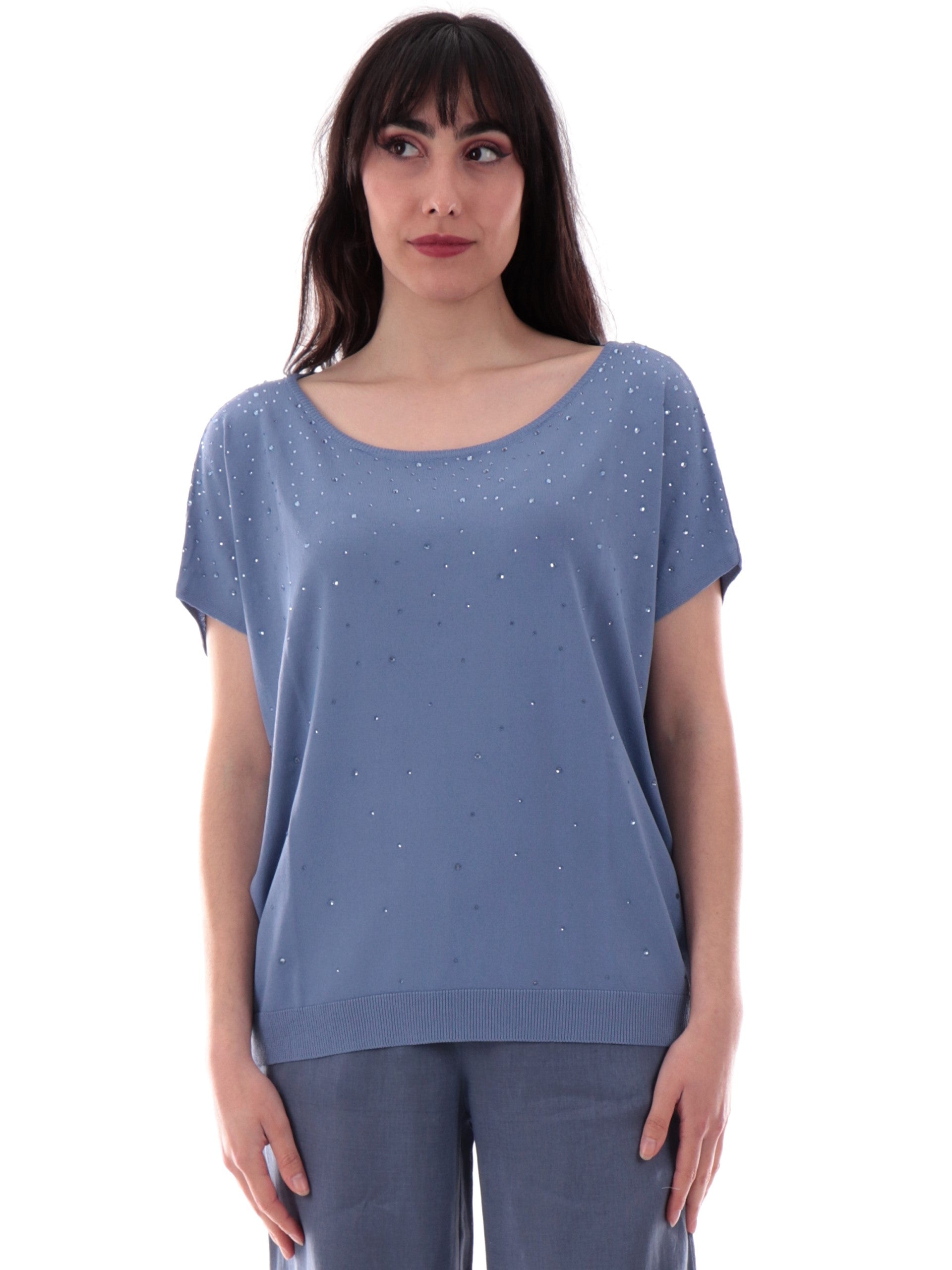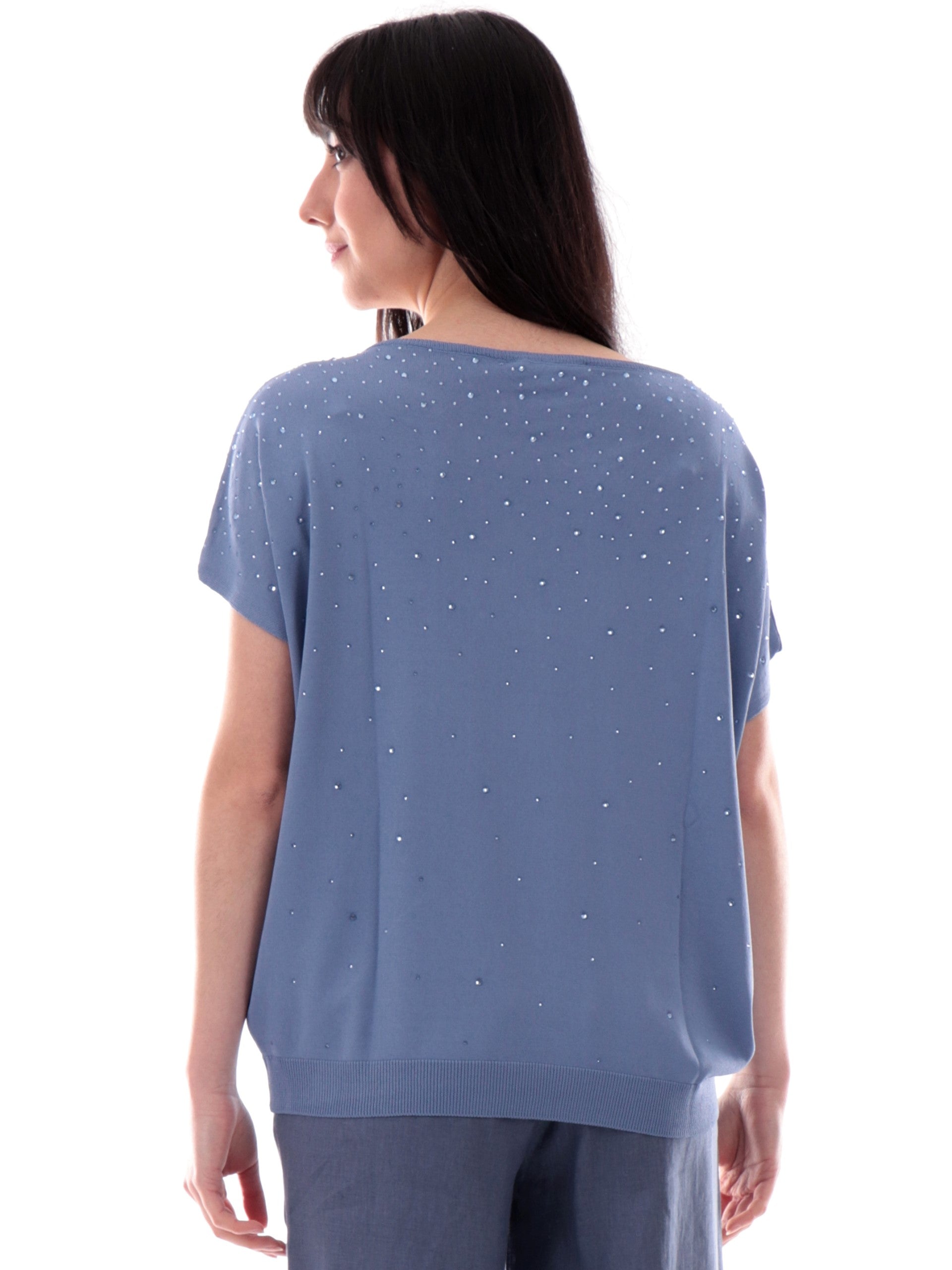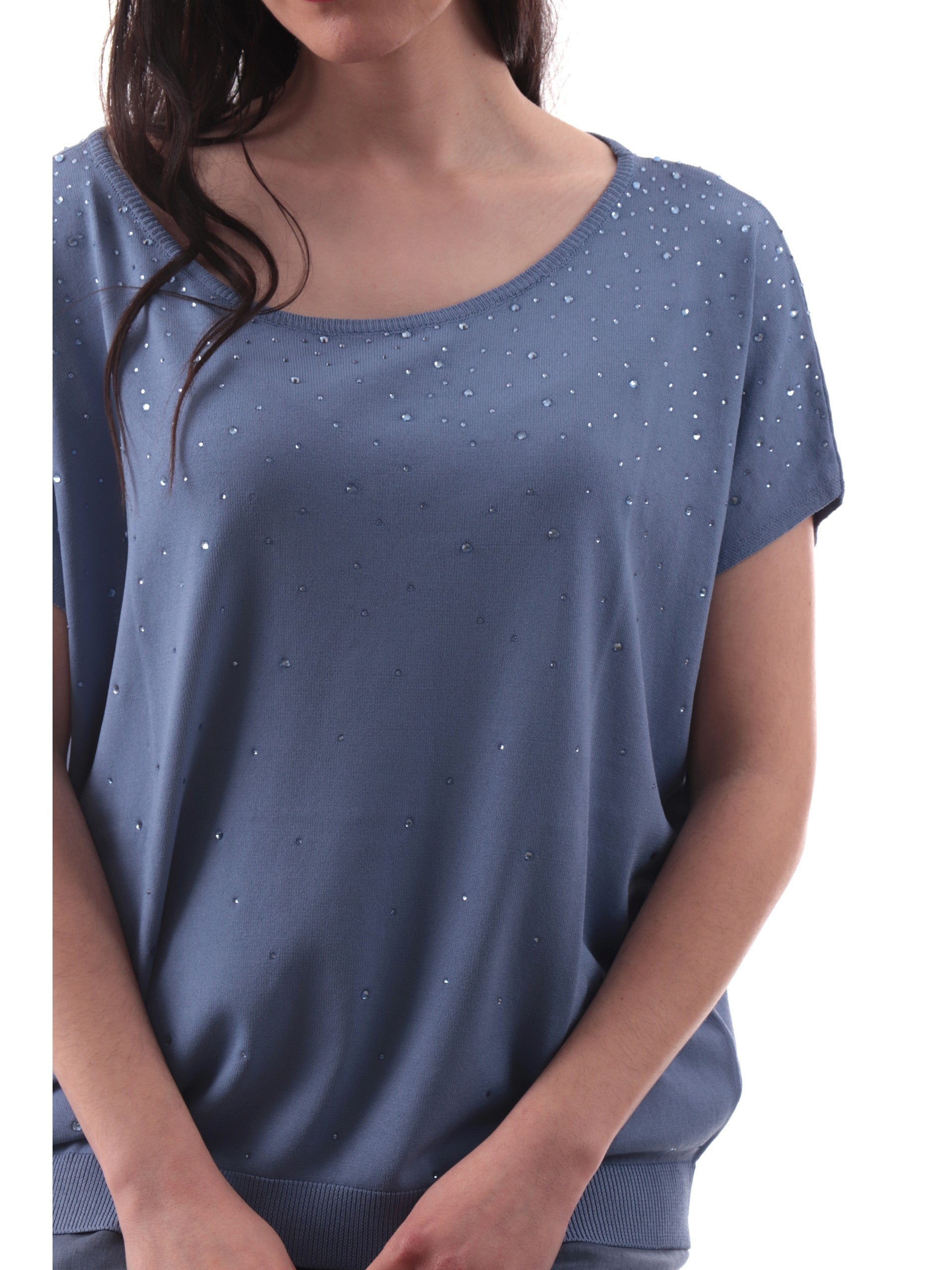 Maglione Anis bianco da donna scollo a barchetta 2451142, realizzato in viscosa. Questo maglione Anis White bianco ha lo scollo a barchetta, strass all over, polsini elasticizzati a costine e fondo asimmetrico con spacchi.