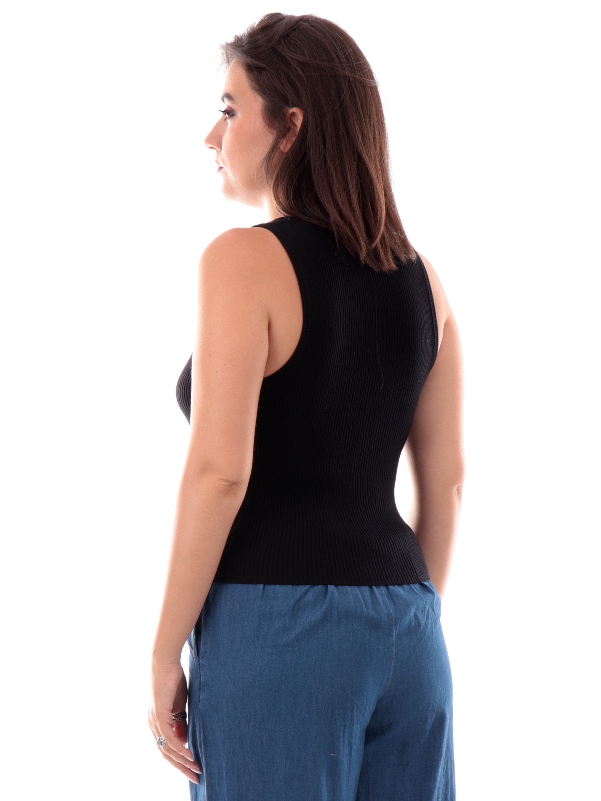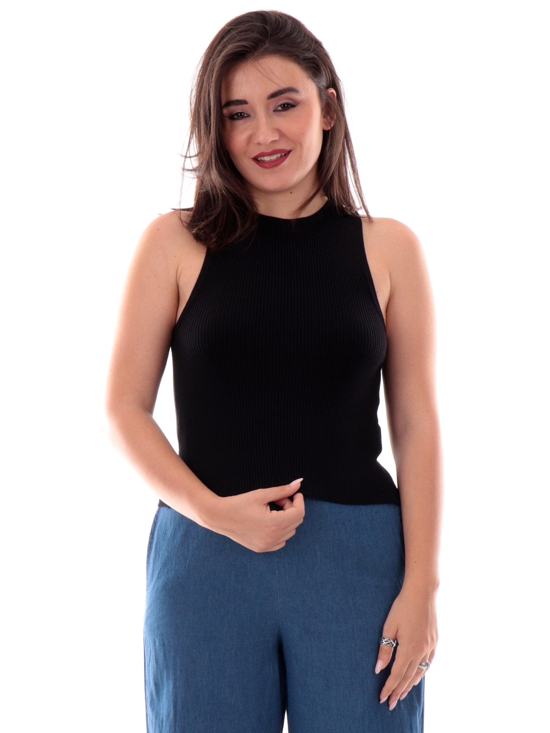 Canotta Crop Tiffosi nera da donna a costine elasticizzata . Questa Canotta Tiffosi nera crop a costine realizzata in tessuto elasticizzato. Questa maglia canottiera è un perfetto capo basic da abbinare come vuoi.