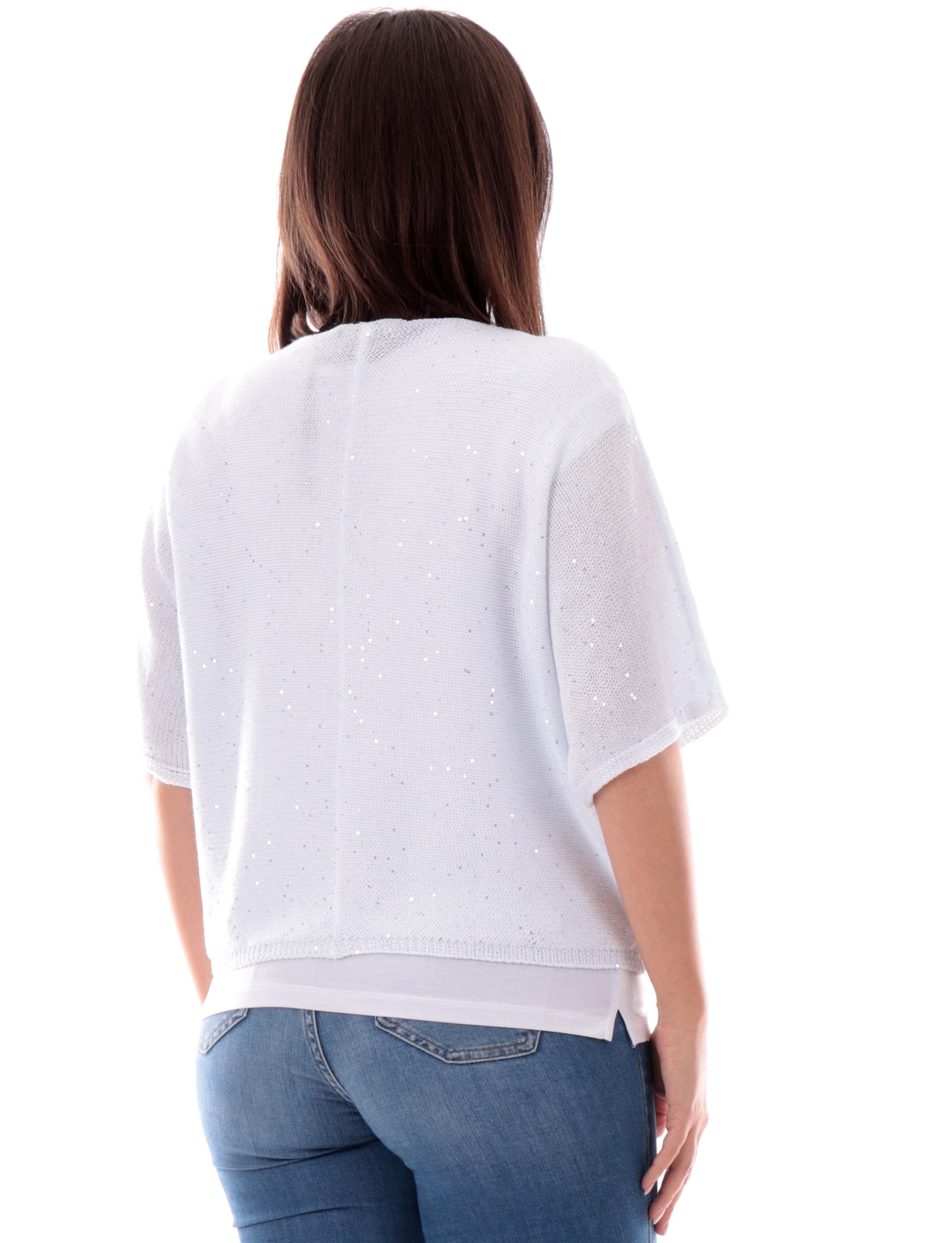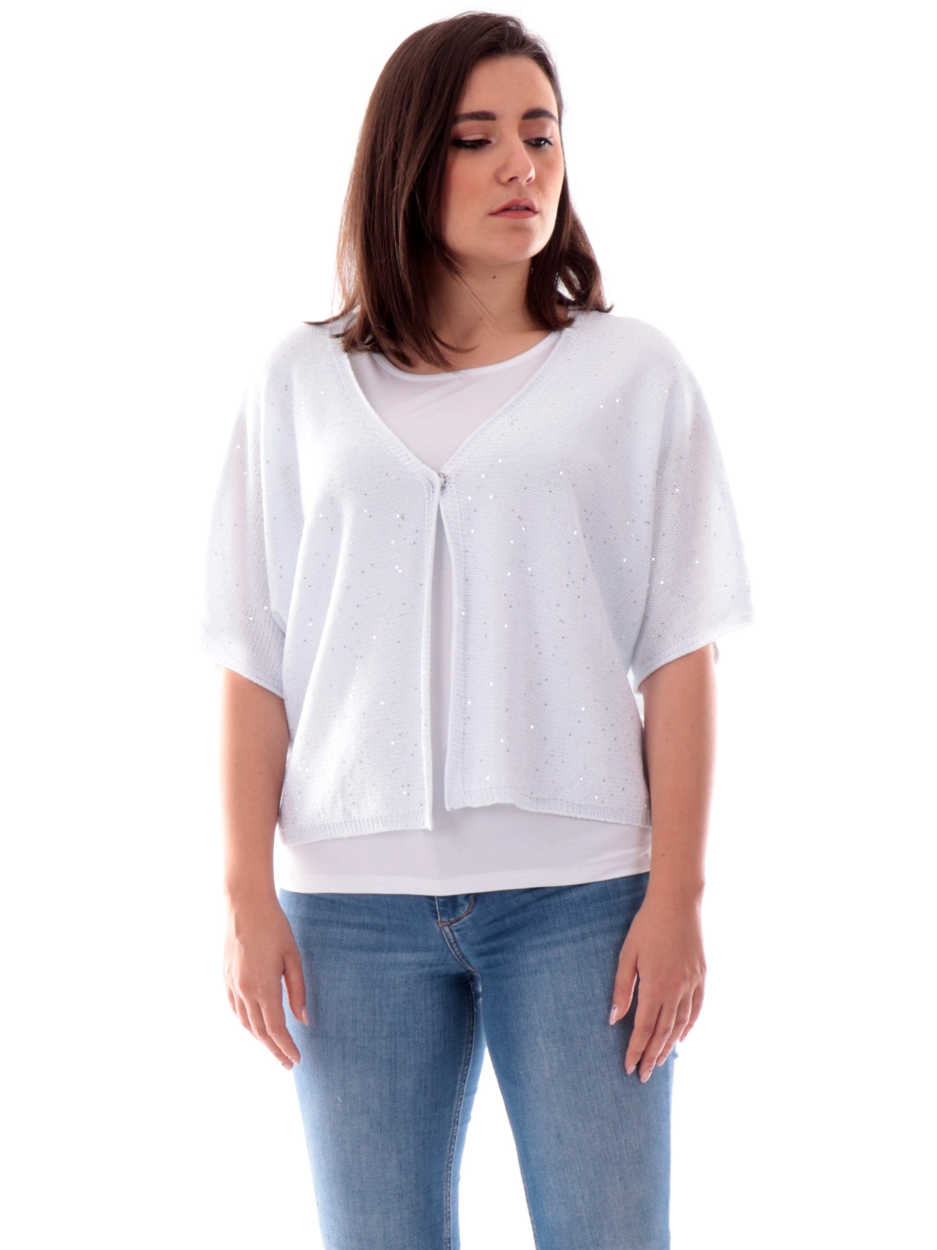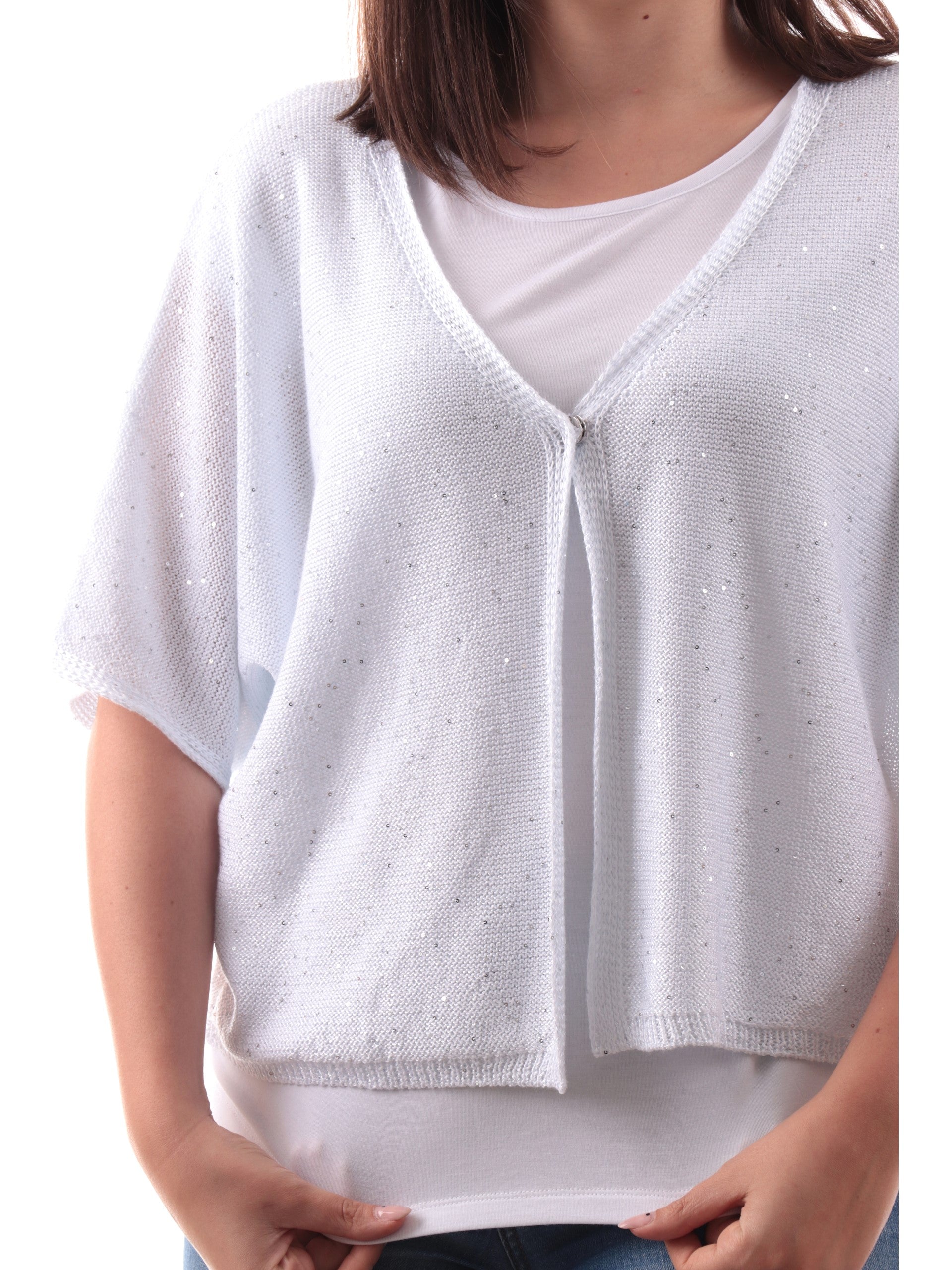 Cardigan Anis bianco scollo a V da donna con paillettes 251W1231, realizzato in 100% puro cotone. Questo cardigan Anis White bianco ha lo scollo a V, la chiusura con bottone automatico, le maniche corte e paillettes all over.
