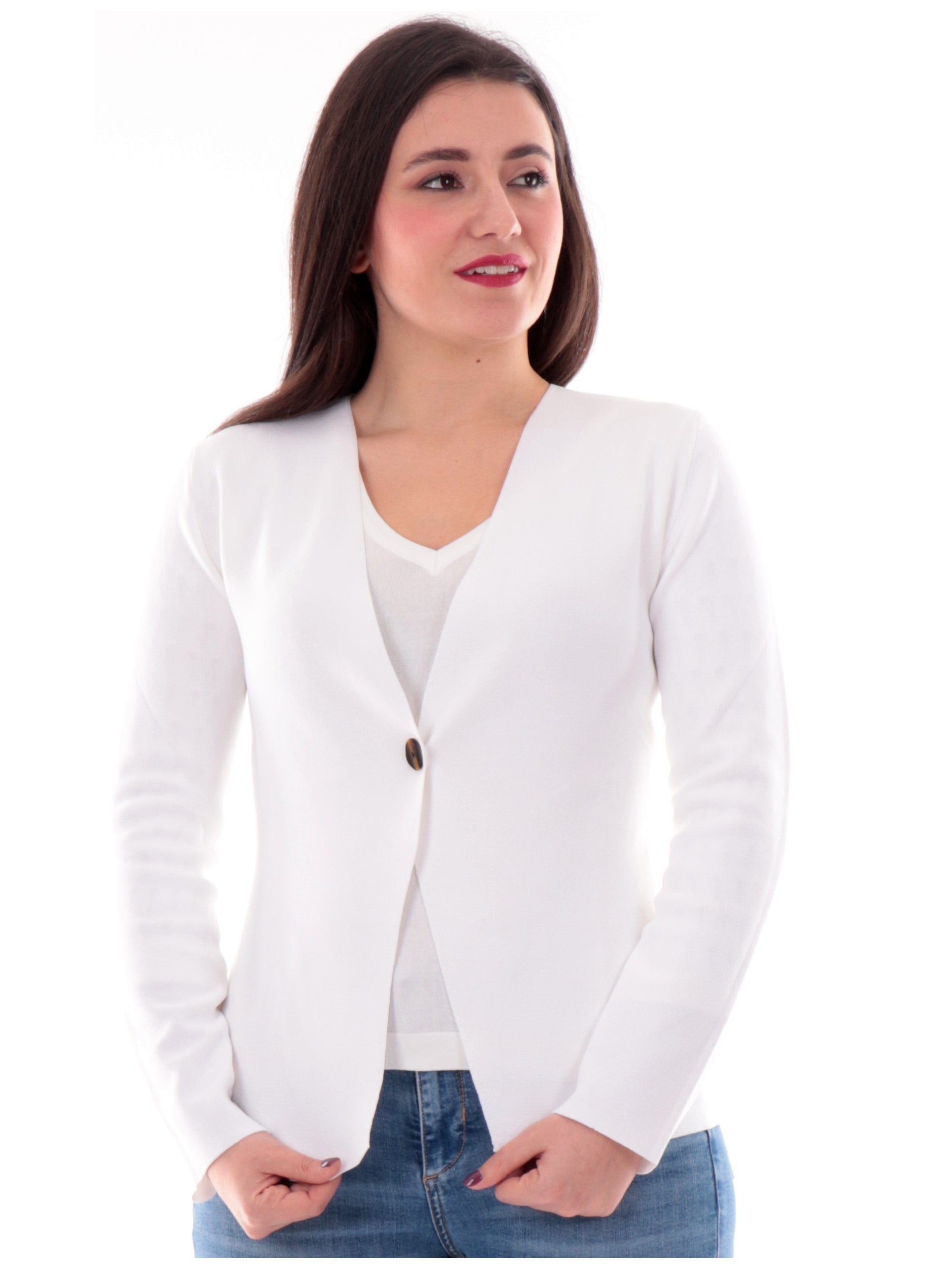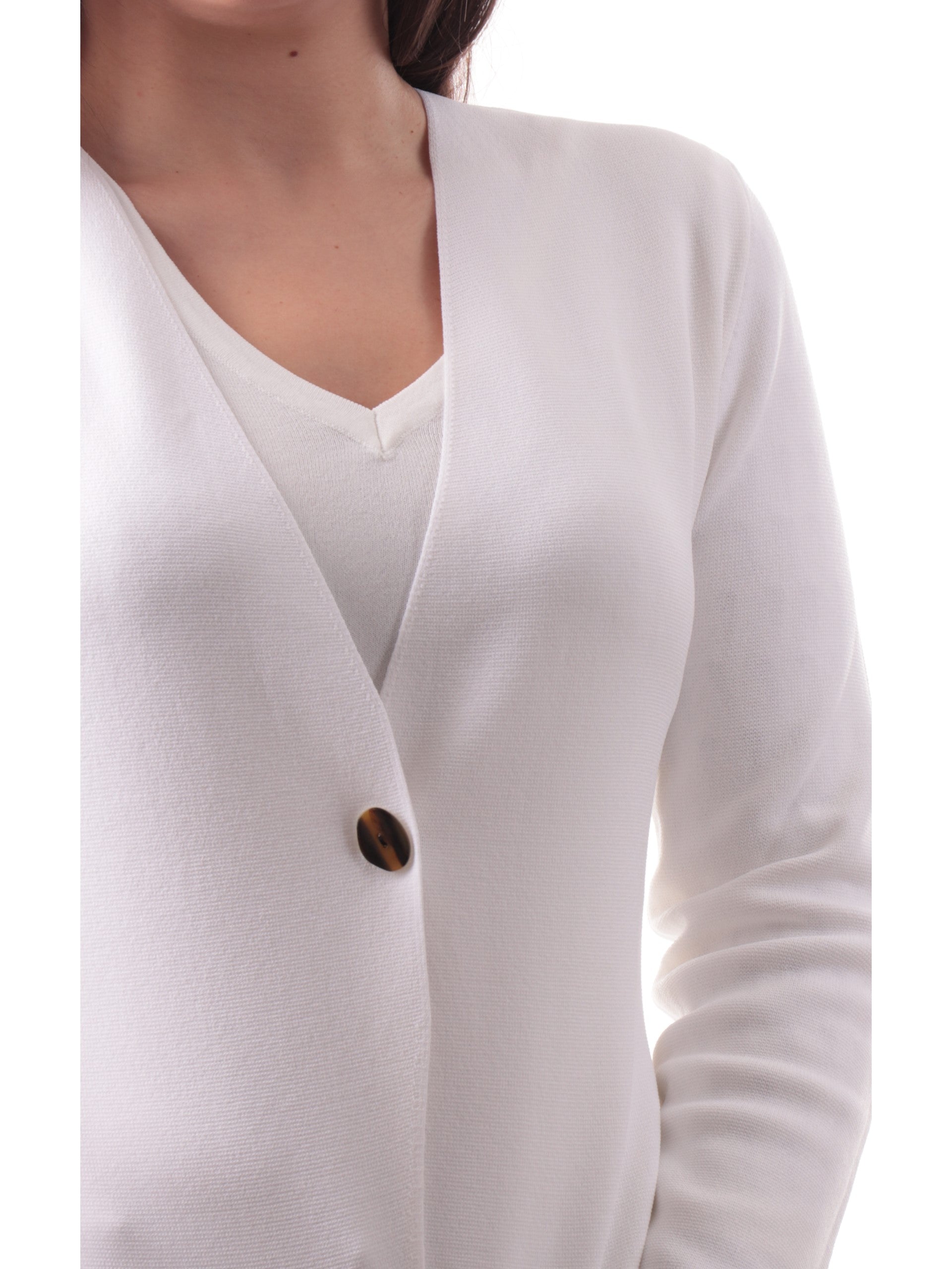 Cardigan bianco Anis da donna in filo. Questo cardigan da donna, realizzato in viscosa, perfetta per la stagione primavera-estate, è caratterizzato dalla chiusura con bottone, maniche lunghe e fondo regolare. Questo cardigan Anis è perfetta sia per le occasioni speciali e sia per un look casual