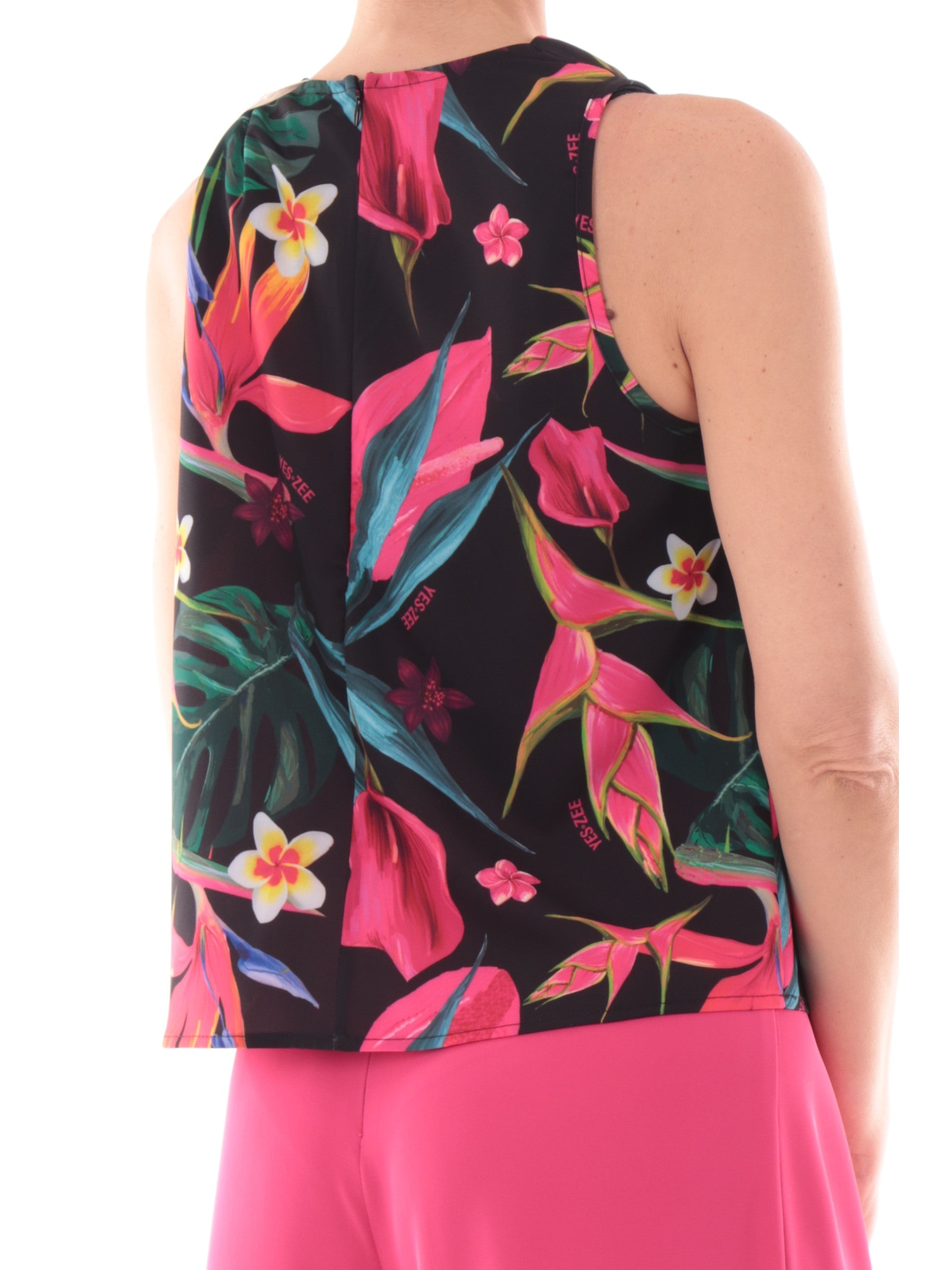 Casacca floreale Yes Zee da donna. Questa casacca da donna, realizzata da un tessuto morbido e leggero, perfetta per l'estate ed è perfetto per un look casual e elegante, è caratterizzta dallo scolloa giro, chiusura con zip sul retro, maniche smanicate, fantasia floreale e il fondo regolare