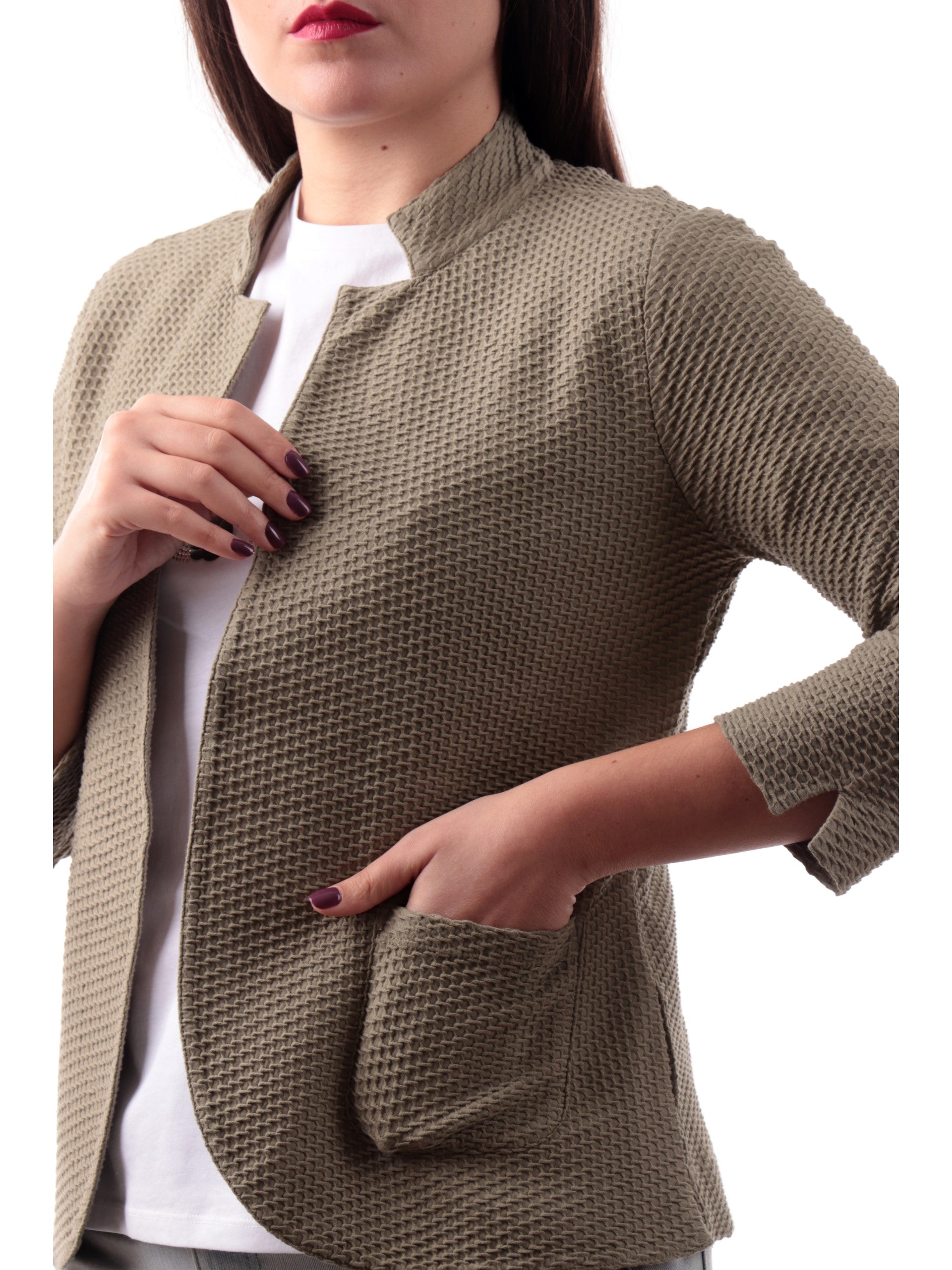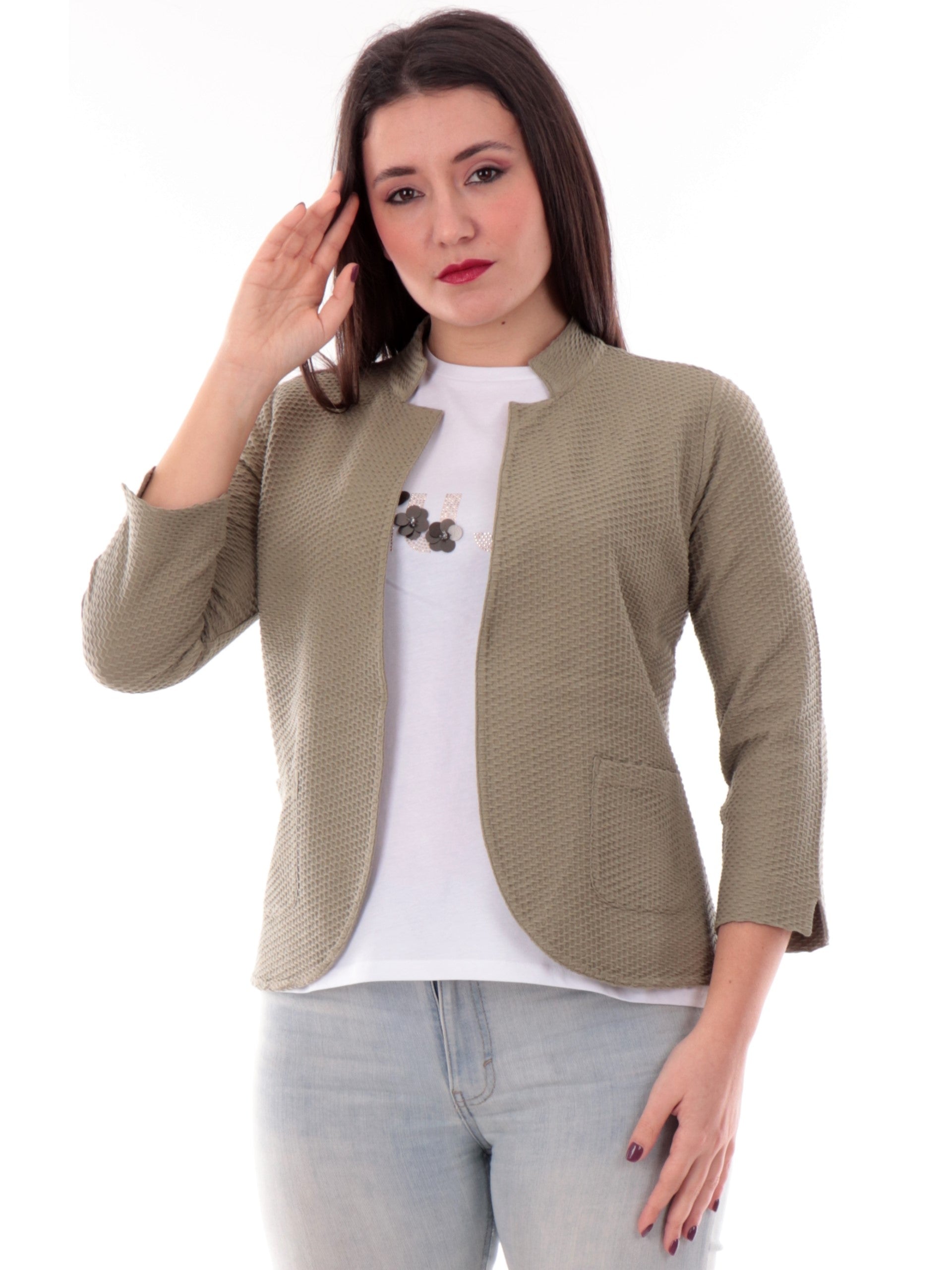 Giacca verde aperta Anis da donna a nido d'ape con maniche a tre quarti. Questa giacca da donna, realizzata in cotone, perfetta per la stagione primavera-estate, è caratterizzata dalla fantasia nido d'ape, sul davanti troviamo due tasche aperte, maniche a tre quarti, spacchi laterali e fondo regolare. Questa giacca Anis è perfetta sia per le occasioni speciali e sia per un look casual