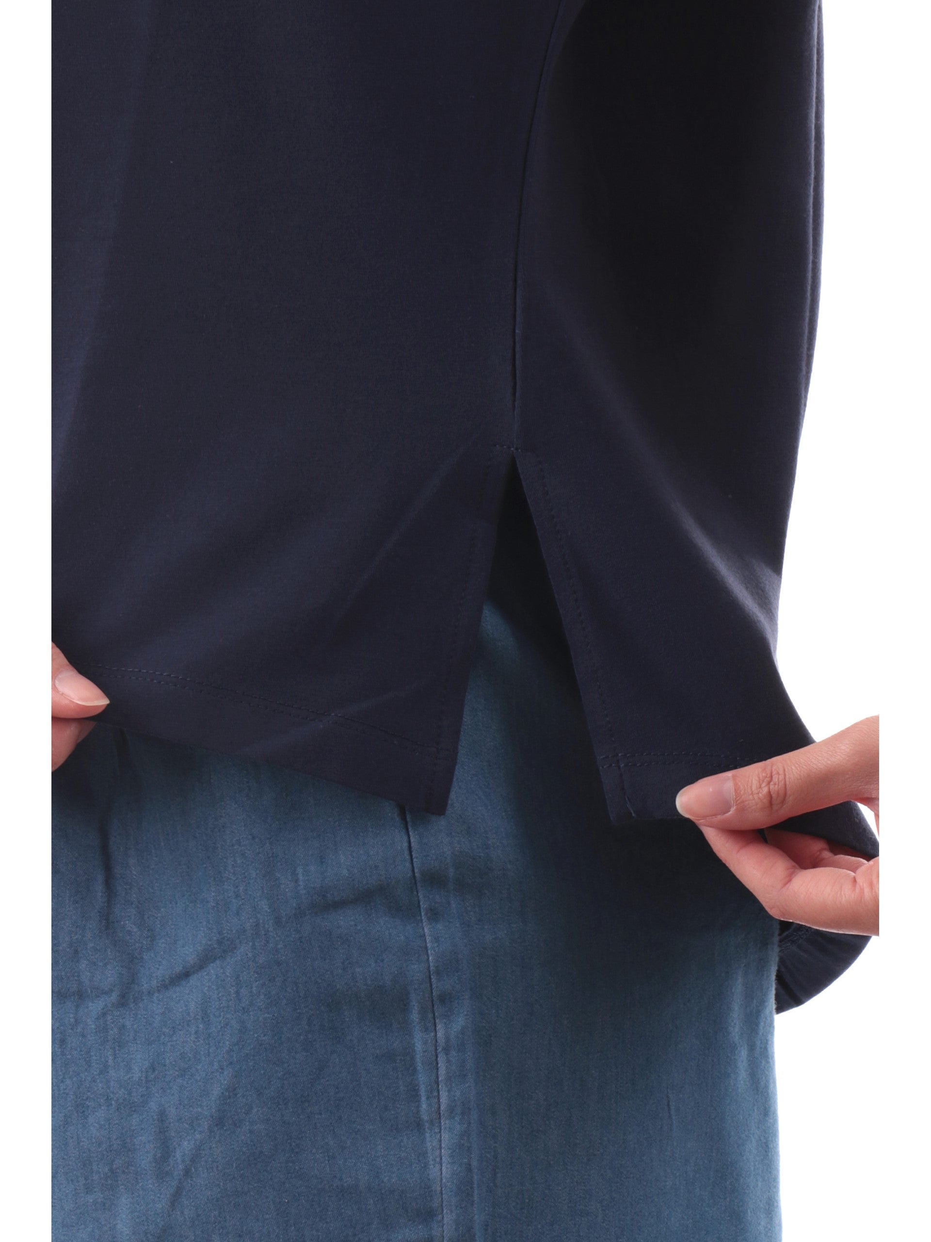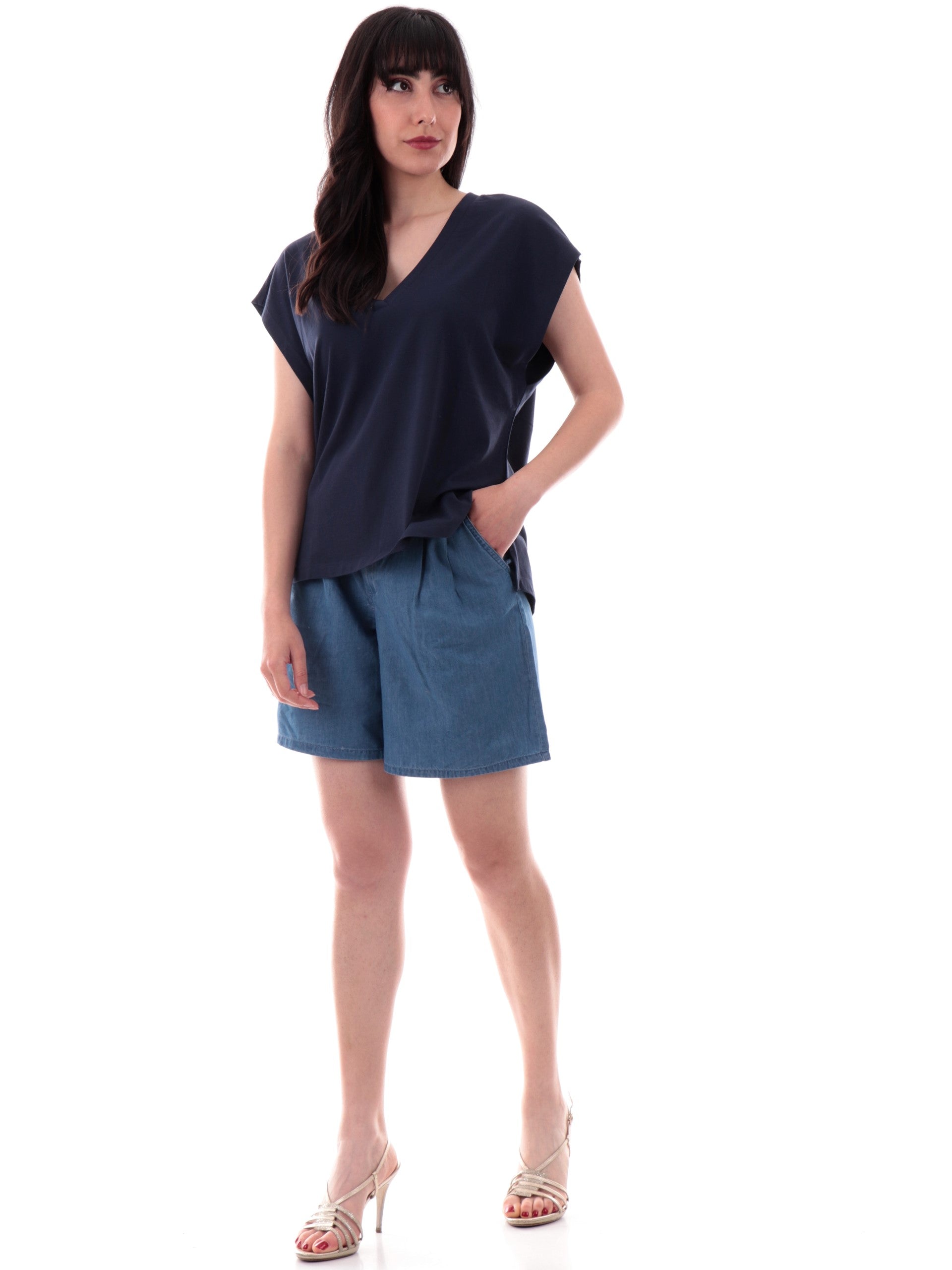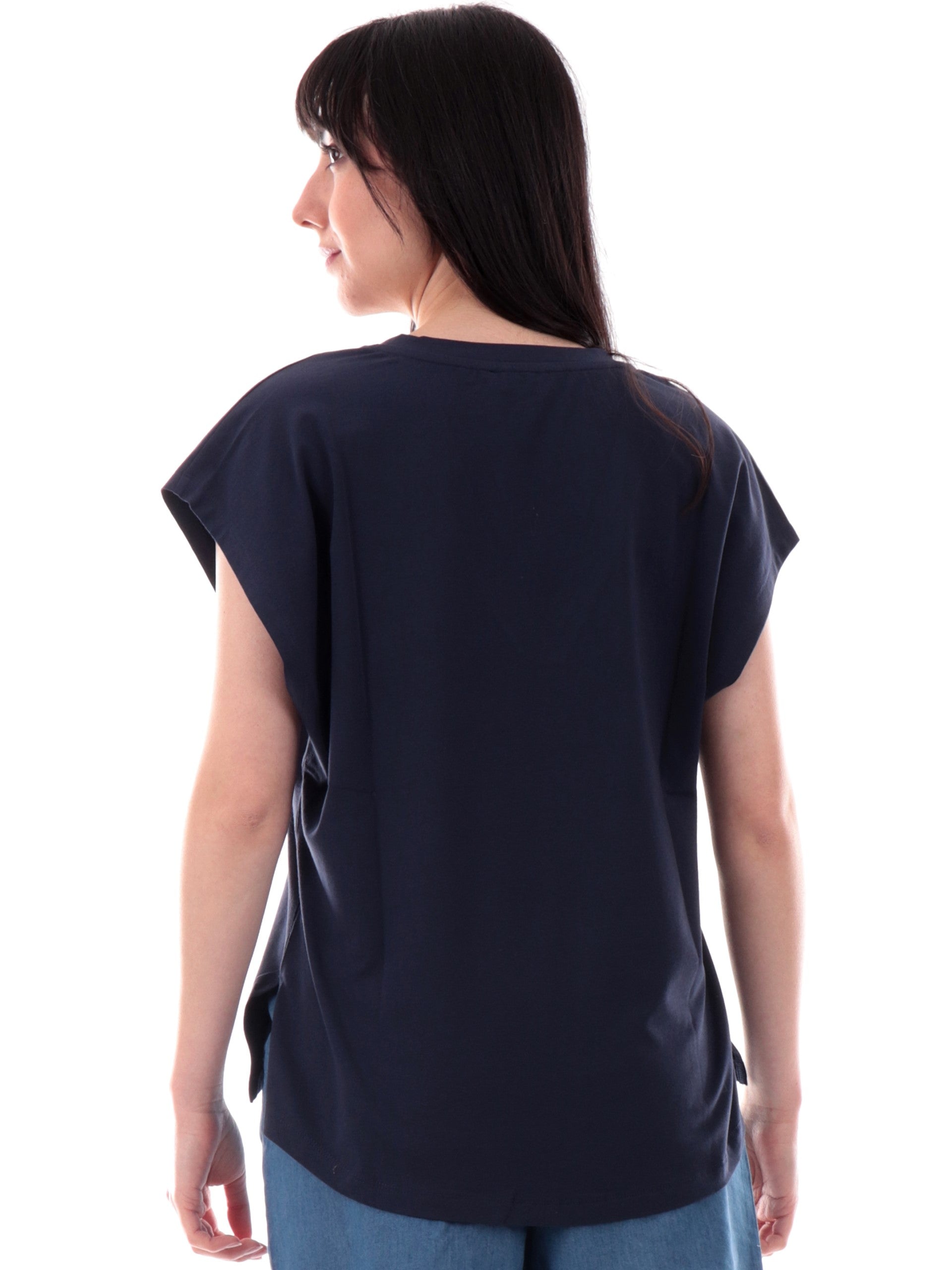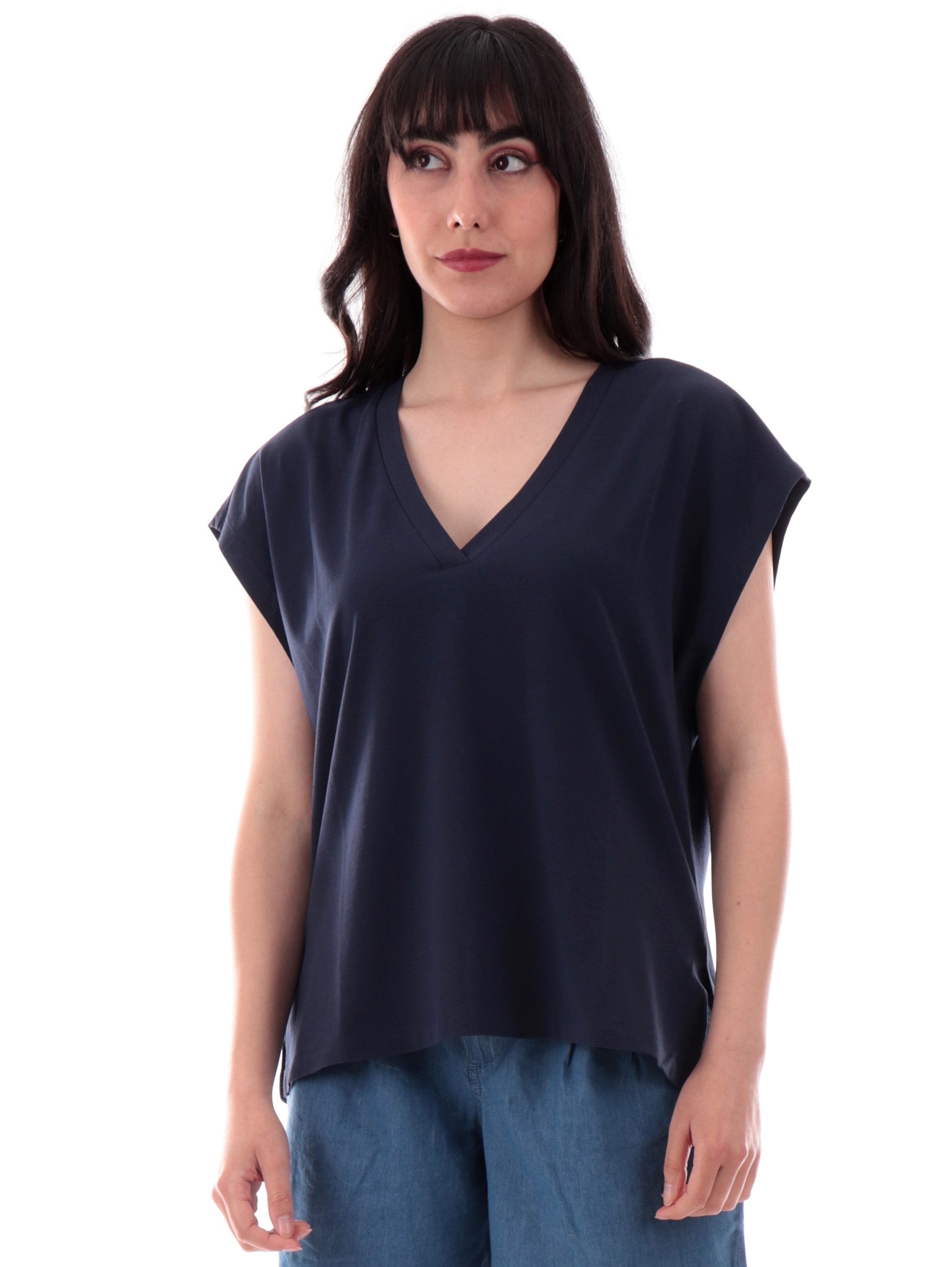 Maglia Anis blu scollo a V da donna maniche aletta 251C1113, realizzata in cotone. Questa maglia donna Anis blu ha lo scollo a V, le maniche ad aletta e il fondo con spacchi laterali.