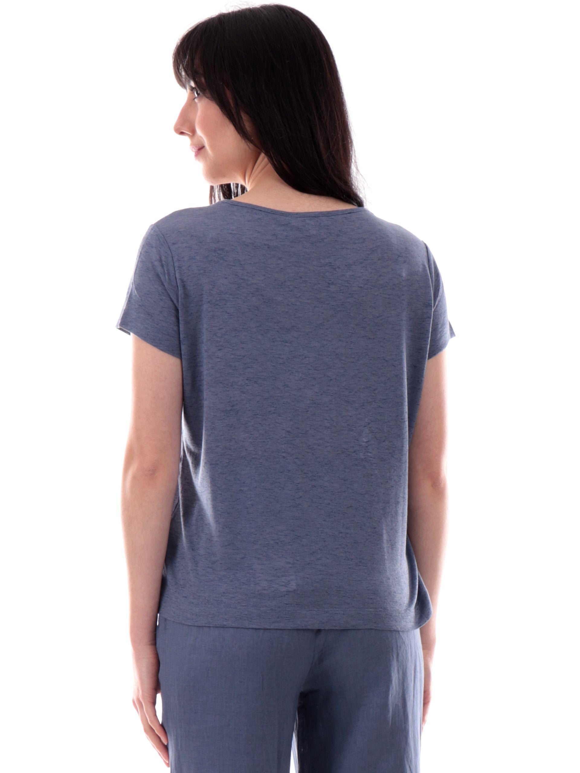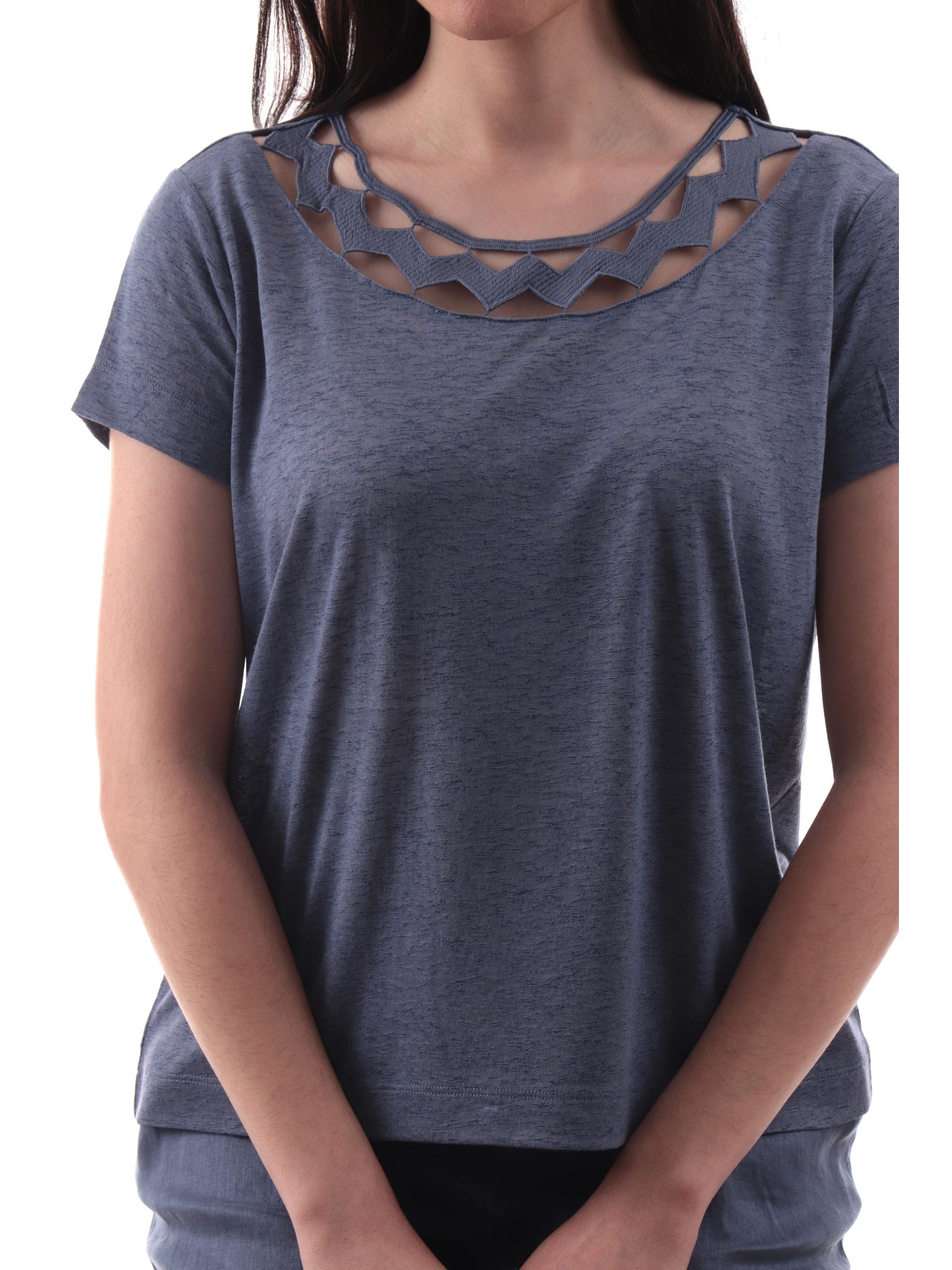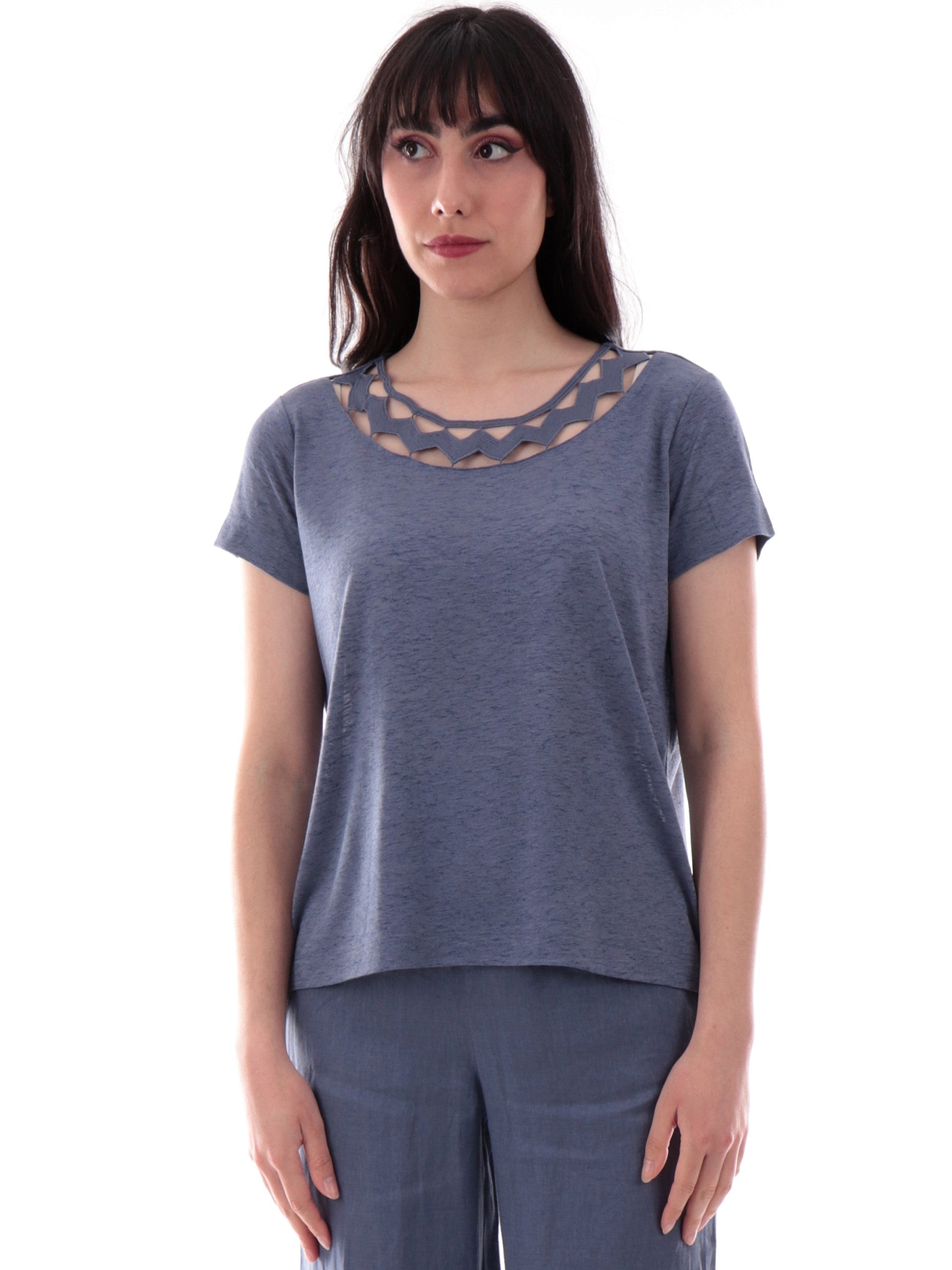 Maglia Anis White da donna realizzata in filato di viscosa elasticizzata effetto mélange dalla texture morbida e confortevole con collo traforato . Blusa Anis manica corta dalle finiture moderne e raffinate, presenta un ampio girocollo elegantemente lavorato.