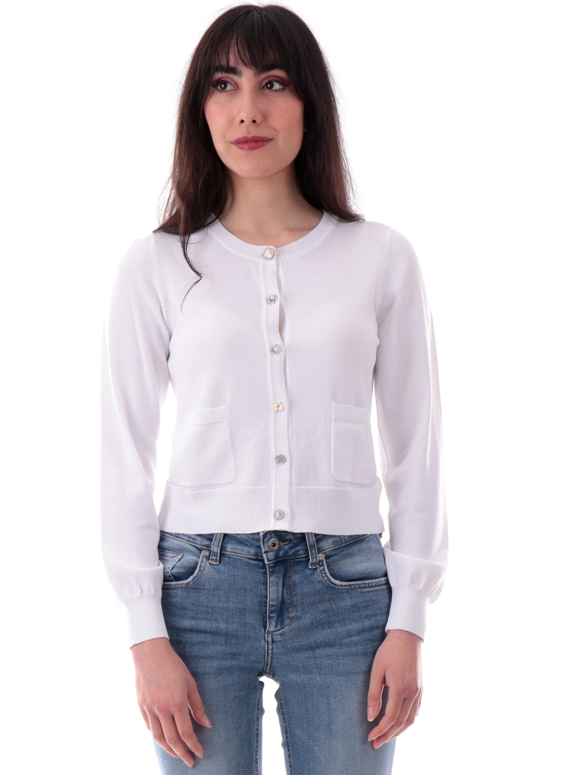 Maglia Anis coreana bianca da donna con bottoni gioiello 251W1067, realizzata in viscosa. Questa maglia donna Anis White girocollo ha le maniche lunghe, la chiusura con bottoni gioiello, due taschinifrontali a filo, polsini e fondo elasticizzati a costine.