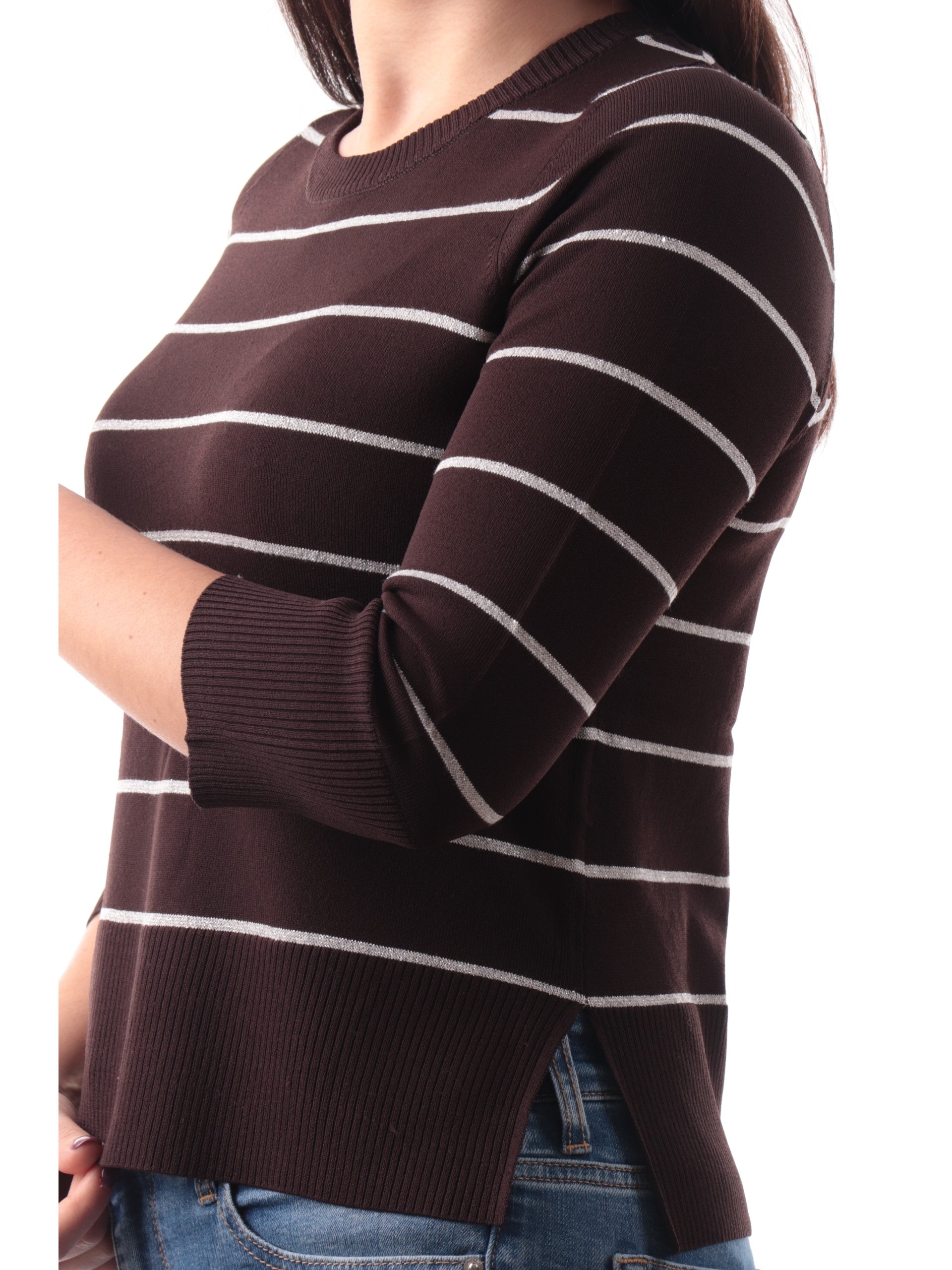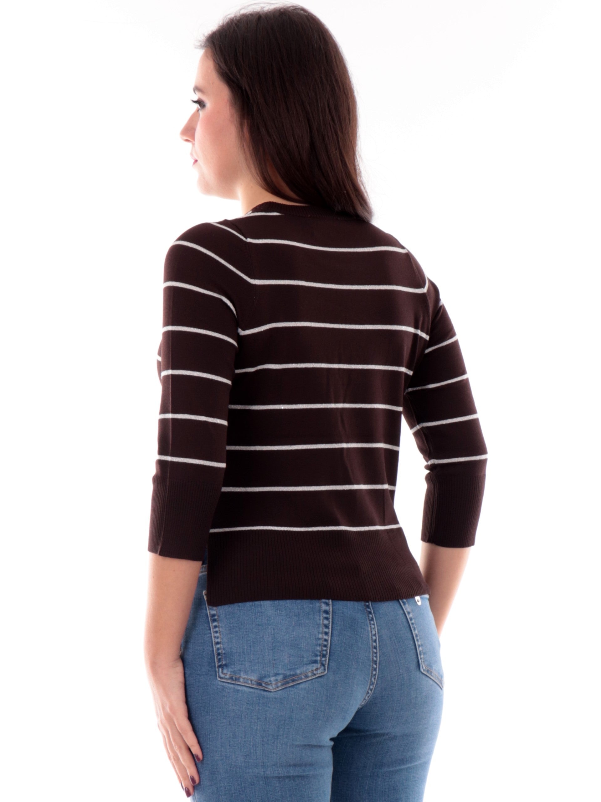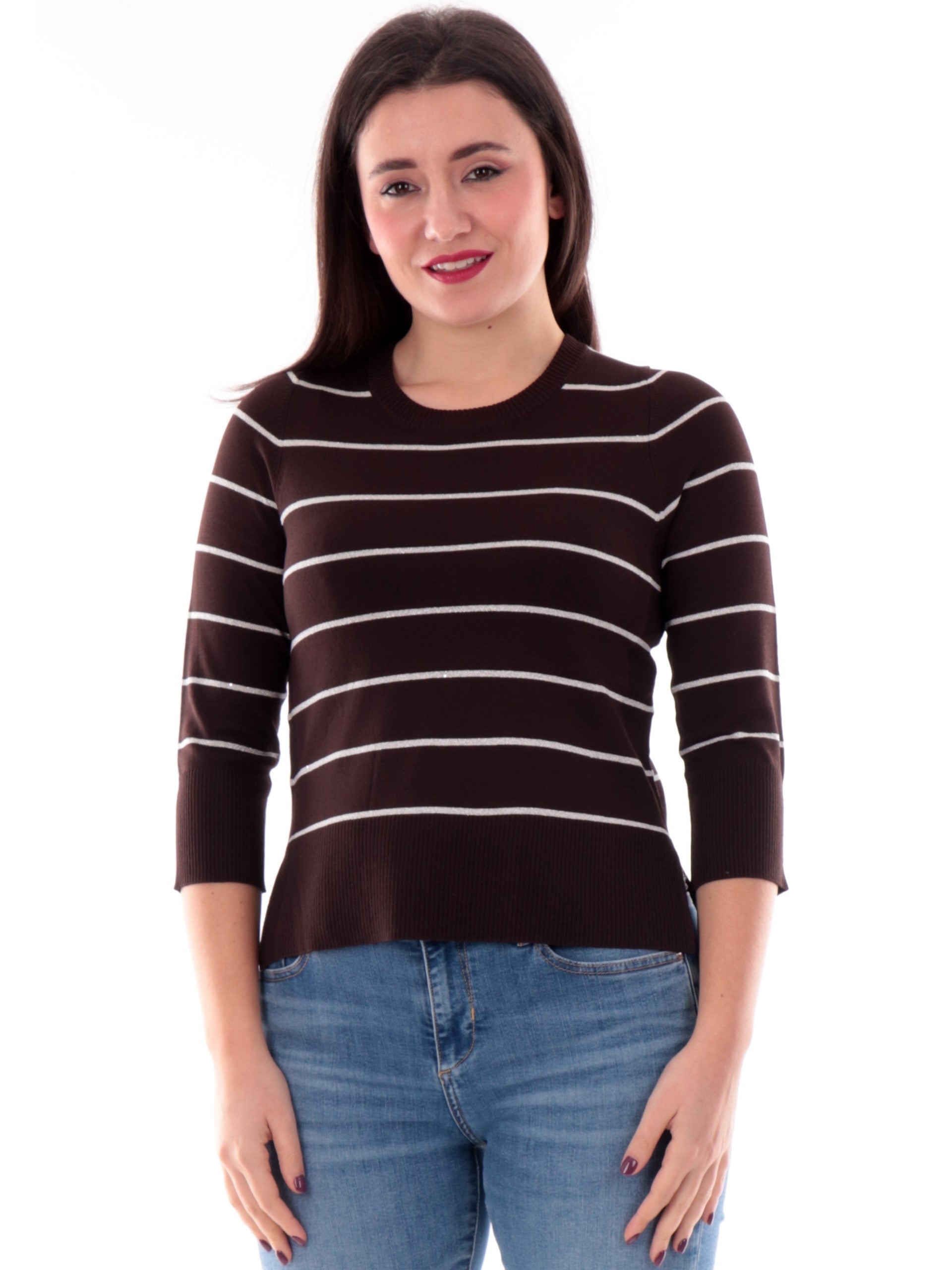 Maglia Anis marrone a righe da donna con inserti in lurex e maniche a tre quarti 261W1021069