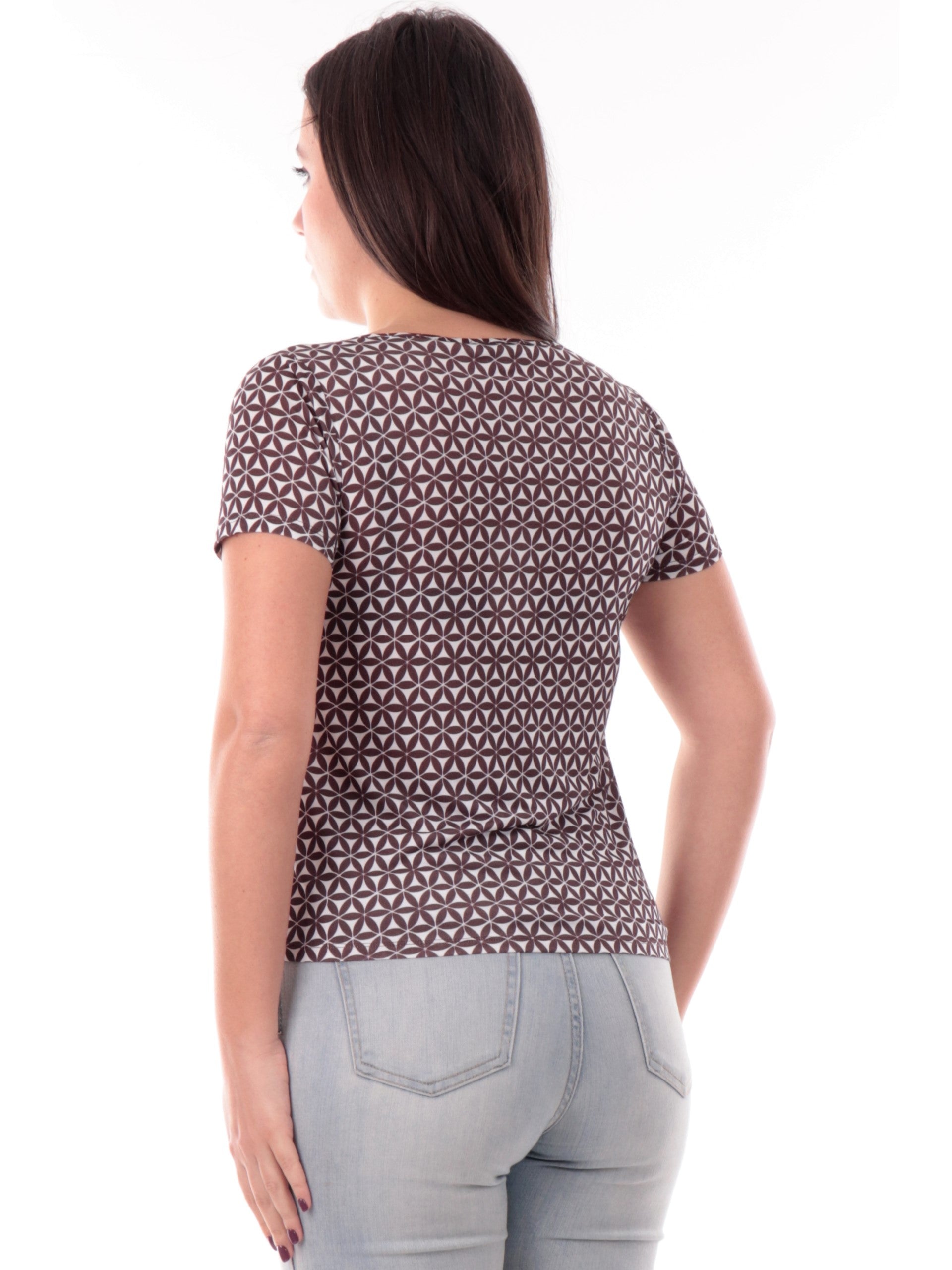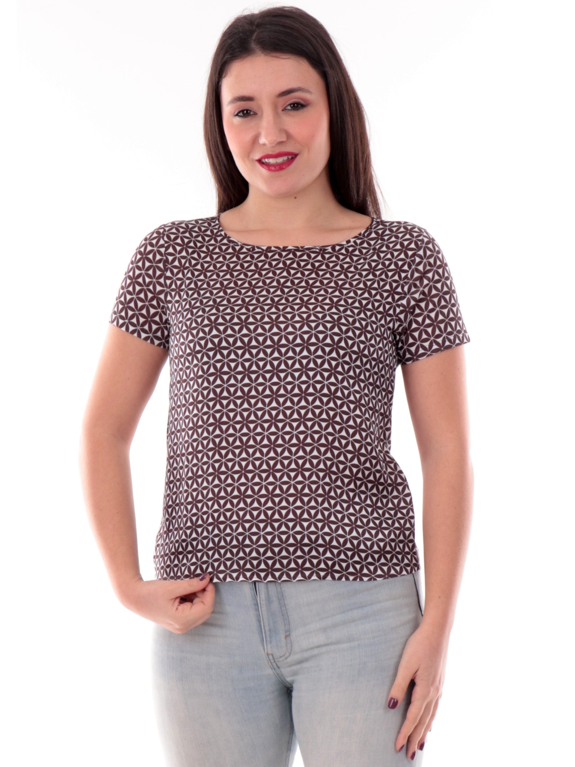 Maglia Anis marrone da donna realizzata in doppio tessuto. La fantasia è coerente su entrambi i lati: sul davanti un leggero raso satin mentre sul retro una viscosa fresca e leggera. Il doppio tessuto garantisce il massimo della comodità senza trascurare l'eleganza. Questa maglia Anis, perfetta per la stagione primavera-estate, è caratterizzata dallo scollo a giro, maniche corte e fondo regolare.Questa maglia è perfetta per un look casual