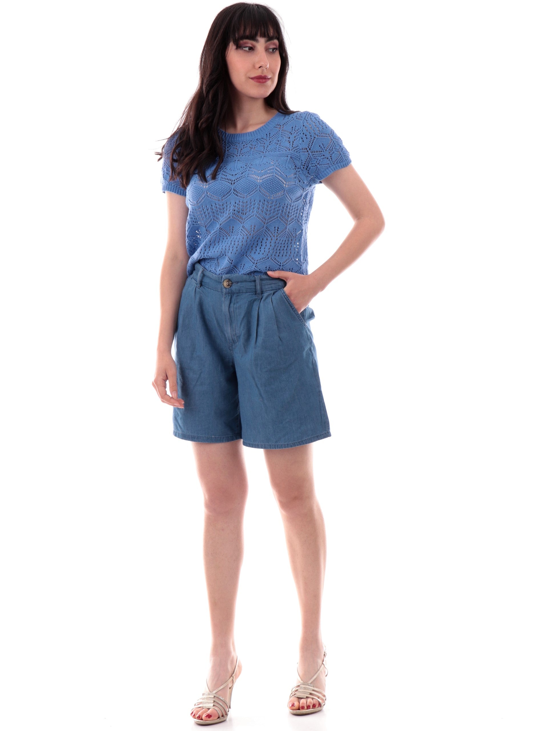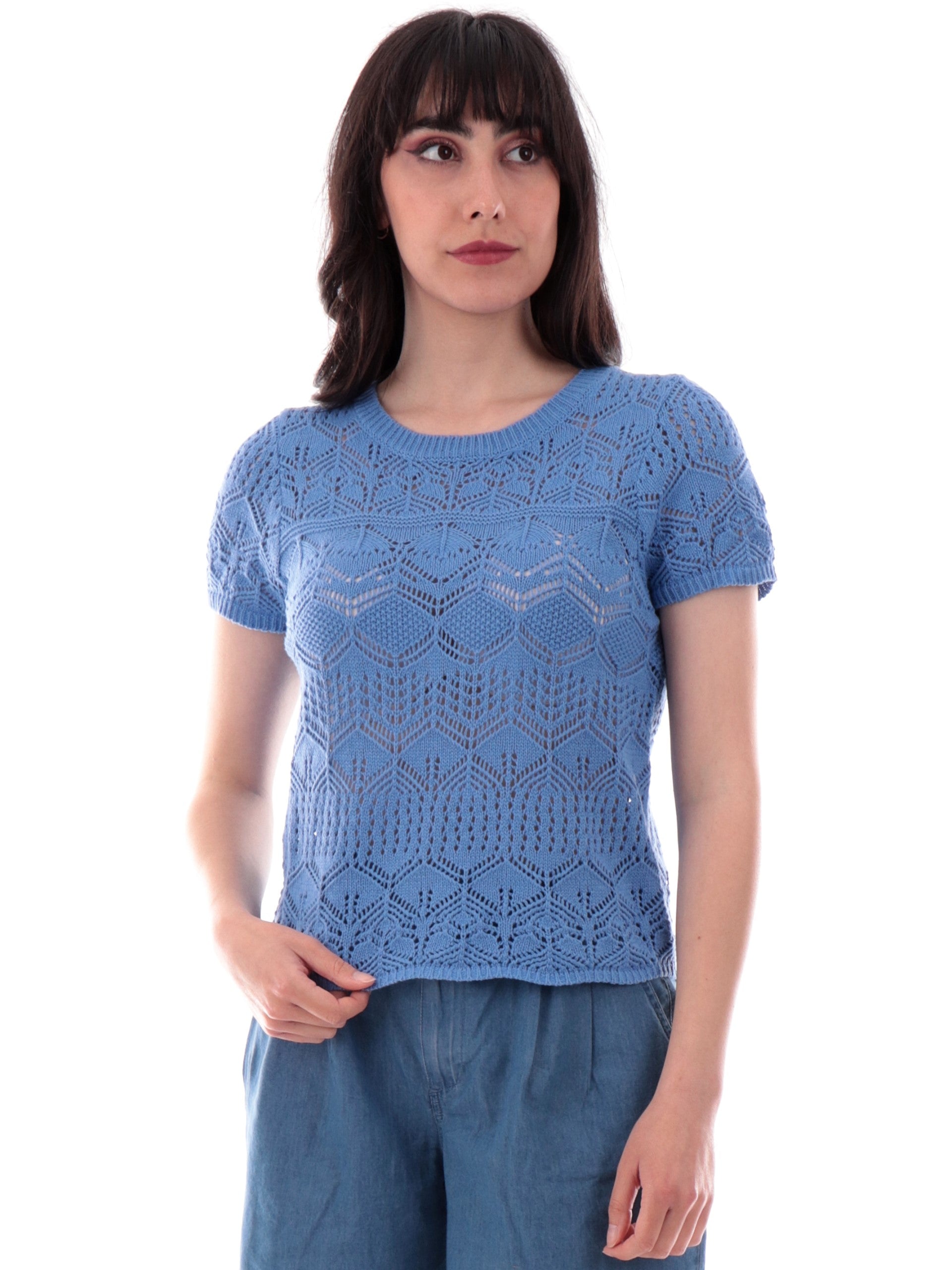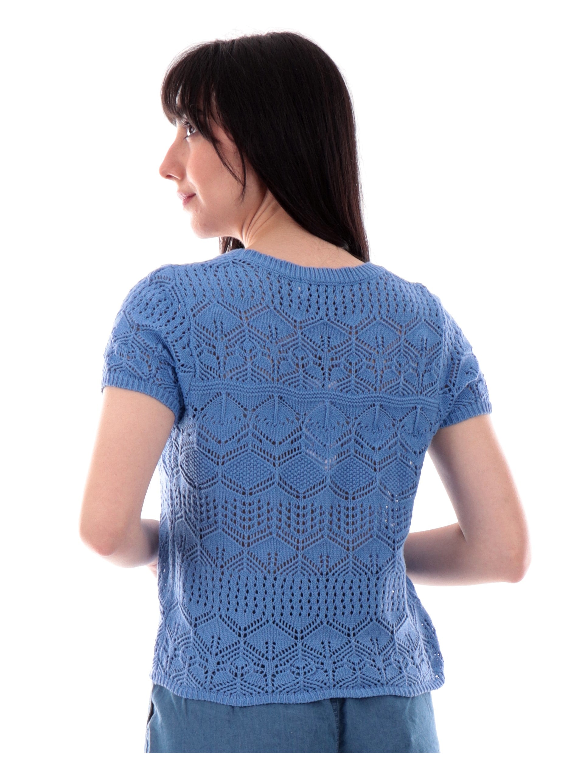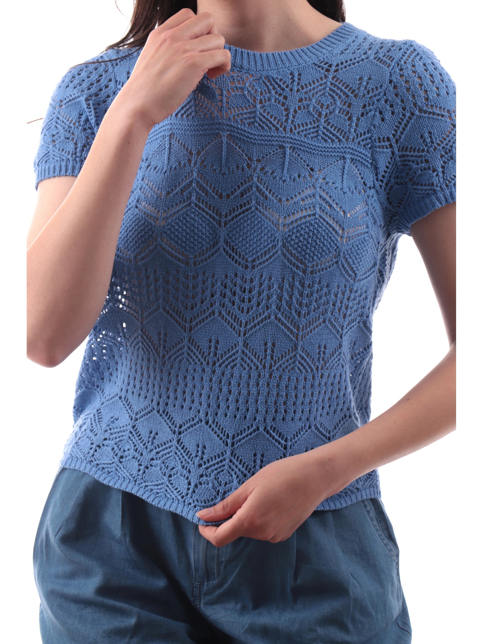 Maglia Molly Bracken da donna blu realizzata in pizzo macramè e linee morbide . Questa maglia uncinetto Molly Bracken celeste da donna è caratterizzata da linee semplici ed essenziali.