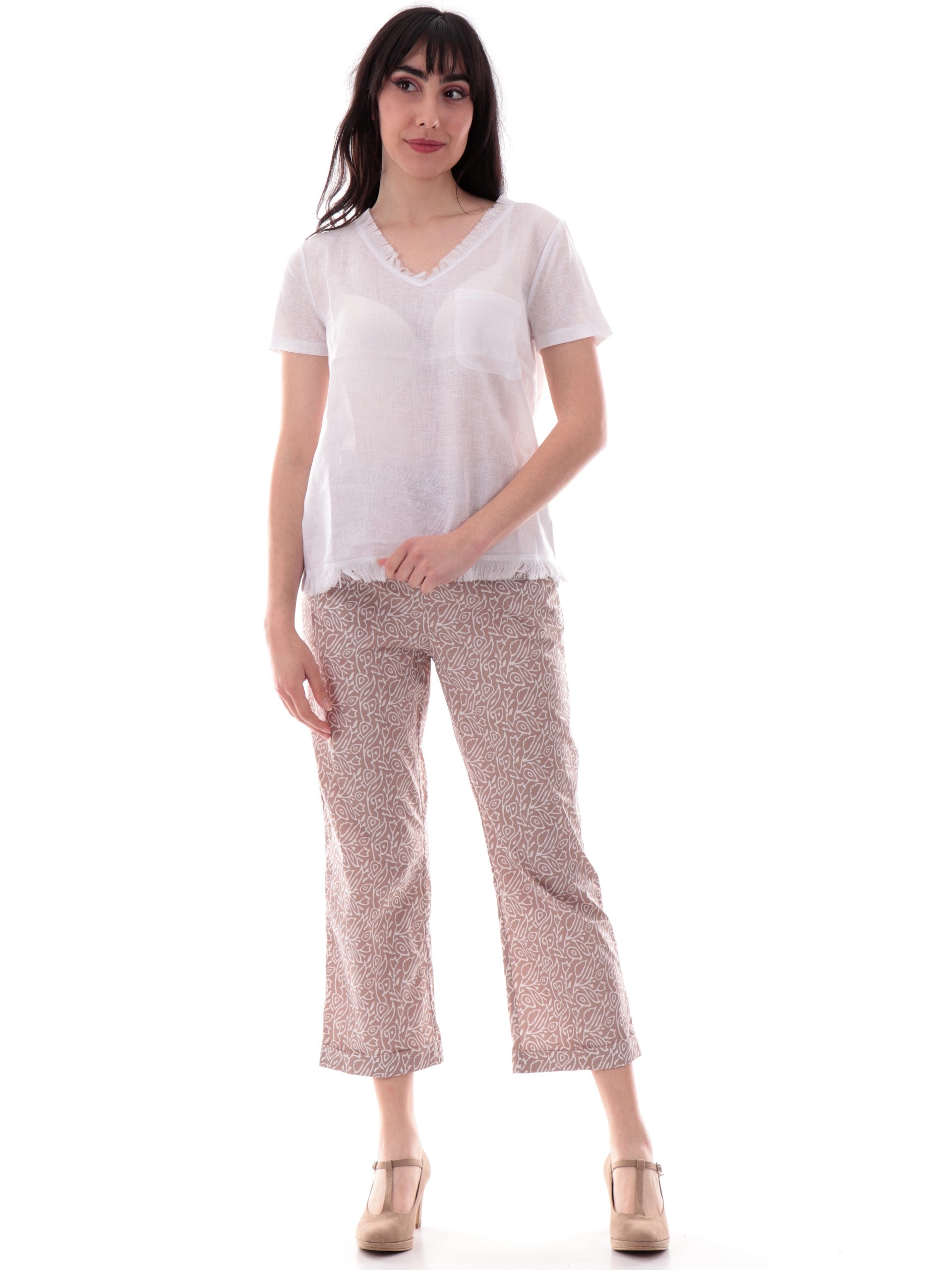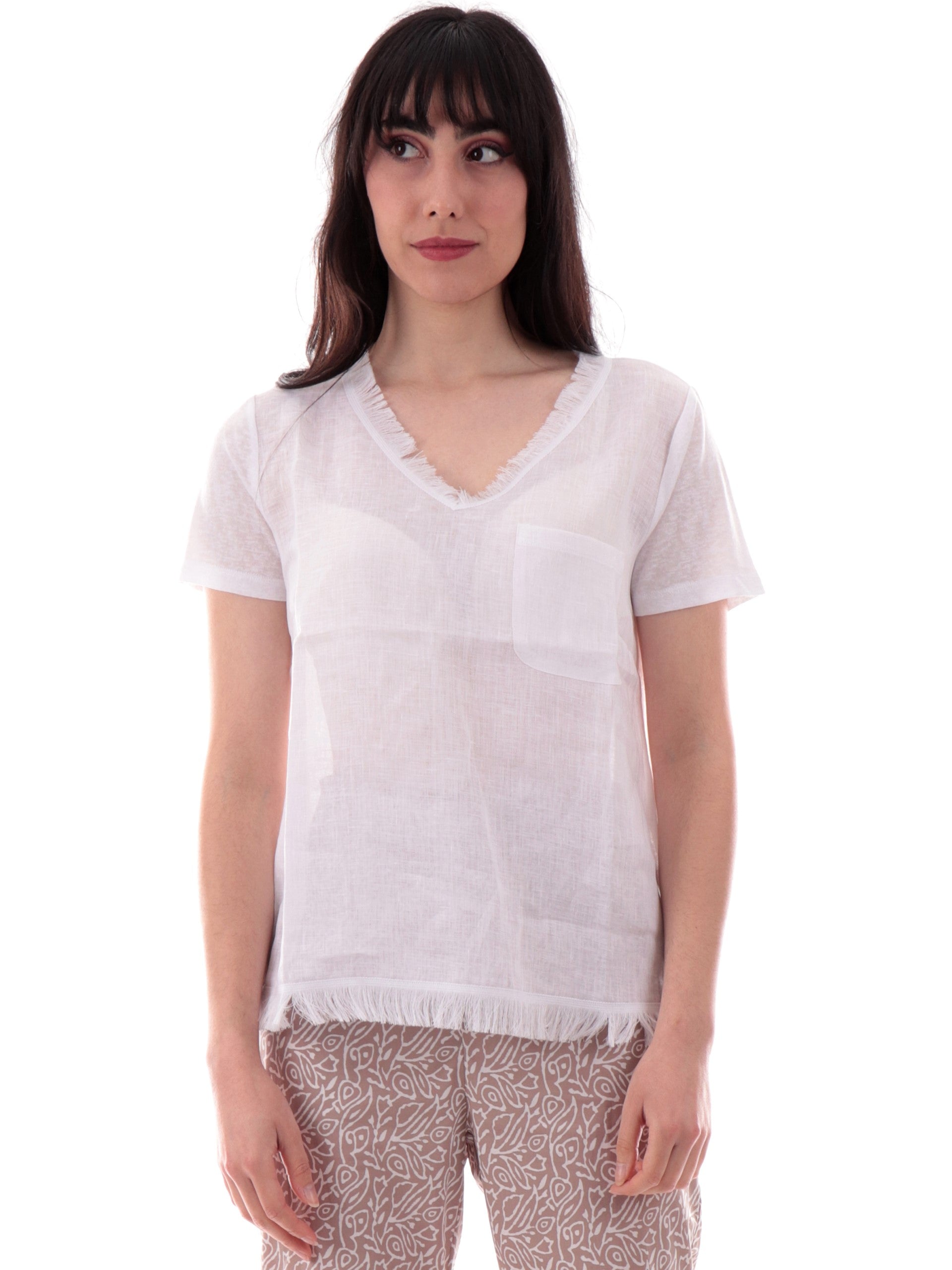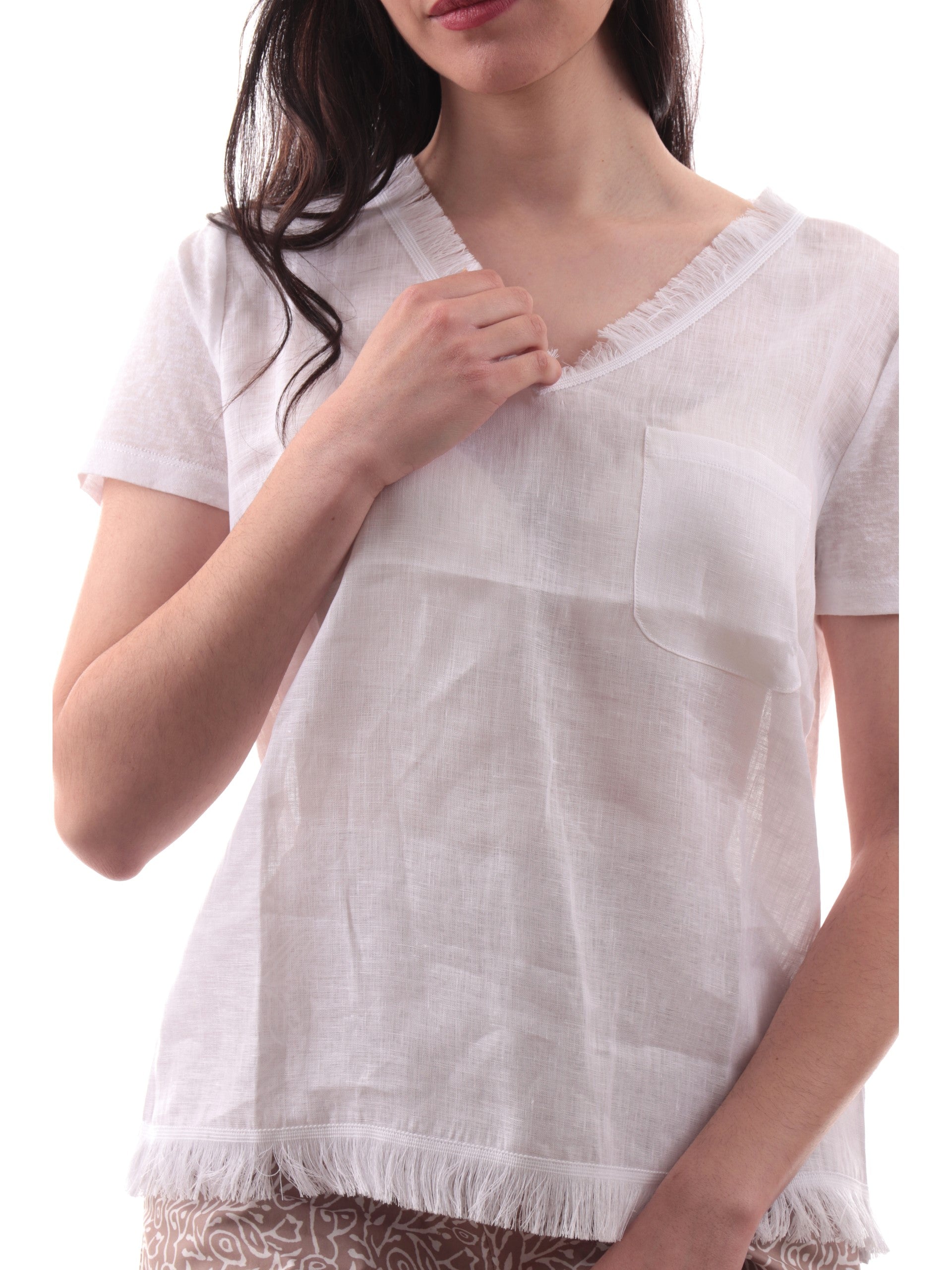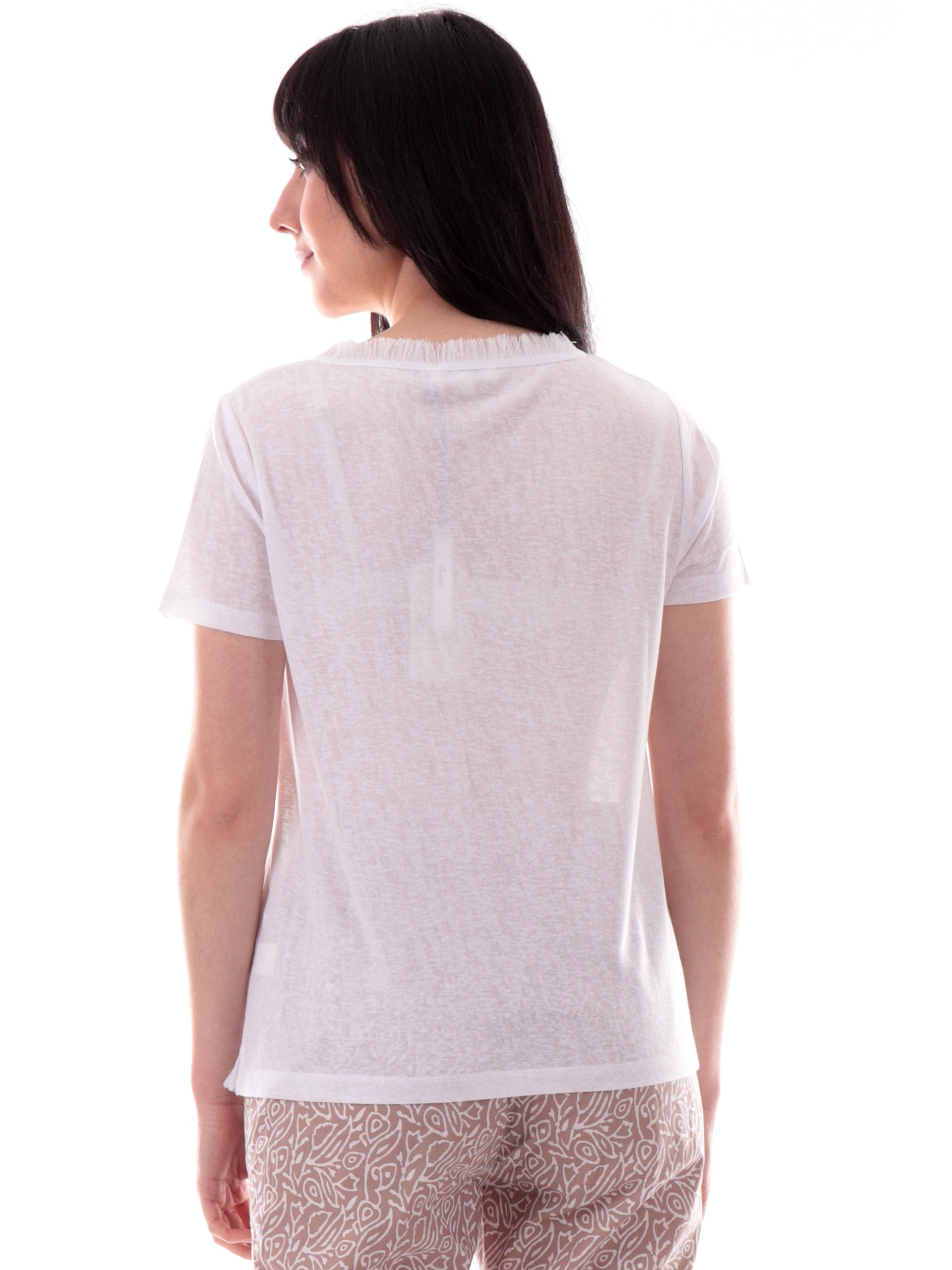 T-shirt lino Anis scollo a V bianca da donna con inserti sfrangiati 251C1466