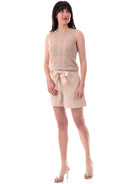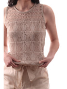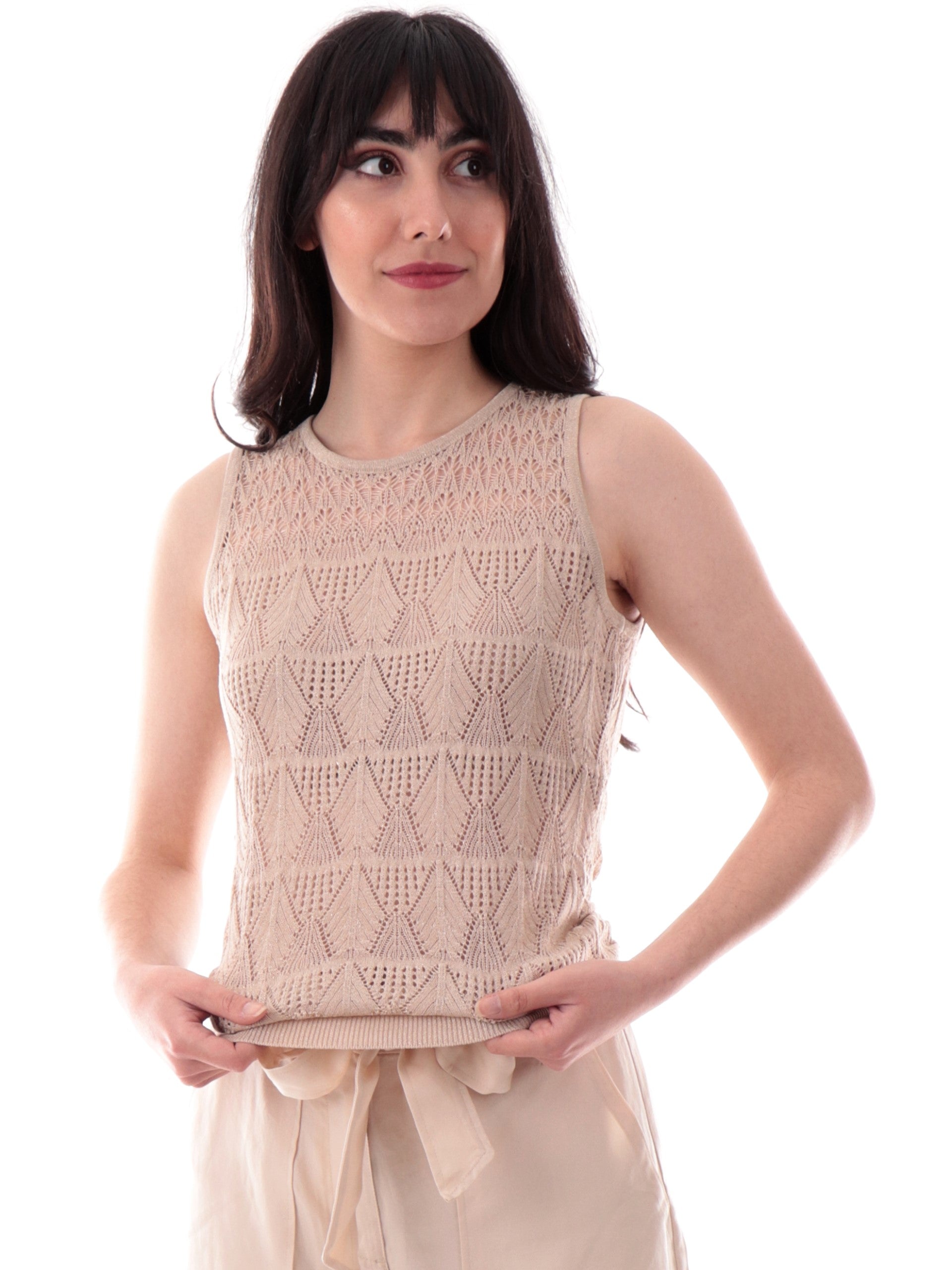 Maglia Yes Zee beige e traforata . Questa maglia Yes Zee in filo beige oro modello smanicato è caratterizzata da tessuto morbido e raffinato . utilizza questa maglia come sottogiacca donna elegante ocome canotta Yes Zee.